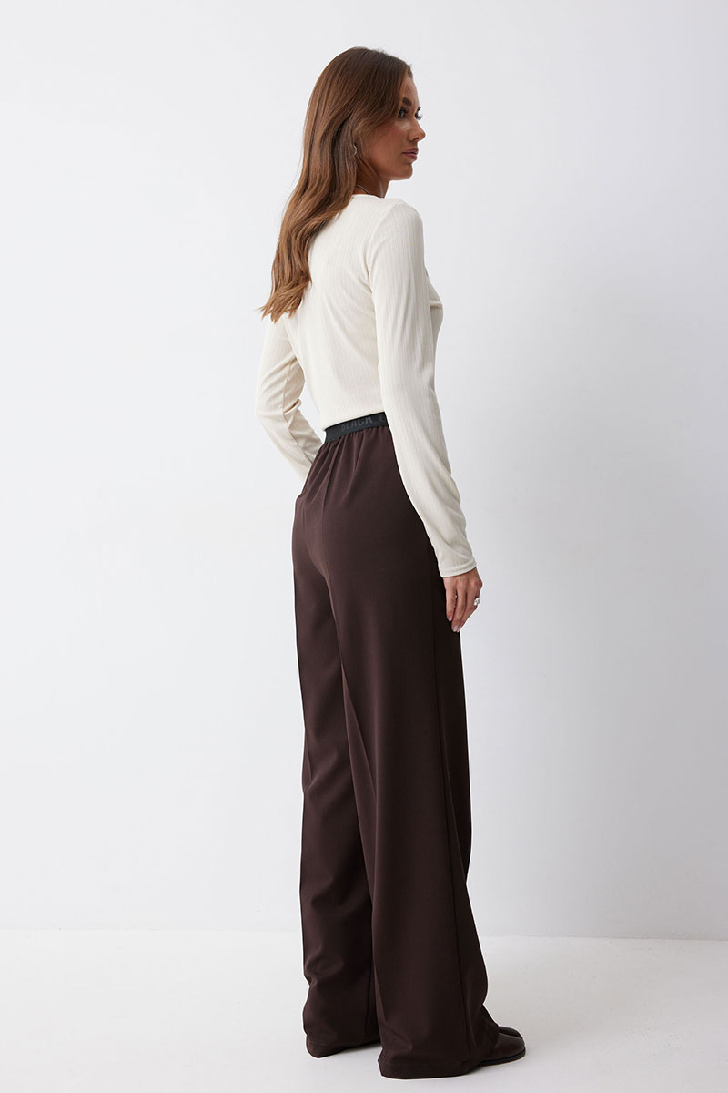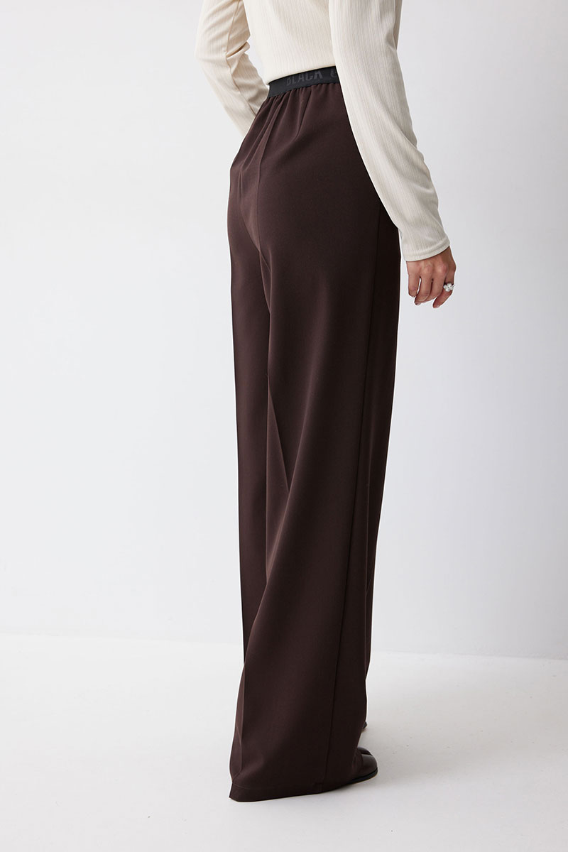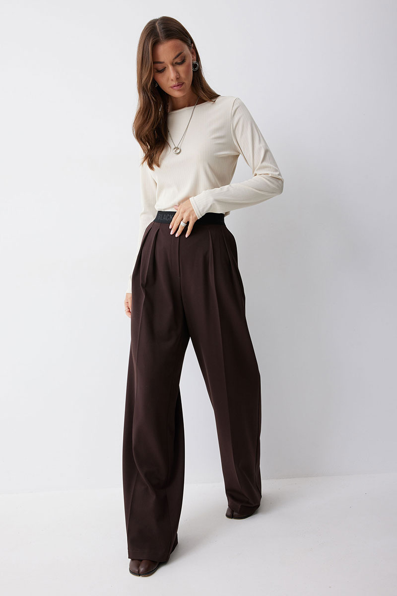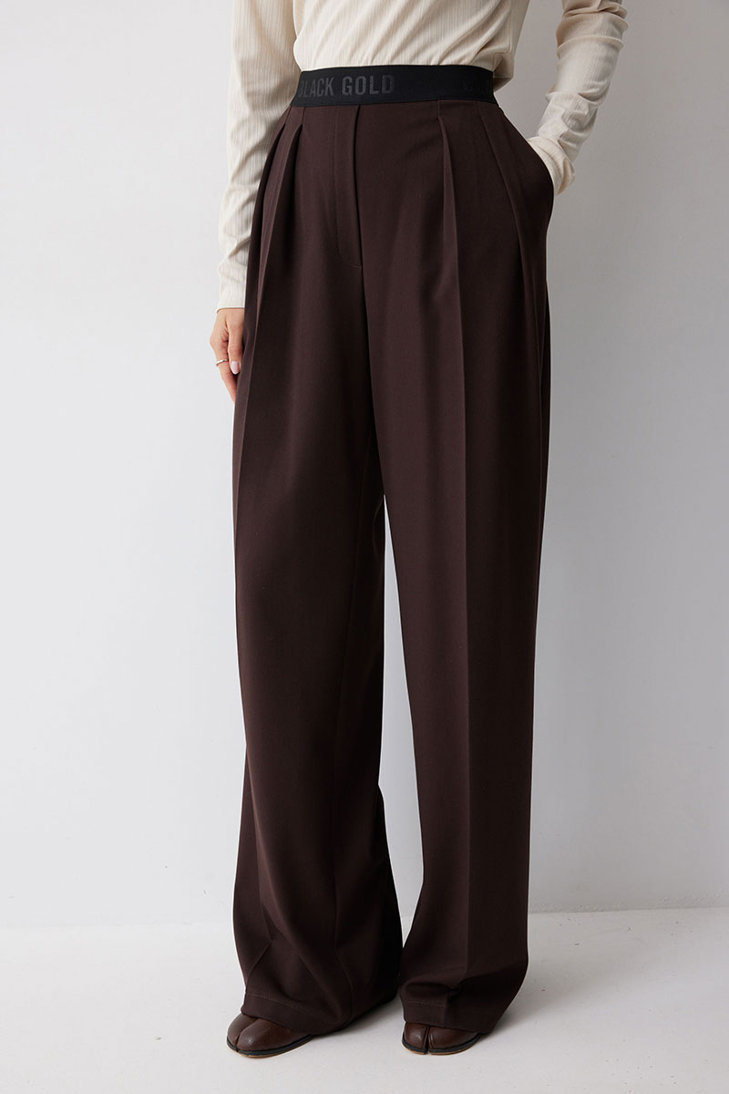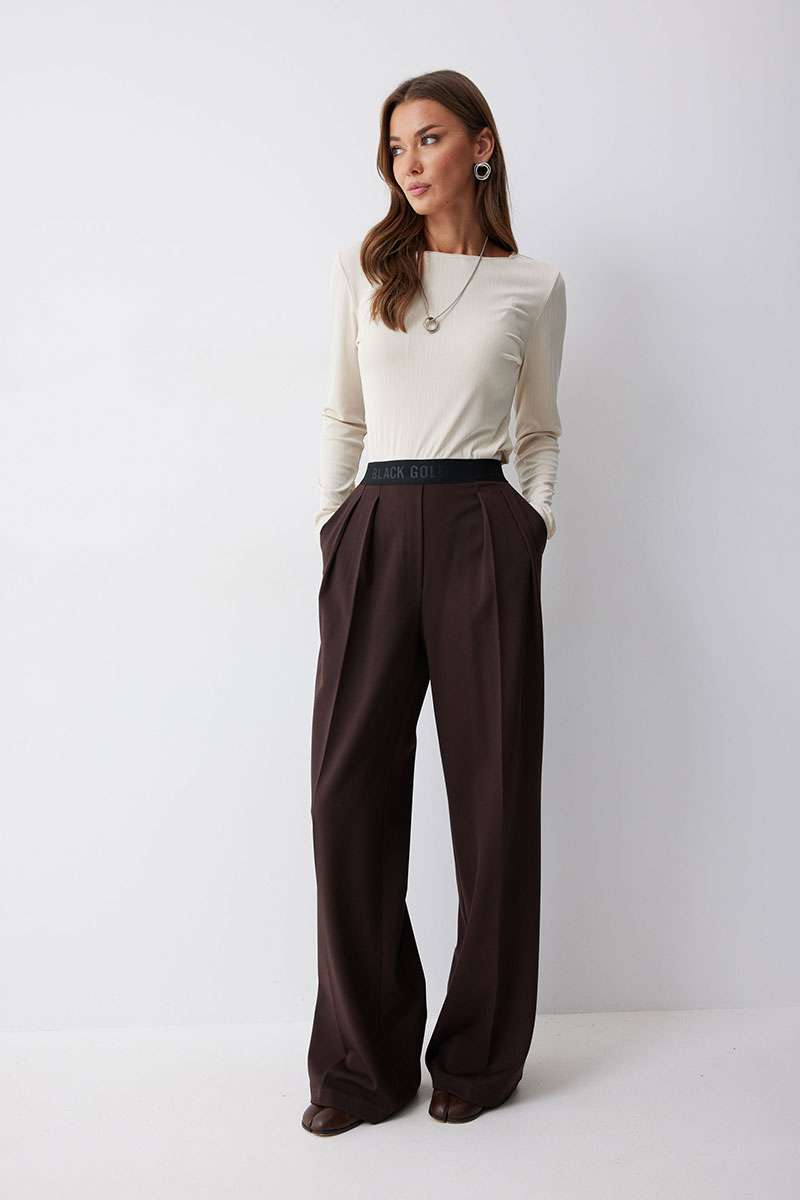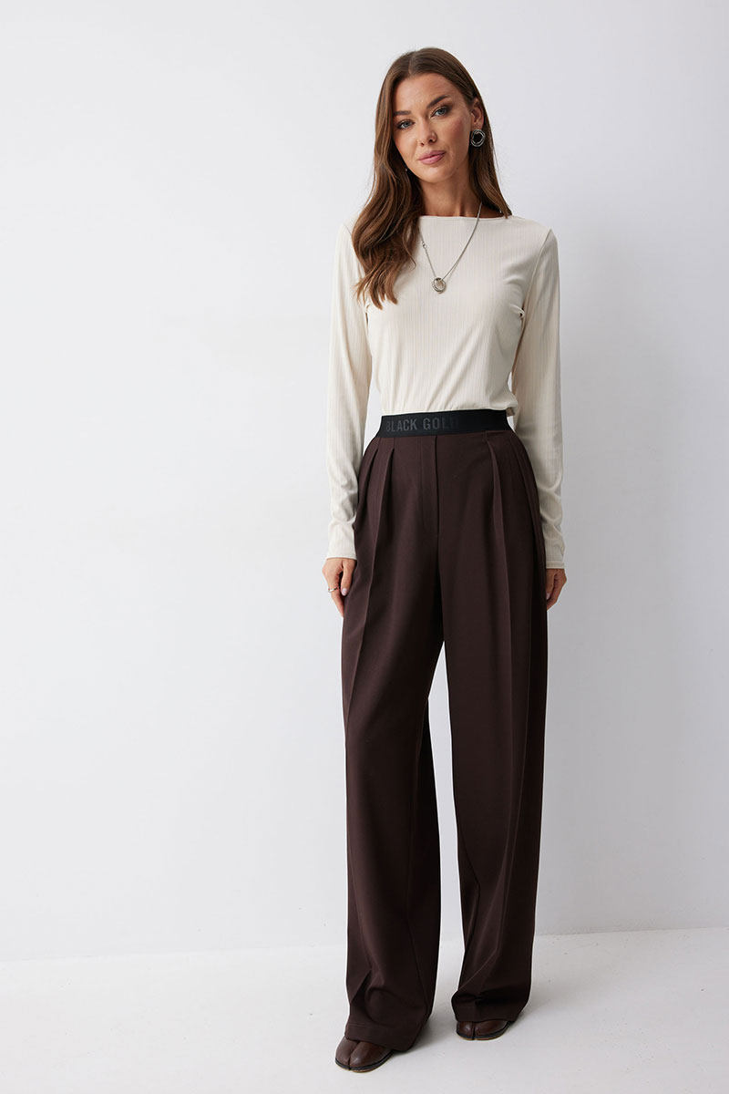 Брюки прямого силуэта из костюмной ткани. По верху брюк декоративная резинка. На передних половинках карманы и декоративные складки. На задних половинках вытачки. Обращаем ваше внимание, что фурнитура может отличаться от фото.