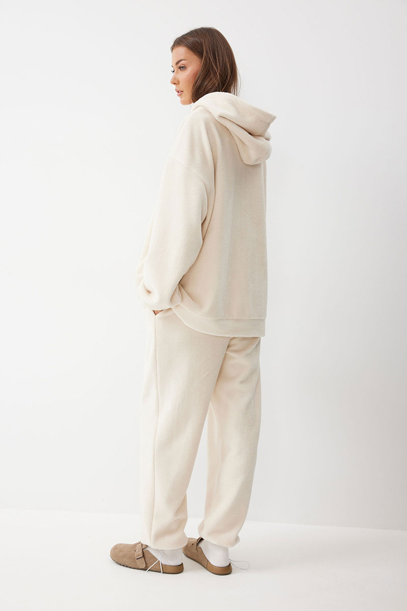 Брюки прямого силуэта из комфортного трикотажного полотна. По верху брюк притачной пояс на резинке. На передних половинках брюк обработаны карманы. Ширина брюк по низу регулируется за