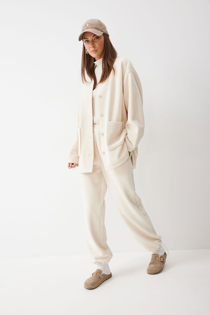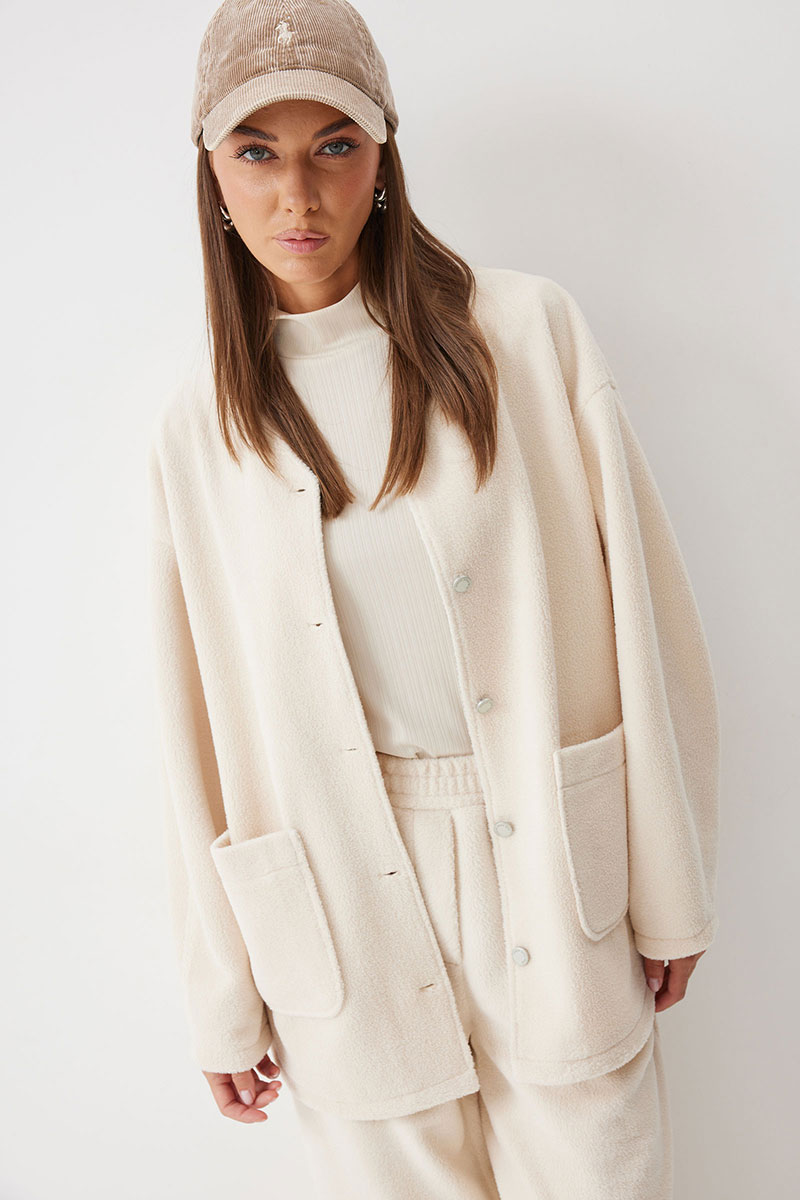 Жакет прямого силуэта с фигурным низом из трикотажного полотна. Горловина округлая, по центру застежка на кнопки. Рукав со спущенной линией плеча. По переду накладные карманы. Жакет