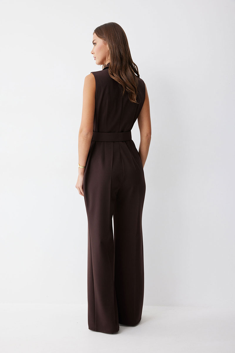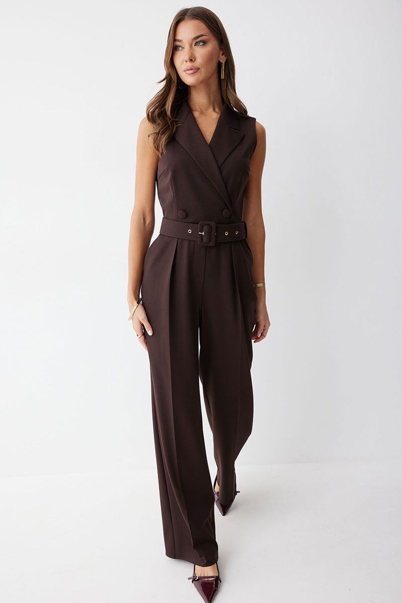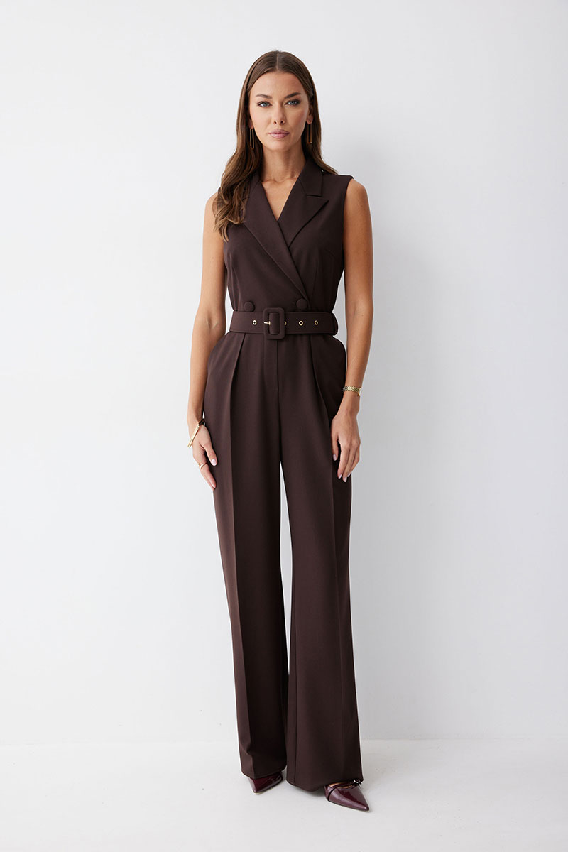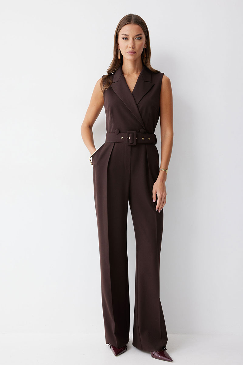 Комбинезон полуприлегающего силуэта из костюмной ткани. Воротник пиджачного типа. Комбинезон отрезной по линии талии, верхняя часть комбинезона на запах. На спинке в среднем шве застежка на потайную молнию. В боковых швах карманы. По переду на лифе талиевые и нагрудные вытачки, на брюках декоративные складки. На спинке лифа талиевые вытачки. В комплект входит ремень. Обращаем ваше внимание, что фурнитура может отличаться от фото.
