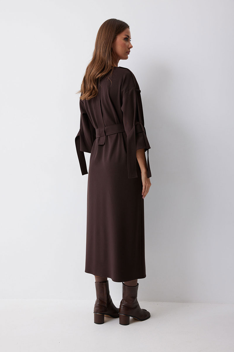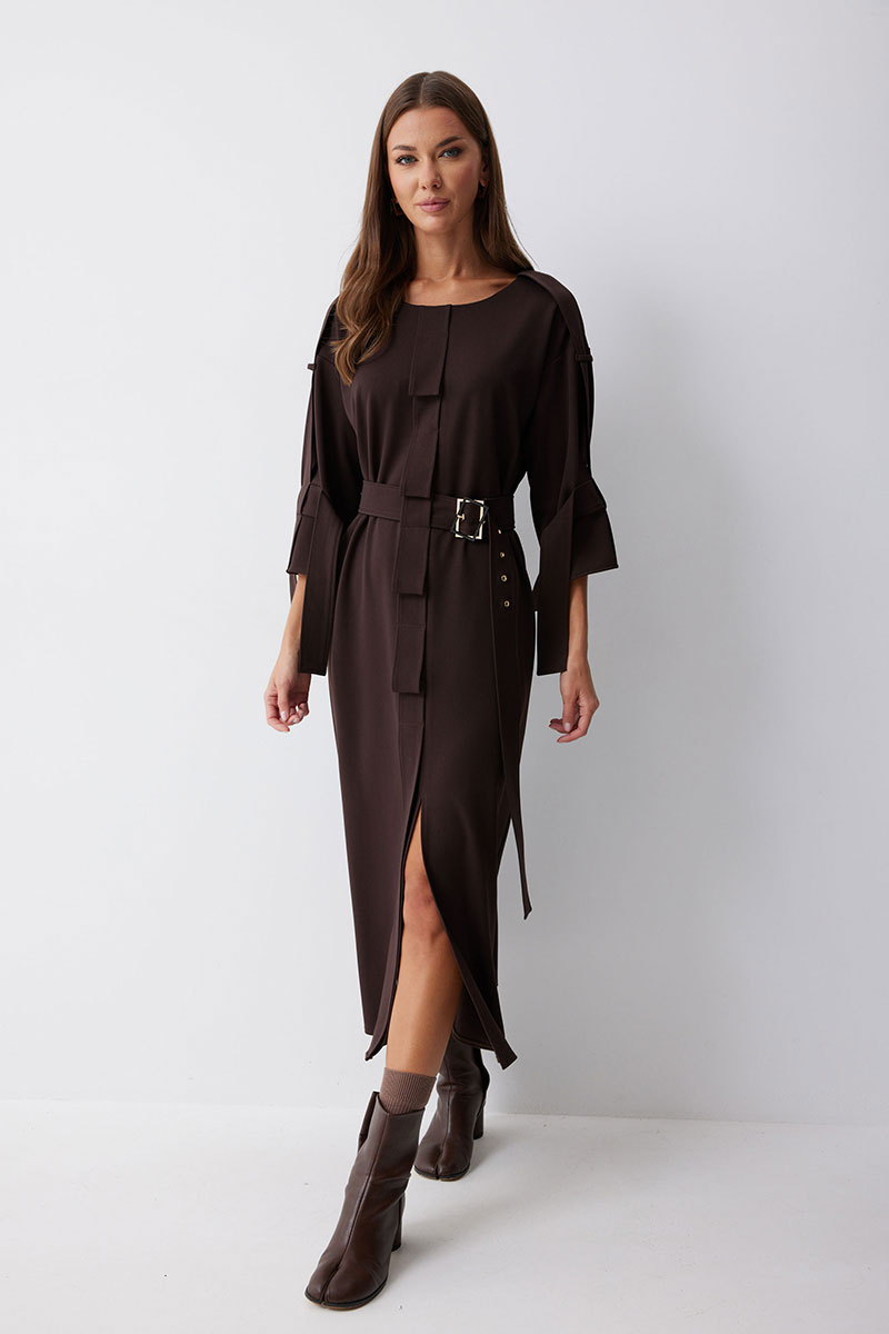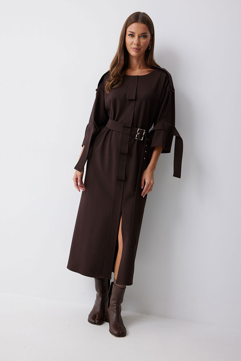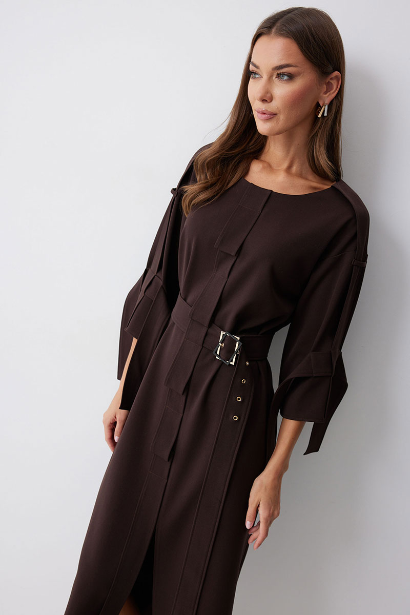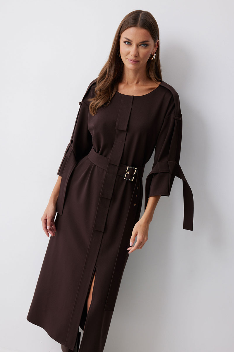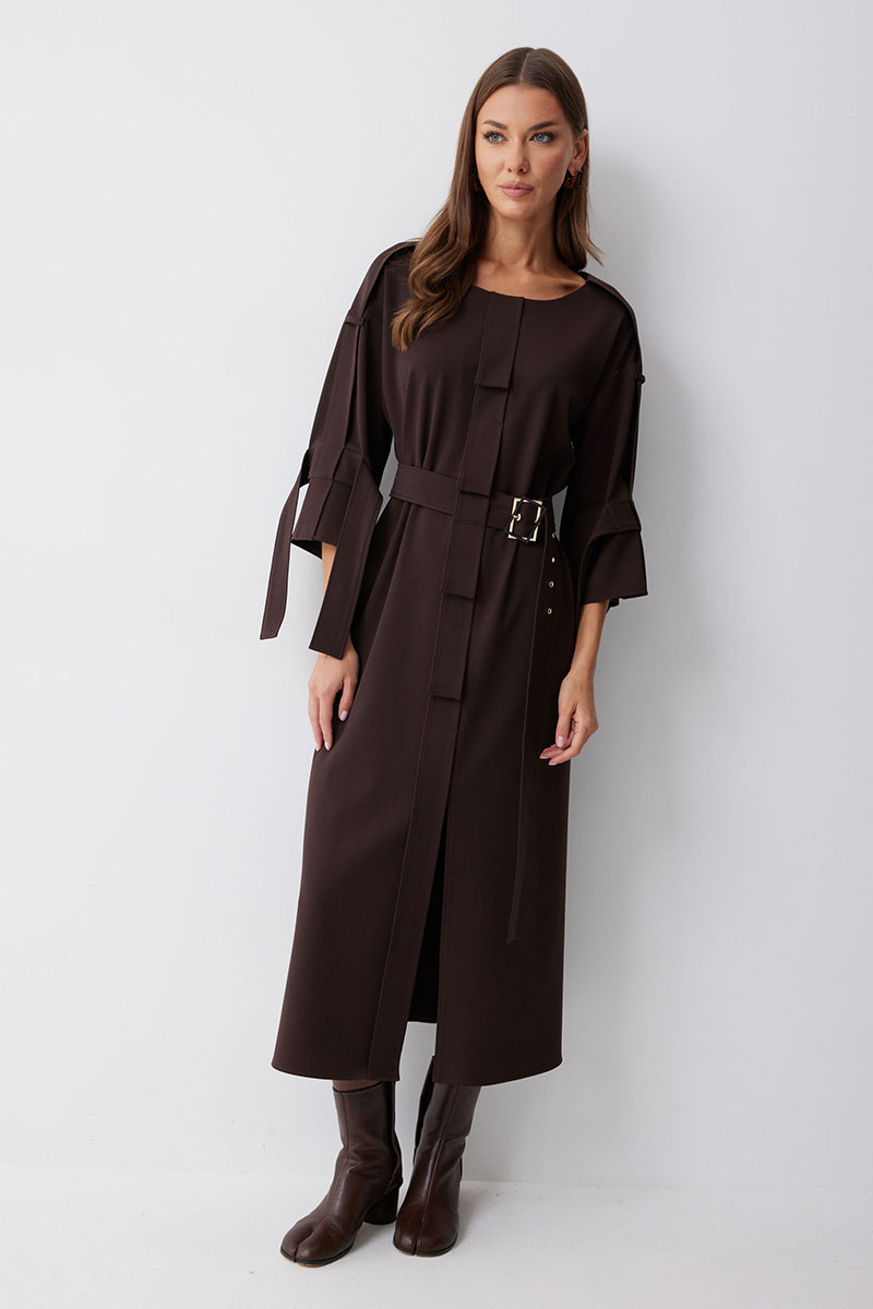Платье прямого силуэта из костюмной ткани. Горловина округлая. Рукав со спущенной линией плеча длиной 7/8. По переду и спинке по центру декоративный элемент. В комплект входит съемный ремень. Обращаем ваше внимание, что фурнитура может отличаться от фото.