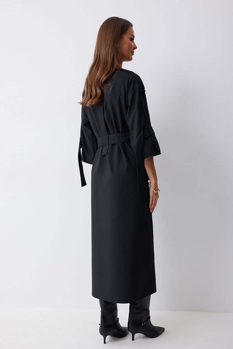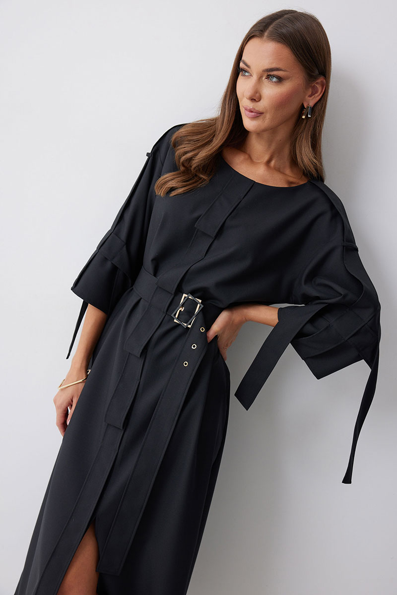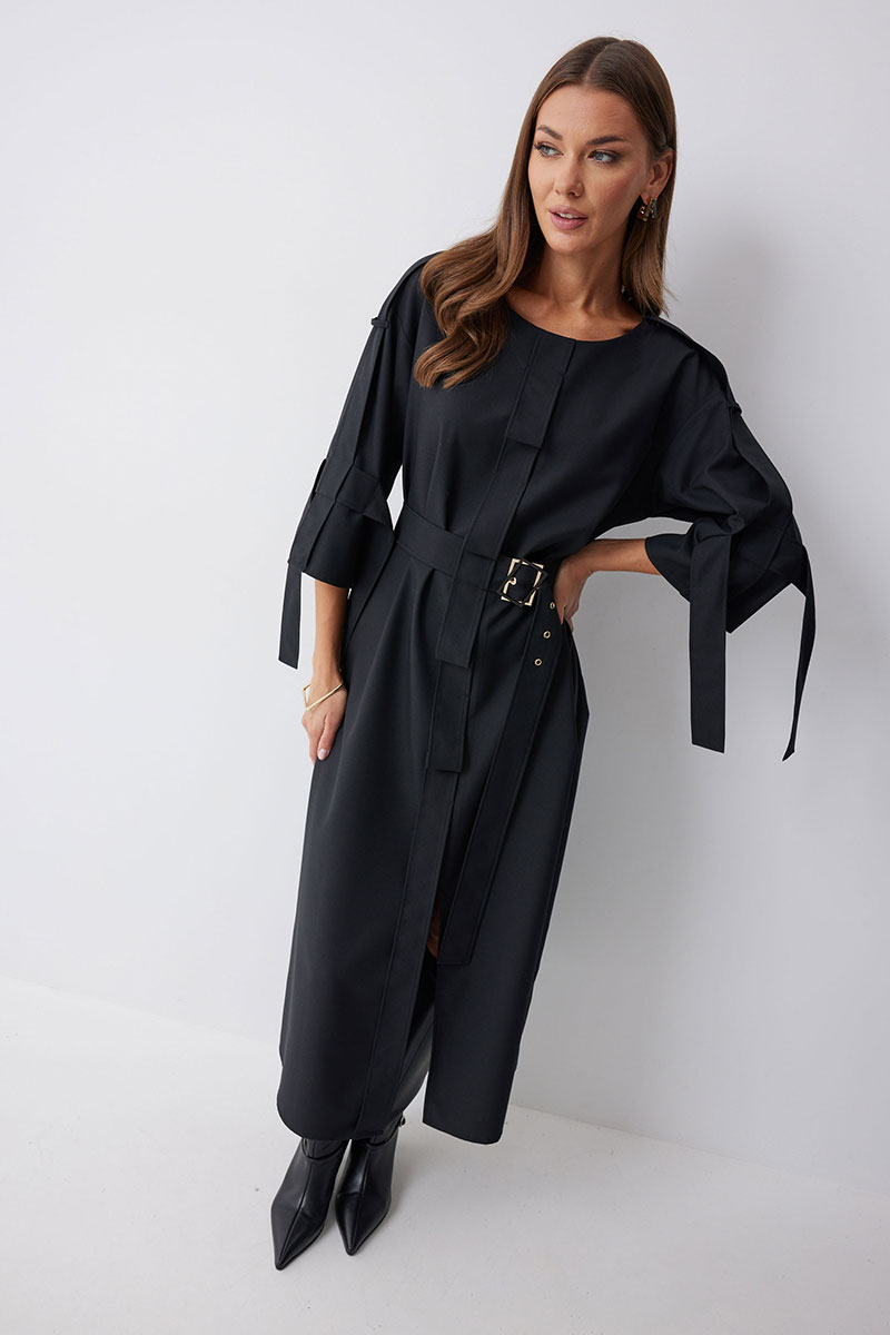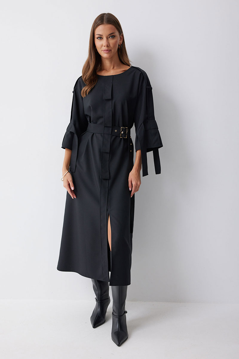 Платье прямого силуэта из костюмной ткани. Горловина округлая. Рукав со спущенной линией плеча длиной 7/8. По переду и спинке по центру декоративный элемент. В комплект входит съемный ремень. Обращаем ваше внимание, что фурнитура может отличаться от фото.