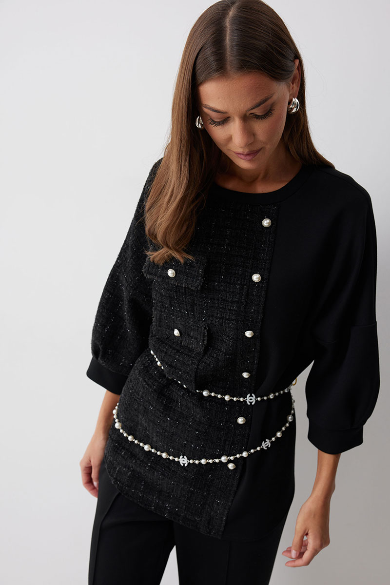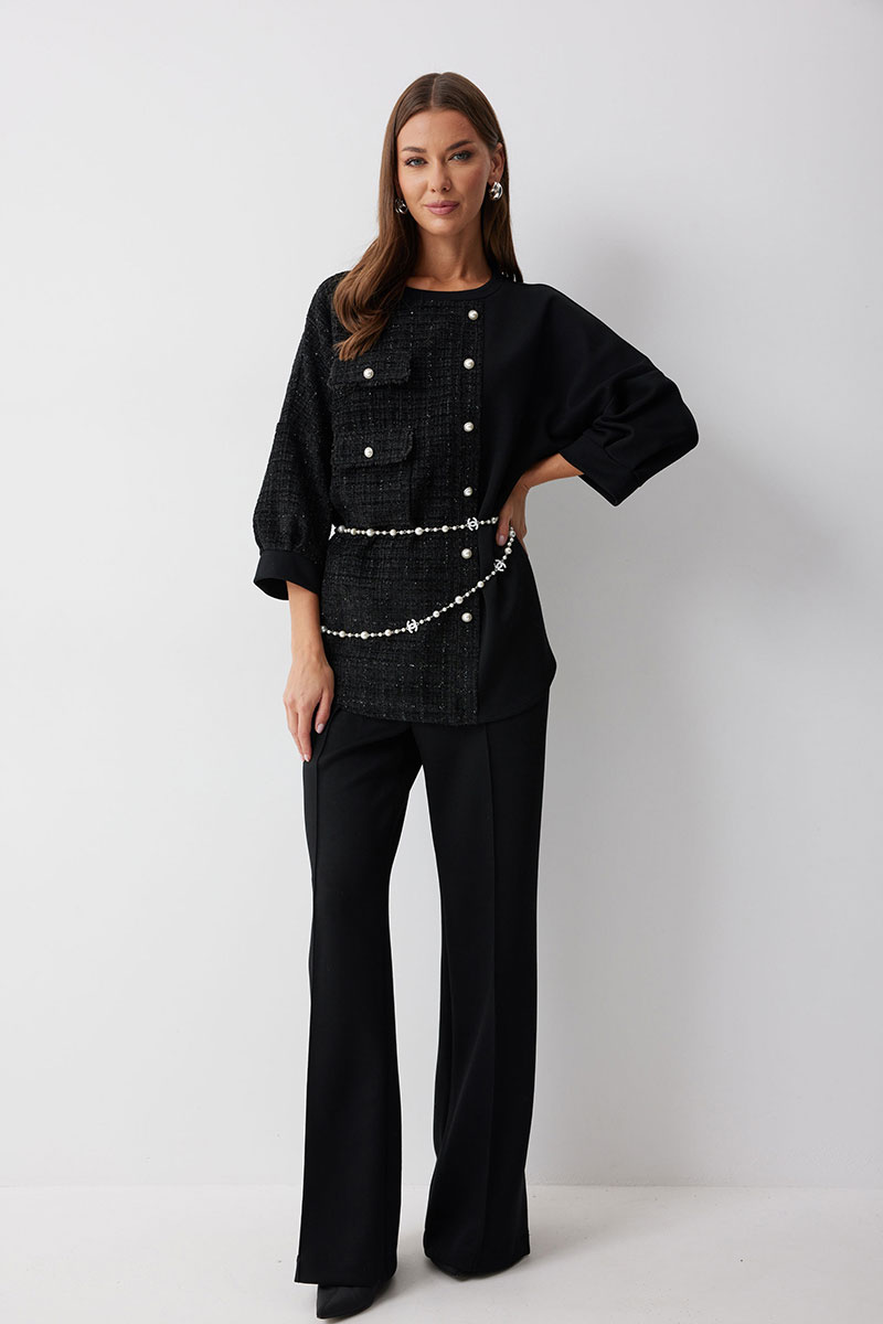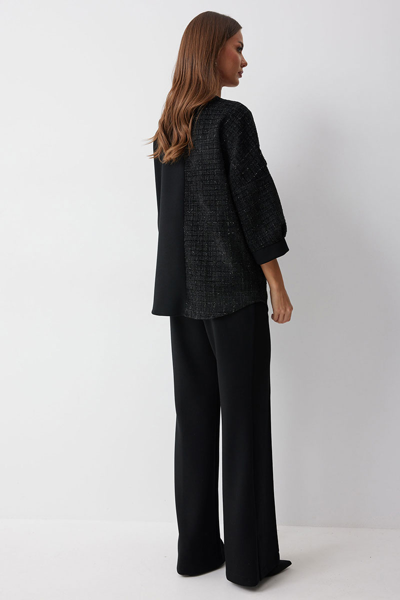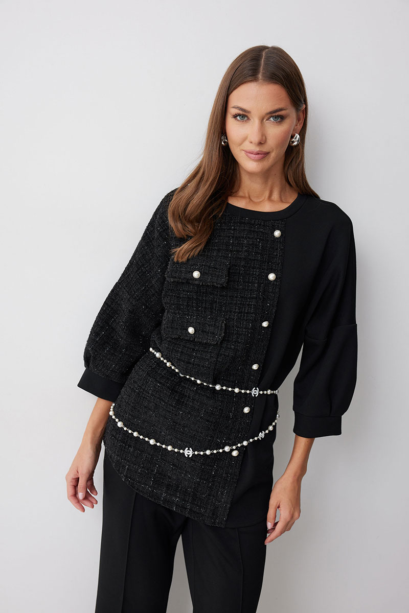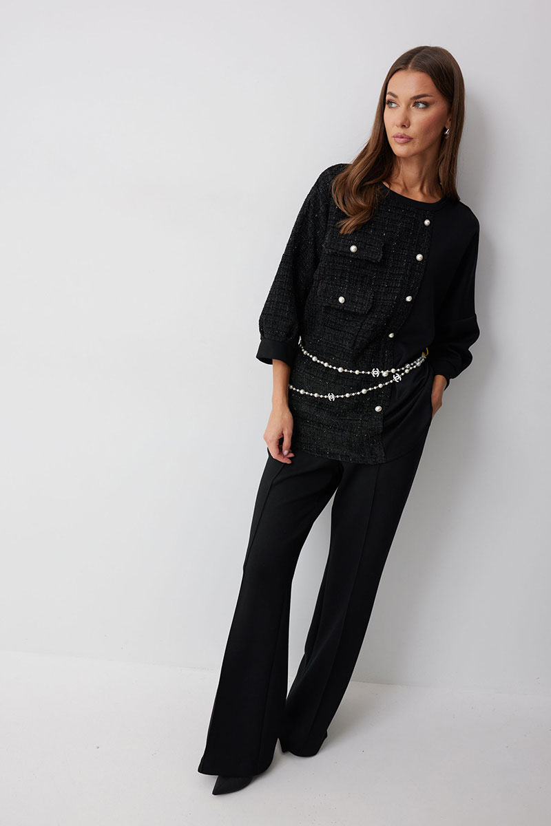 Джемпер полуприлегающего силуэта, скомбинированный из трикотажного полотна и ткани. Рукав втачной, длиной до локтя, на манжете из трикотажного полотна. Горловина округлая. Низ – фигурный. По переду декоративная планка и два кармана: накладной с клапаном функциональный, и декоративный нефункциональный клапан.