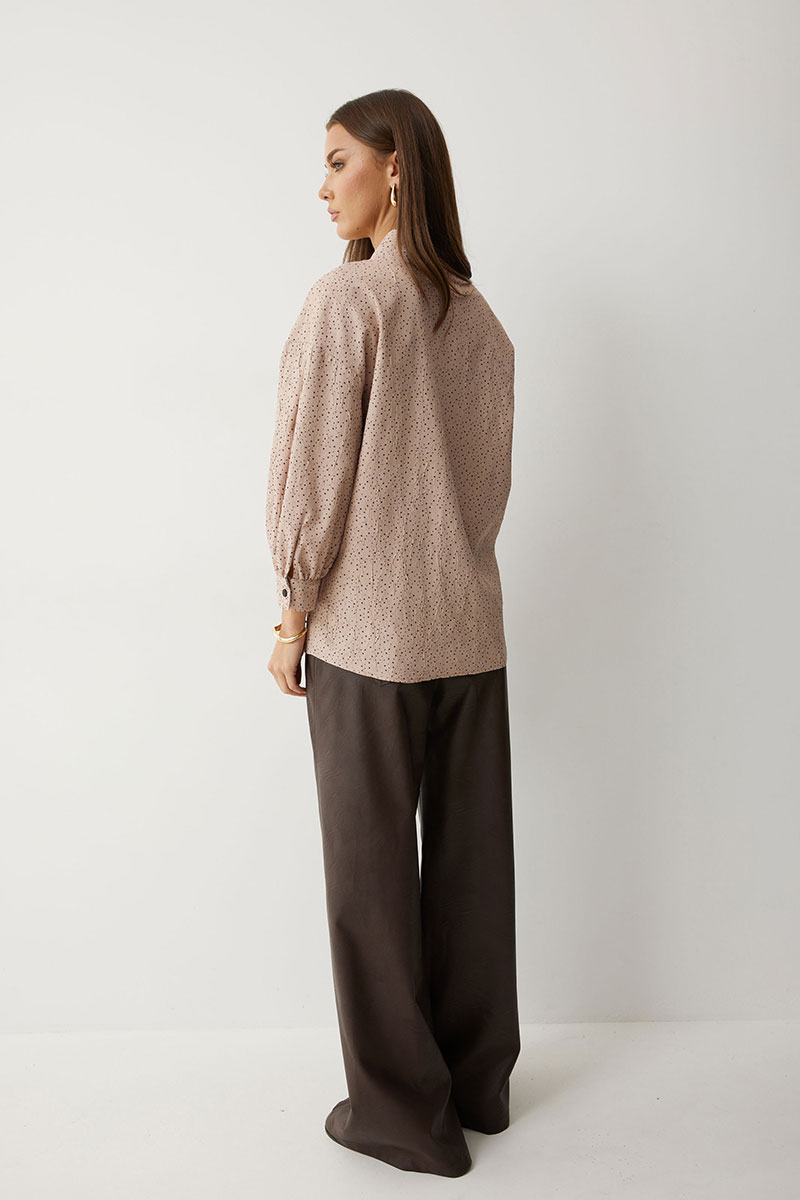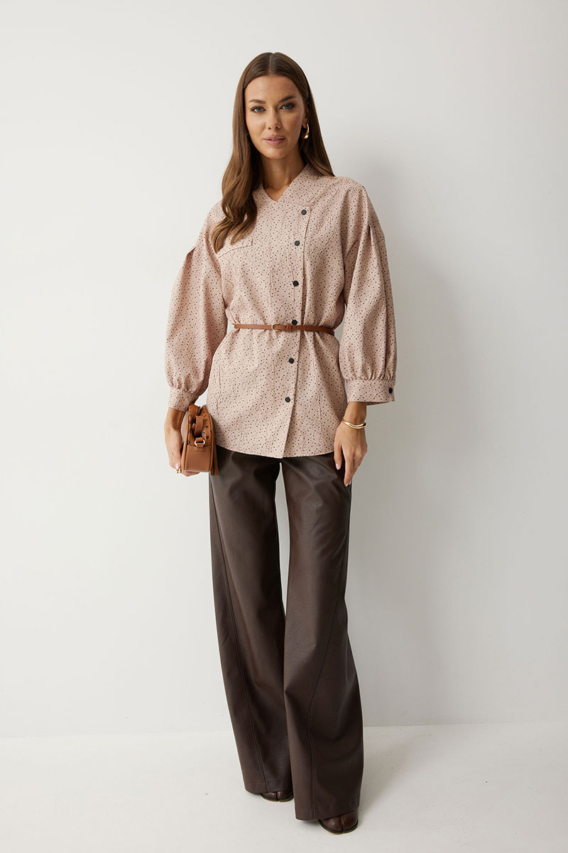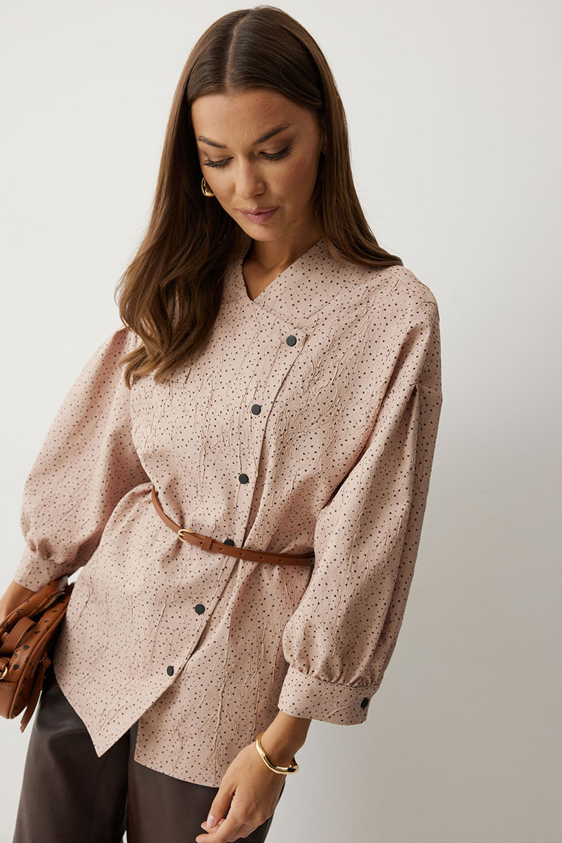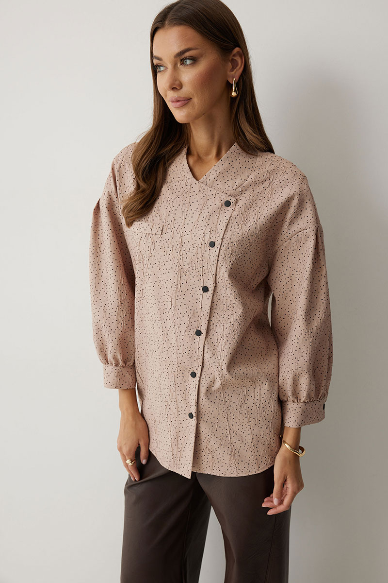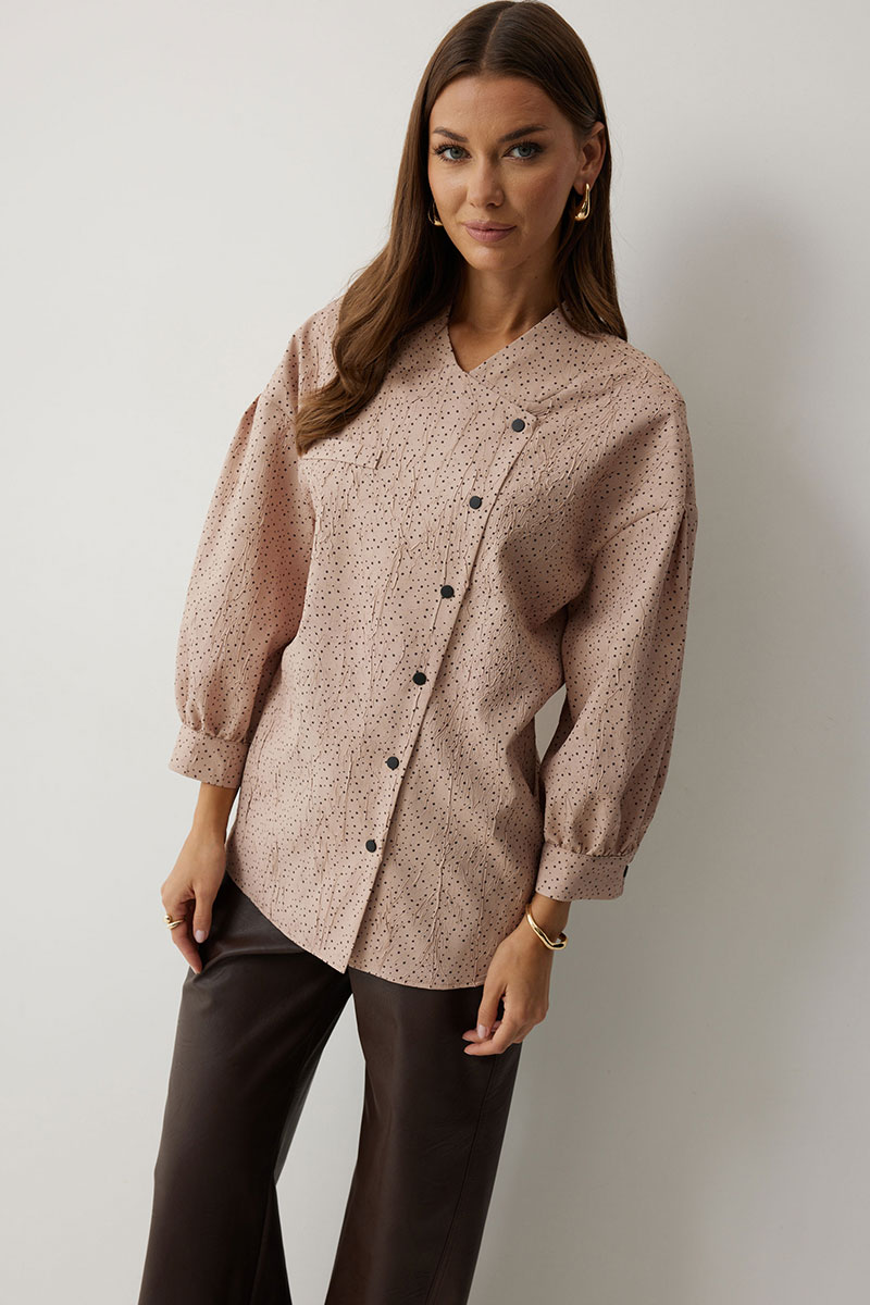 Ассиметричная блузка прямого силуэта. Низ фигурный. Рукав, спущенный с встречной складкой по центру. По низу манжета с застежкой на кнопку. По переду декоративная настрочная листочка. Ассиметричная двубортная застежка на кнопки. Воротник-стойка. Обращаем ваше внимание, что фурнитура может незначительно отличаться от фото.
