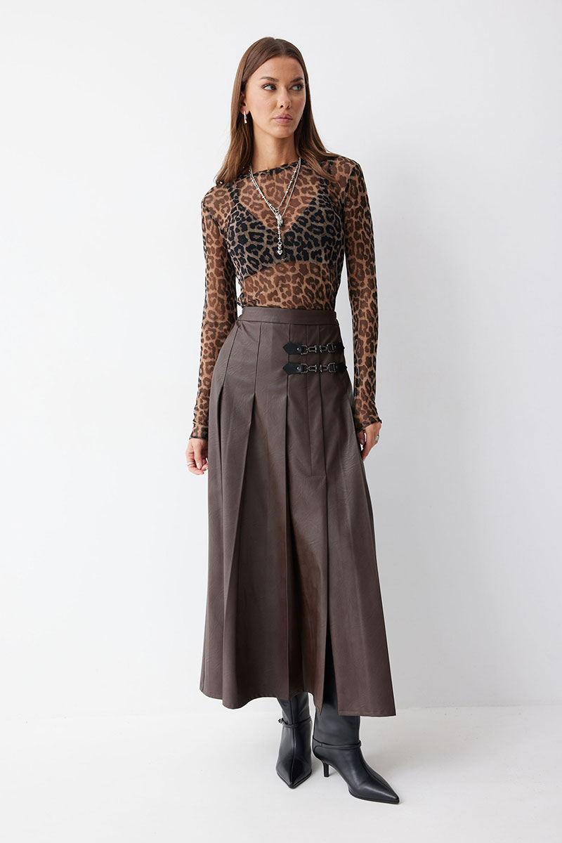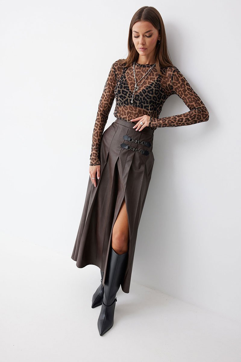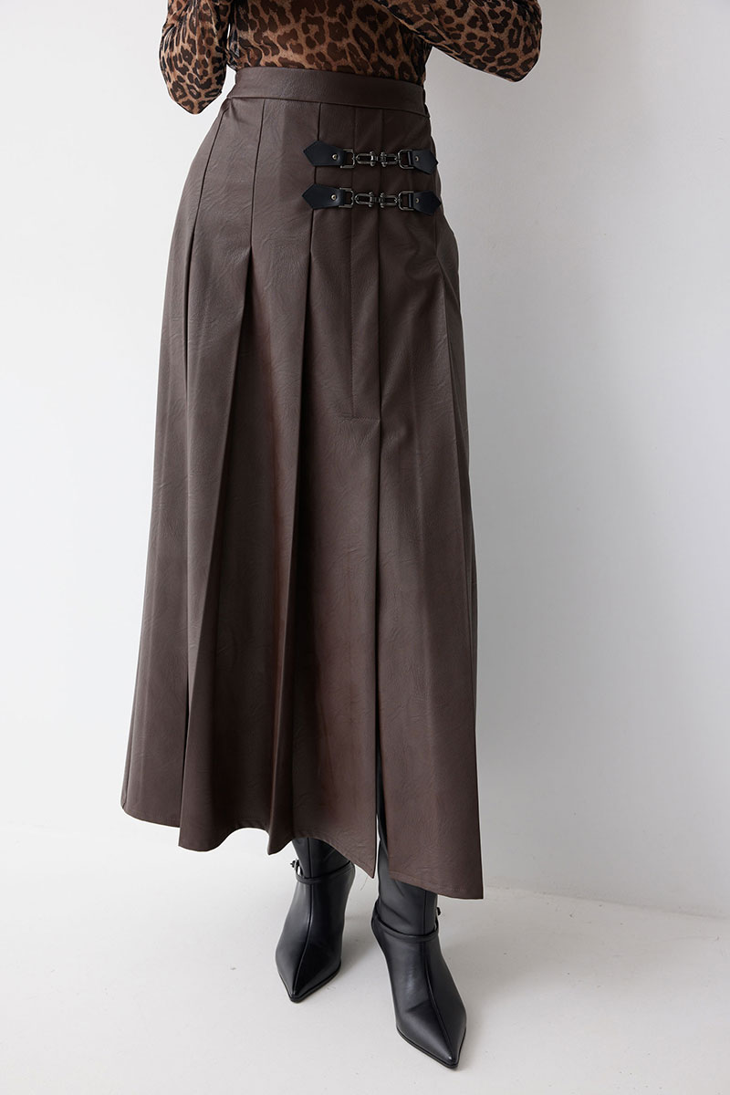 Юбка А-силуэта из экокожи на хлопковой основе. По верху юбки притачной пояс со шлевками для ремня. Переднее полотнище юбки со складками и шлицей и декоративной фурнитурой. На задних половинках расположены талиевые вытачки. На спинке в центральном шве потайная молния. По бокам в поясе вставлена резинка от складки до вытачки.