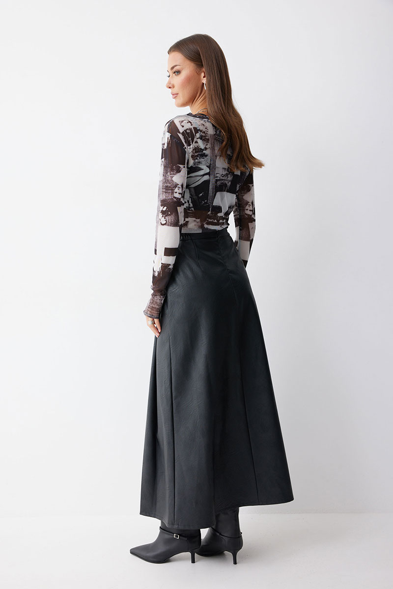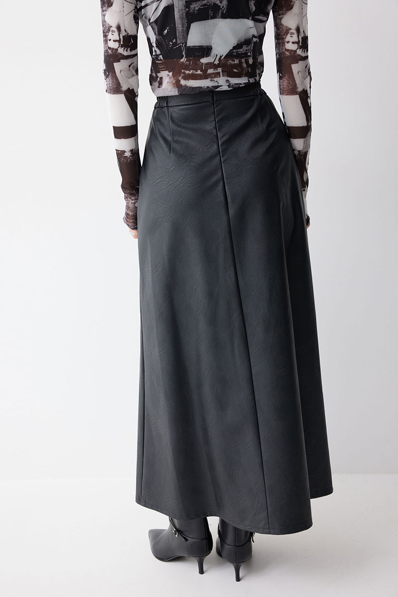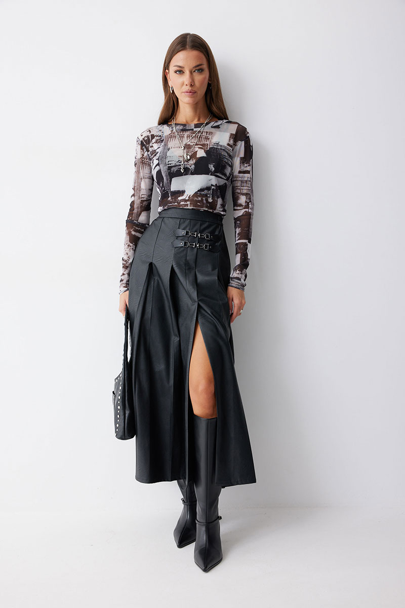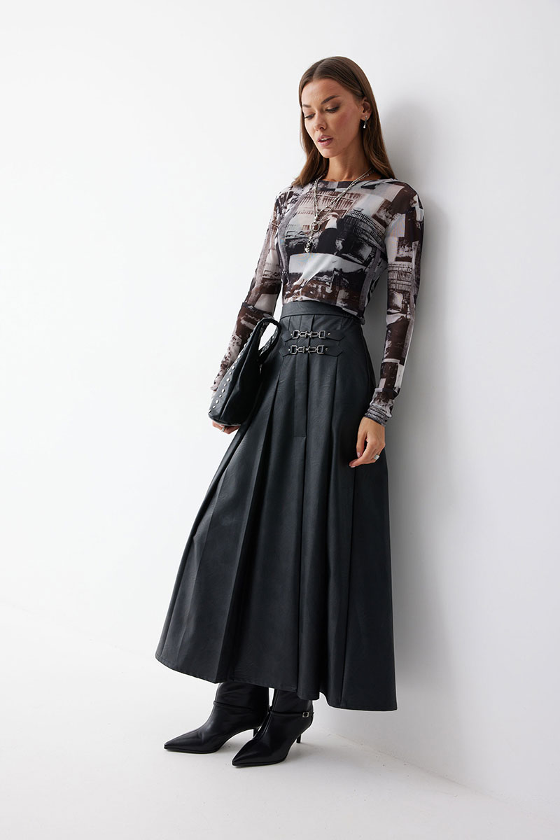Юбка А-силуэта из экокожи на хлопковой основе. По верху юбки притачной пояс со шлевками для ремня. Переднее полотнище юбки со складками и шлицей и декоративной фурнитурой. На задних половинках расположены талиевые вытачки. На спинке в центральном шве потайная молния. По бокам в поясе вставлена резинка от складки до вытачки.
