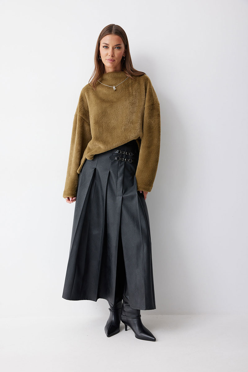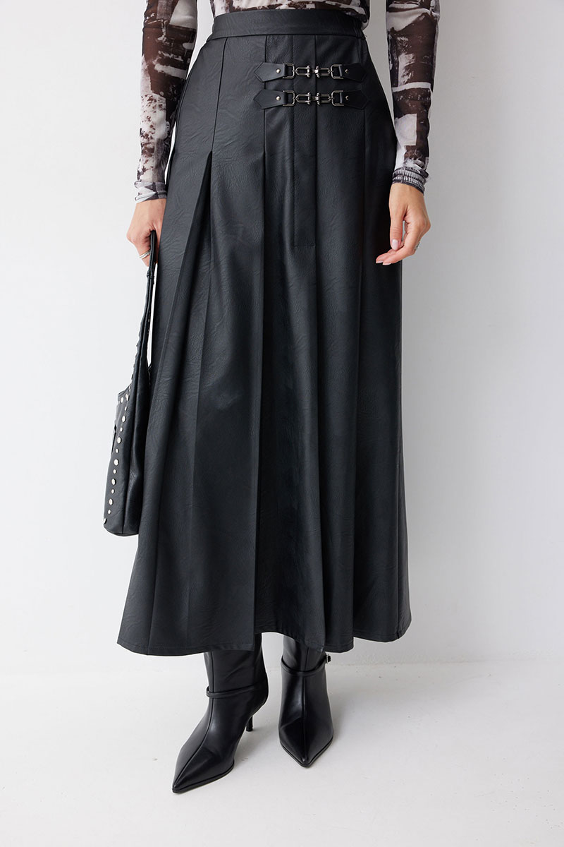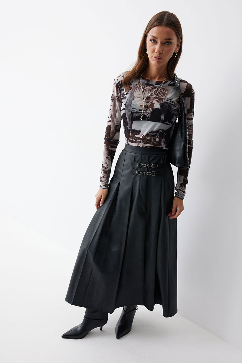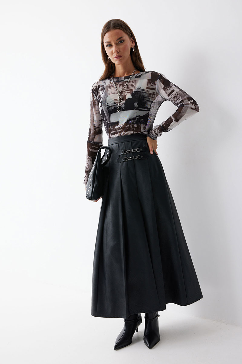 Юбка А-силуэта из экокожи на хлопковой основе. По верху юбки притачной пояс со шлевками для ремня. Переднее полотнище юбки со складками и шлицей и декоративной фурнитурой. На задних половинках расположены талиевые вытачки. На спинке в центральном шве потайная молния. По бокам в поясе вставлена резинка от складки до вытачки.