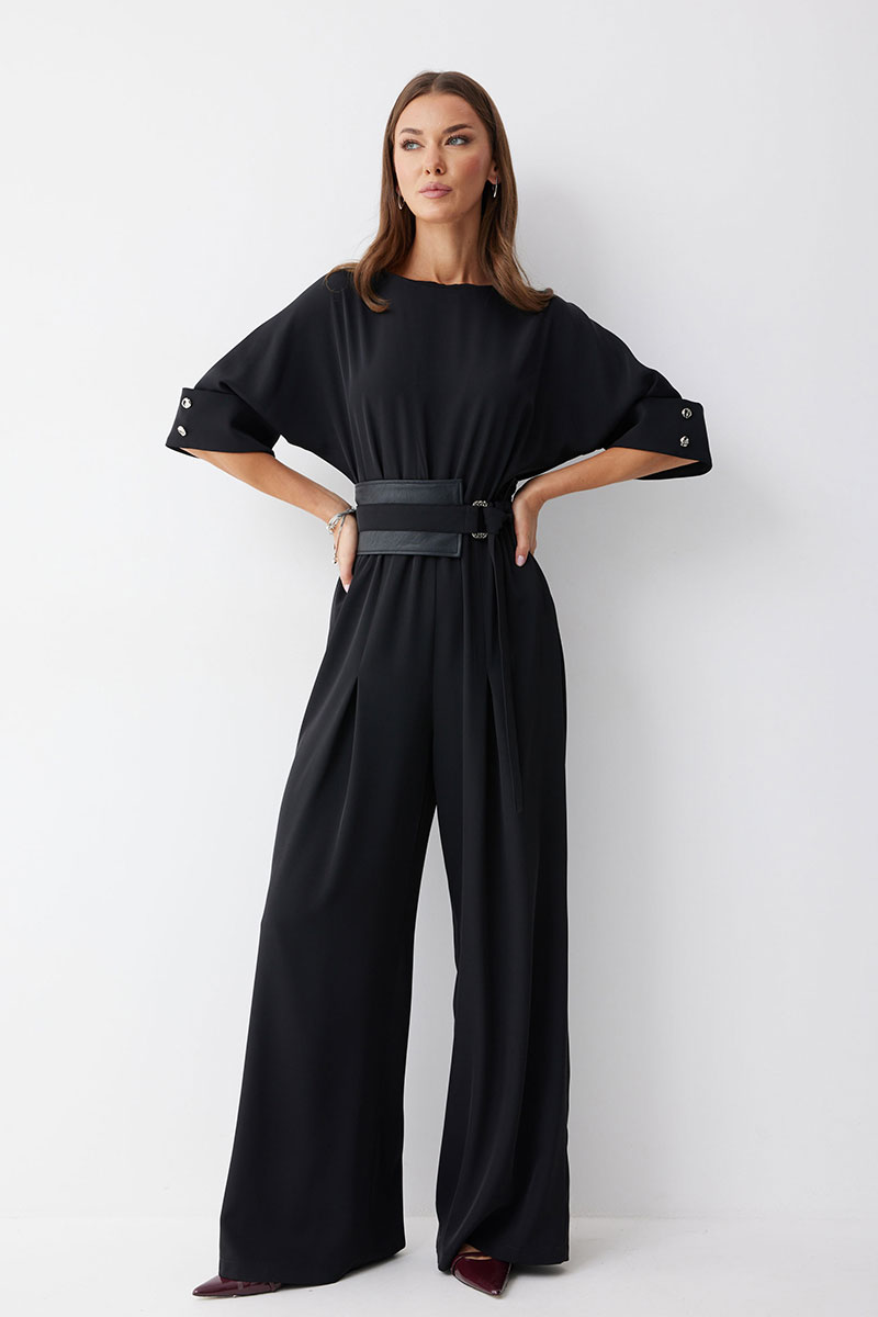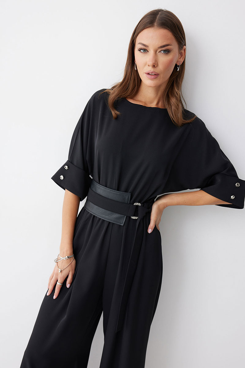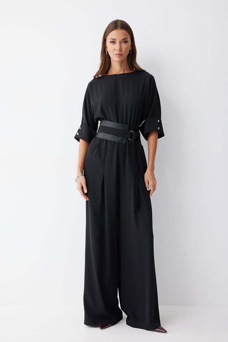 Комбинезон полуприлегающего силуэта, из струящейся ткани. Брюки прямого силуэта, со складками по переду. Комбинезон отрезной, по линии талии на резинке. Рукав цельнокроеный на манжете, длиной до локтя. Горловина округлая. В комплект входит пояс скомбинированный из экокожи и основной ткани. Обращаем ваше внимание, что фурнитура может незначительно отличаться от фото.