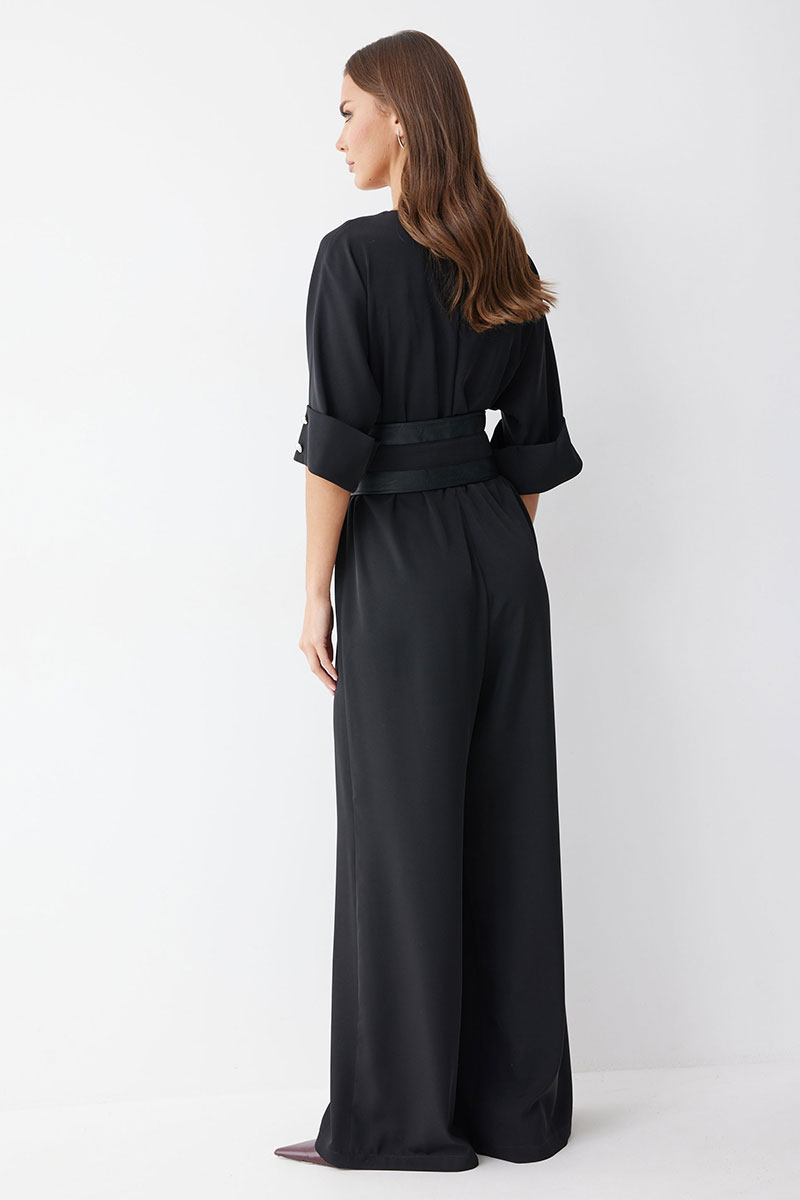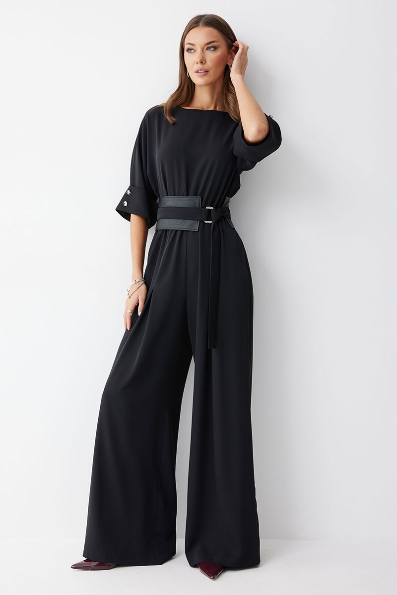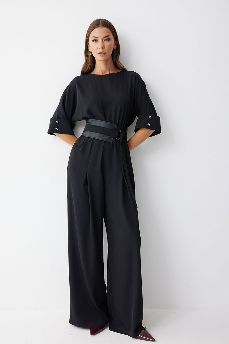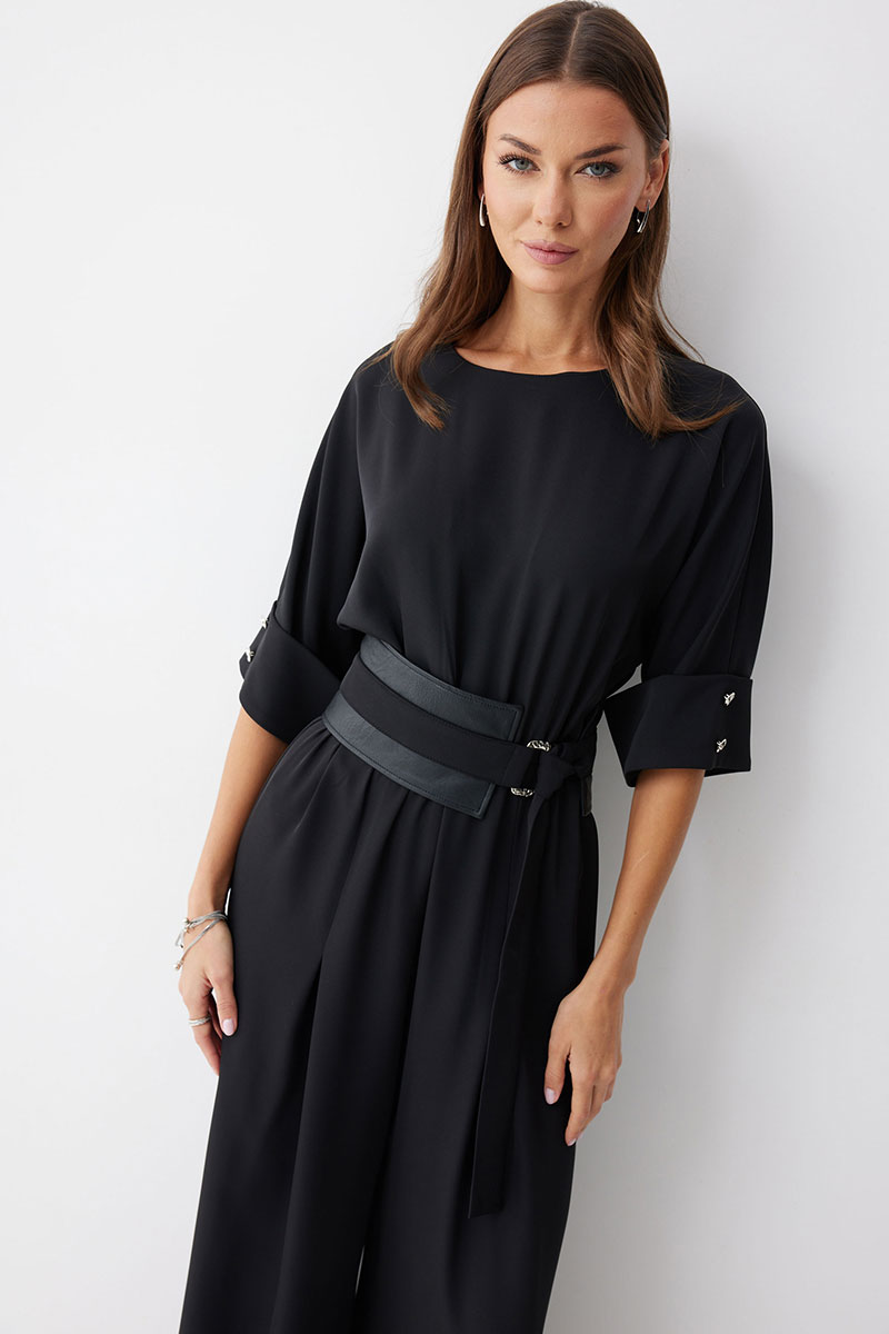 Комбинезон полуприлегающего силуэта, из струящейся ткани. Брюки прямого силуэта, со складками по переду. Комбинезон отрезной, по линии талии на резинке. Рукав цельнокроеный на манжете, длиной до локтя. Горловина округлая. В комплект входит пояс скомбинированный из экокожи и основной ткани. Обращаем ваше внимание, что фурнитура может незначительно отличаться от фото.