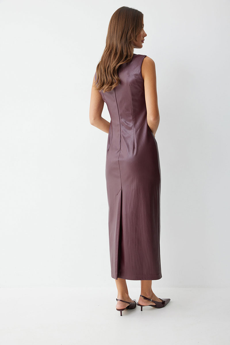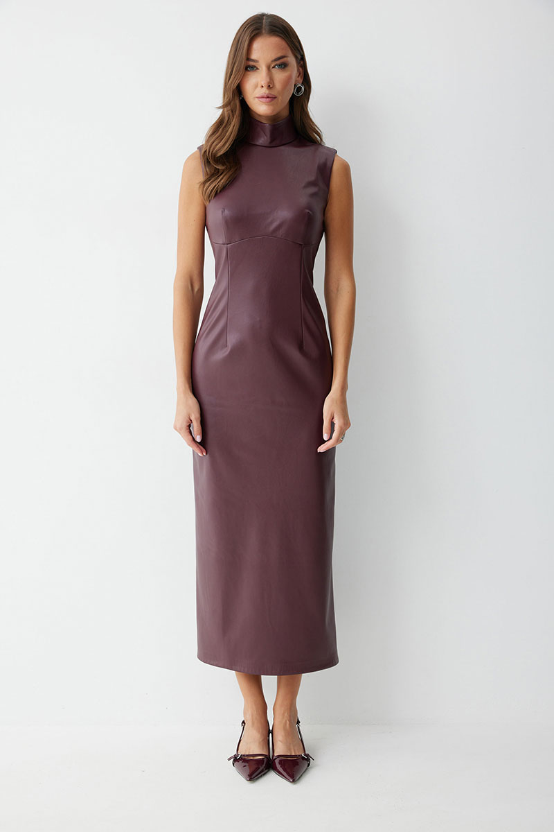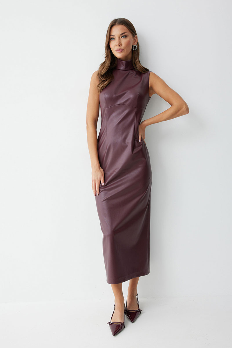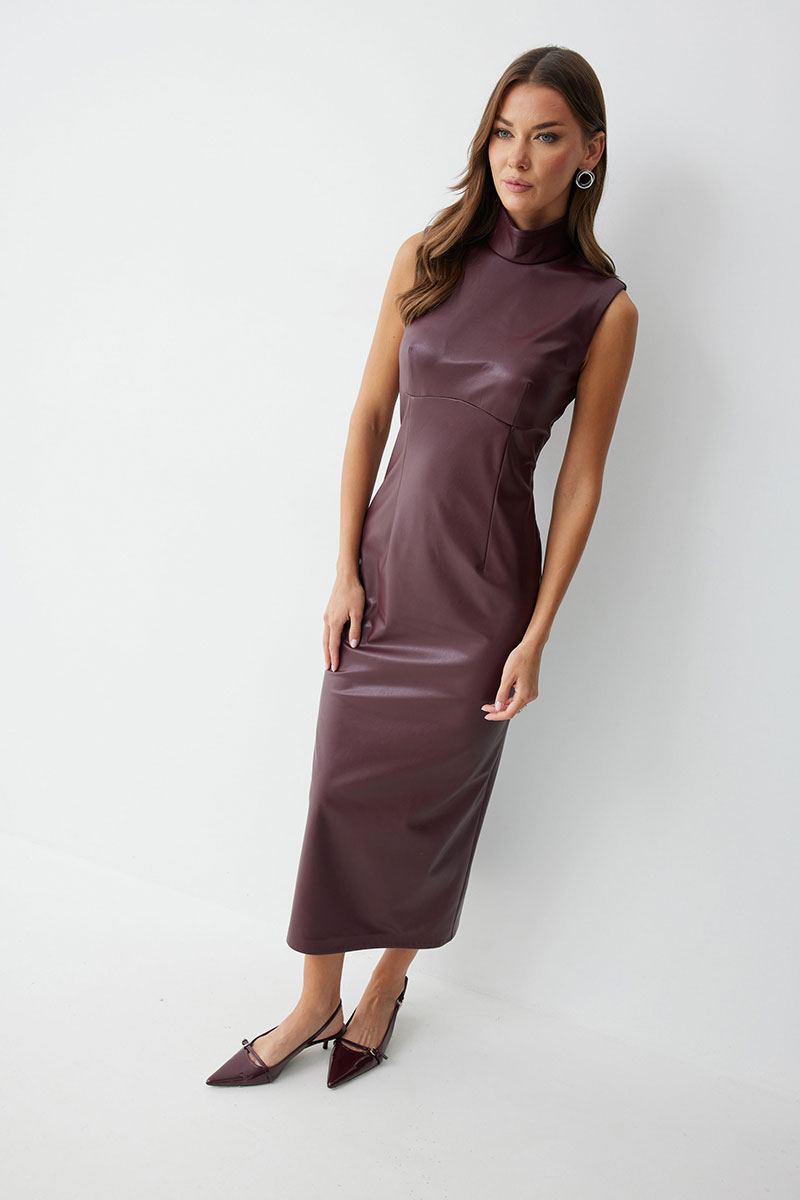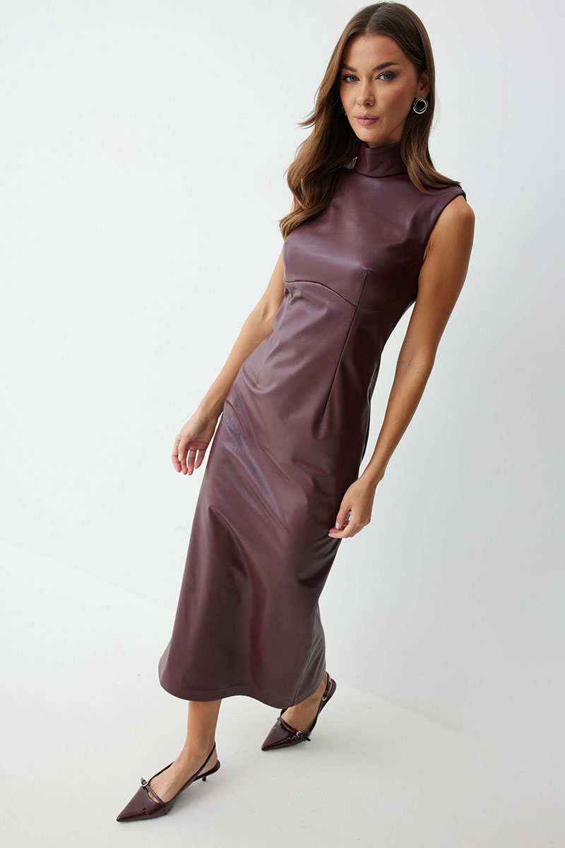 Платье прилегающего силуэта из экокожи длиной миди. Горловина-стойка. Спереди под грудью подрез, нагрудные и талиевые вытачки. На спинке в центральном шве потайная молния, по низу шлица. На спинке платья талиевые вытачки.