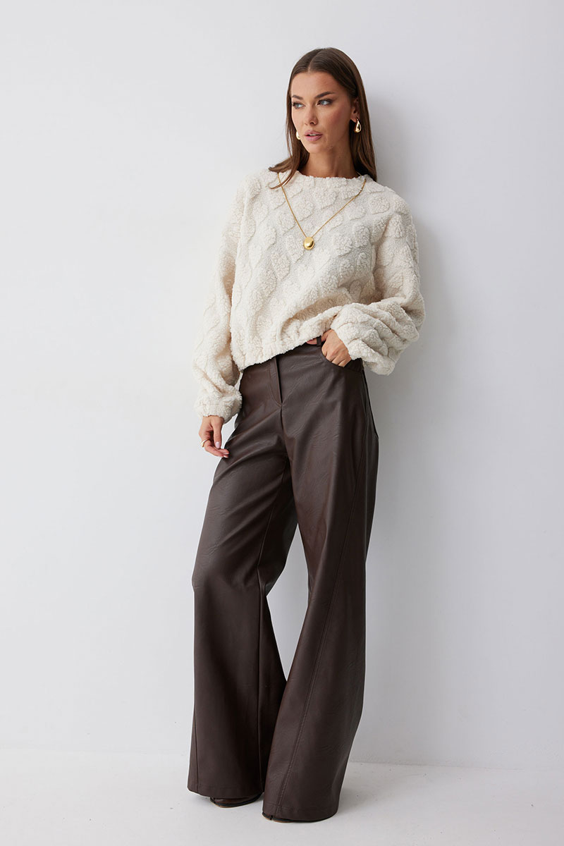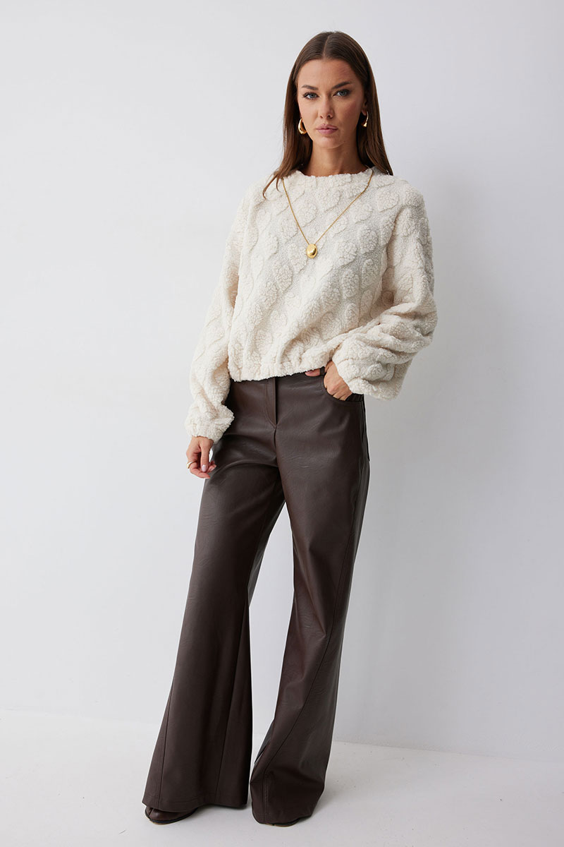 Укороченный джемпер прямого силуэта из трикотажного полотна. Горловина округлая. Рукав со спущенной линией плеча, по низу резинка. По низу джемпера резинка.