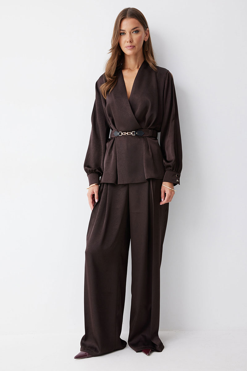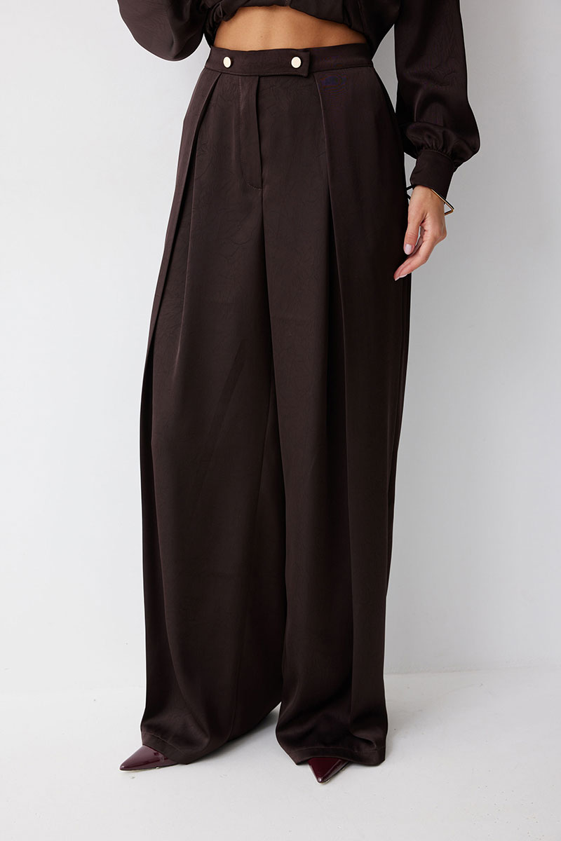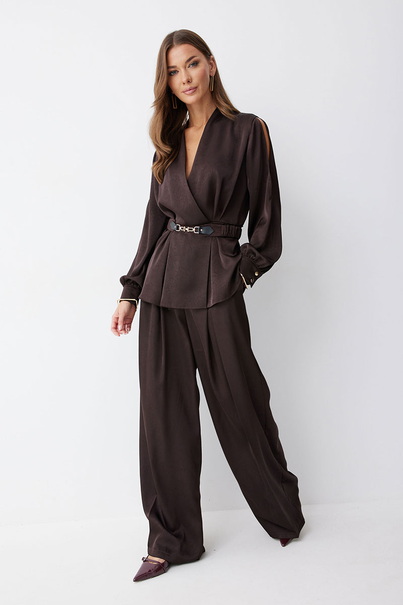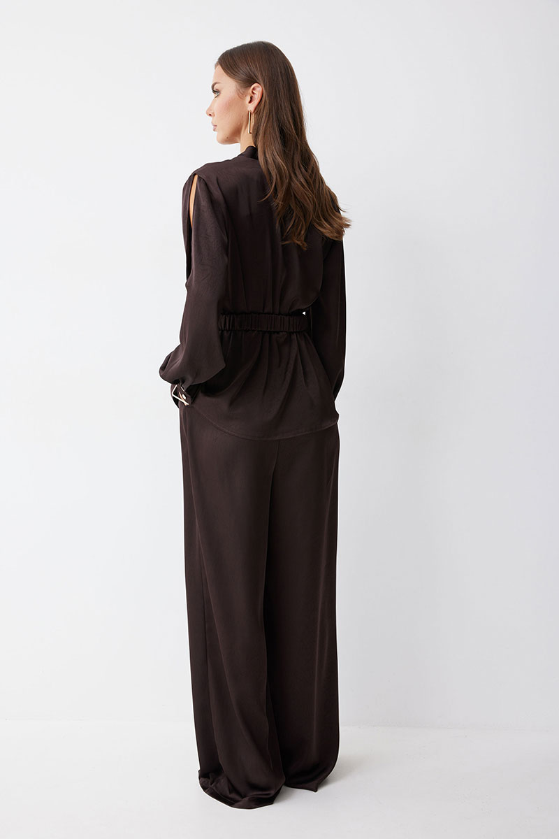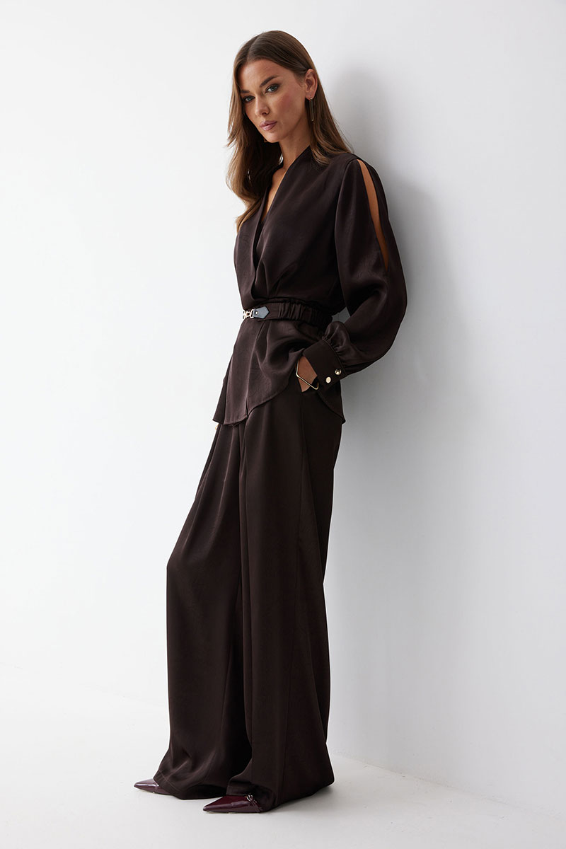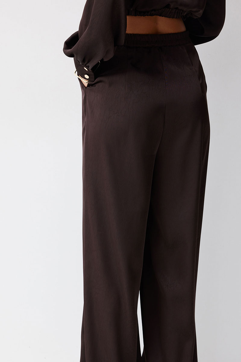 Брюки прямого силуэта расширенные книзу из струящейся ткани. По верху брюк притачной пояс с застежкой на петли и пуговицы. На передних половинках обработана застежка молния в среднем