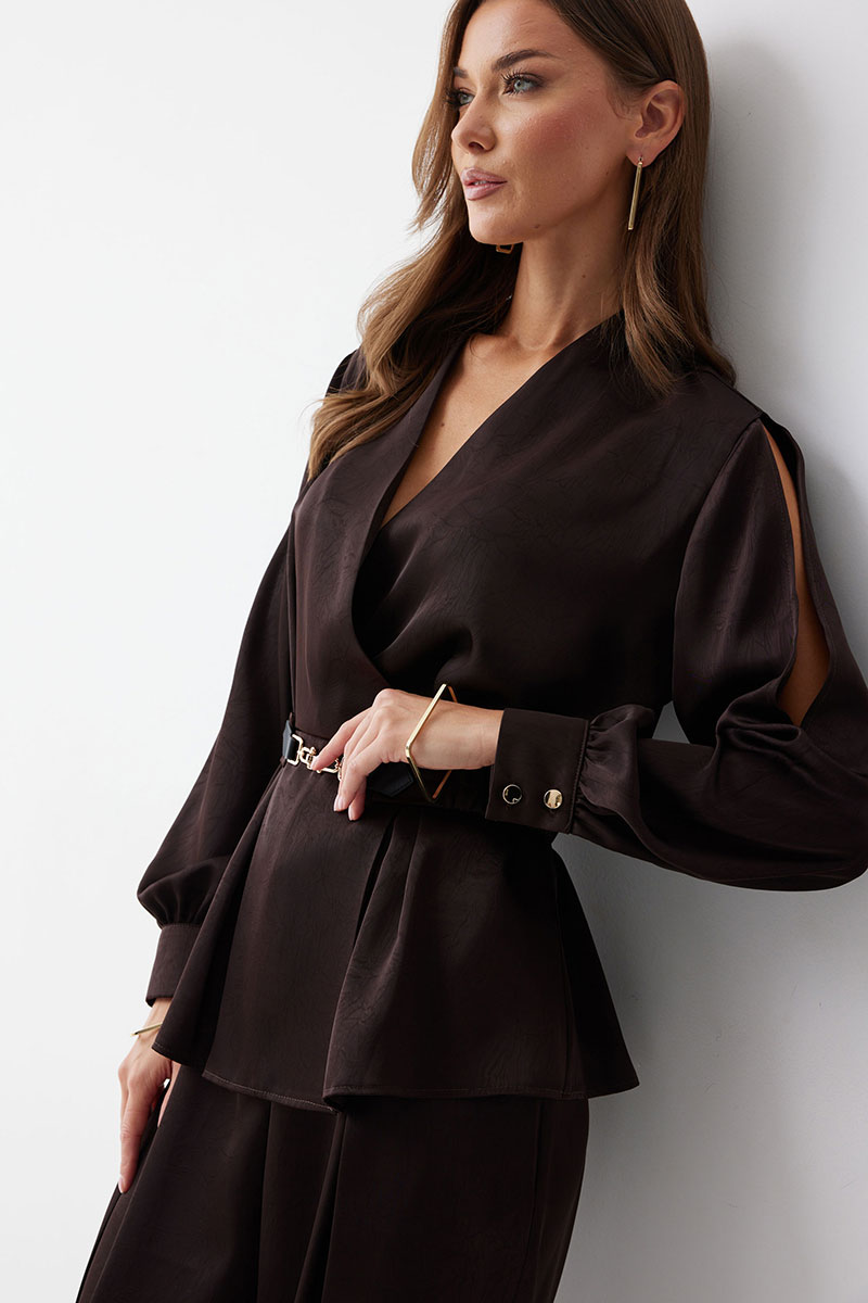 Блузка полуприлегающего силуэта расширенная книзу из струящейся ткани. Рукав втачной, с разрезом в области плеча, по низу манжета с застежкой на петли и пуговицы. Блузка отрезная по
