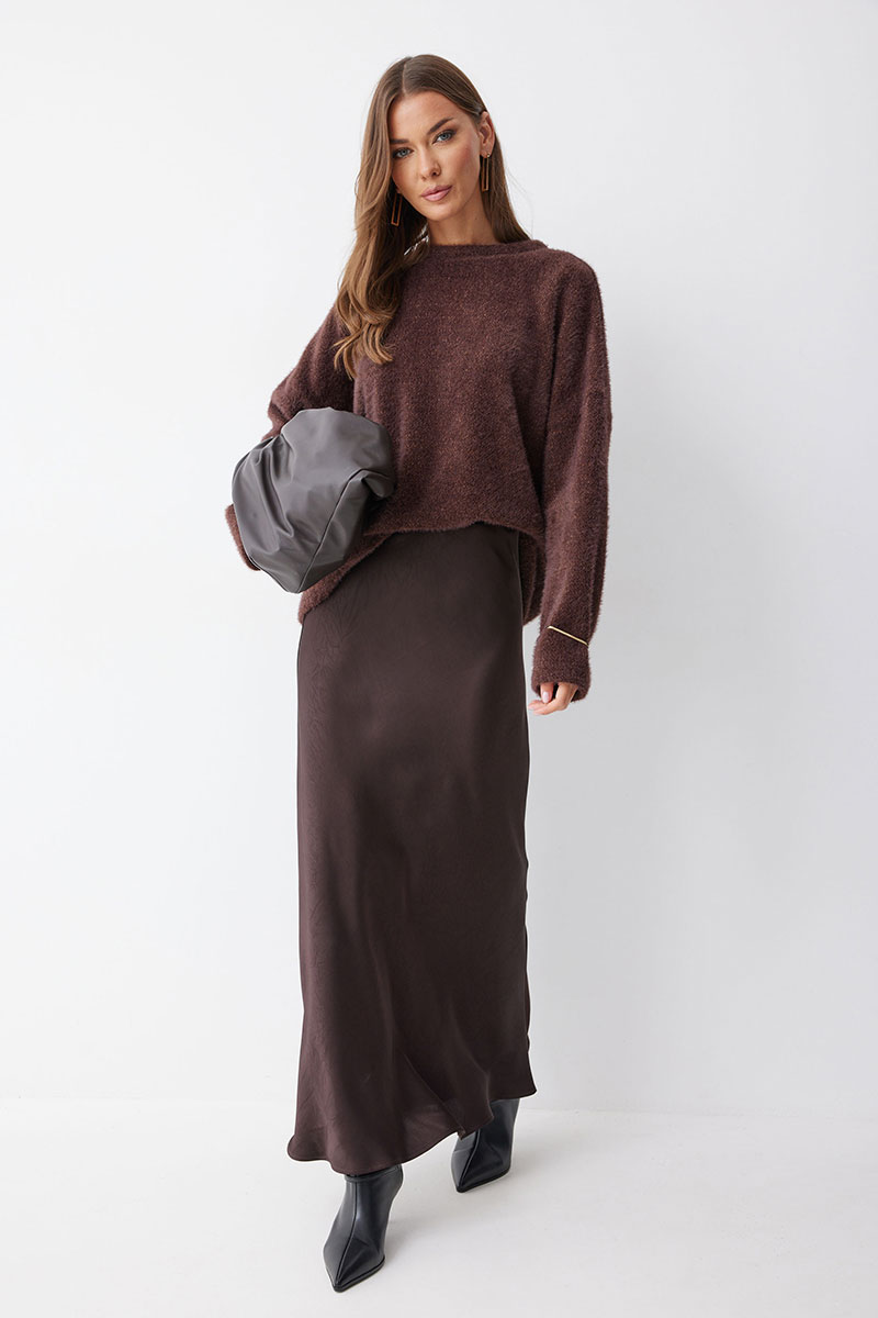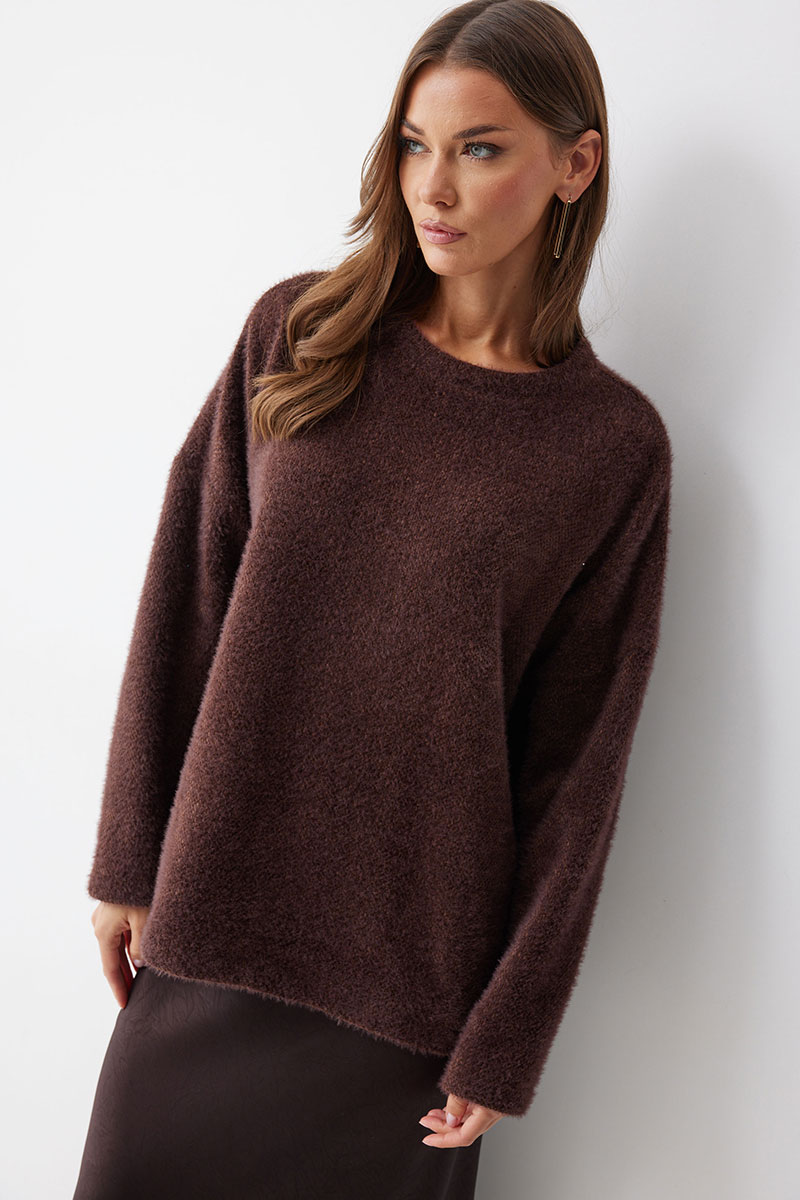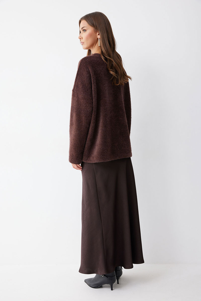 Джемпер прямого силуэта из трикотажного полотна. Горловина округлая. Рукав со спущенной линией плеча.