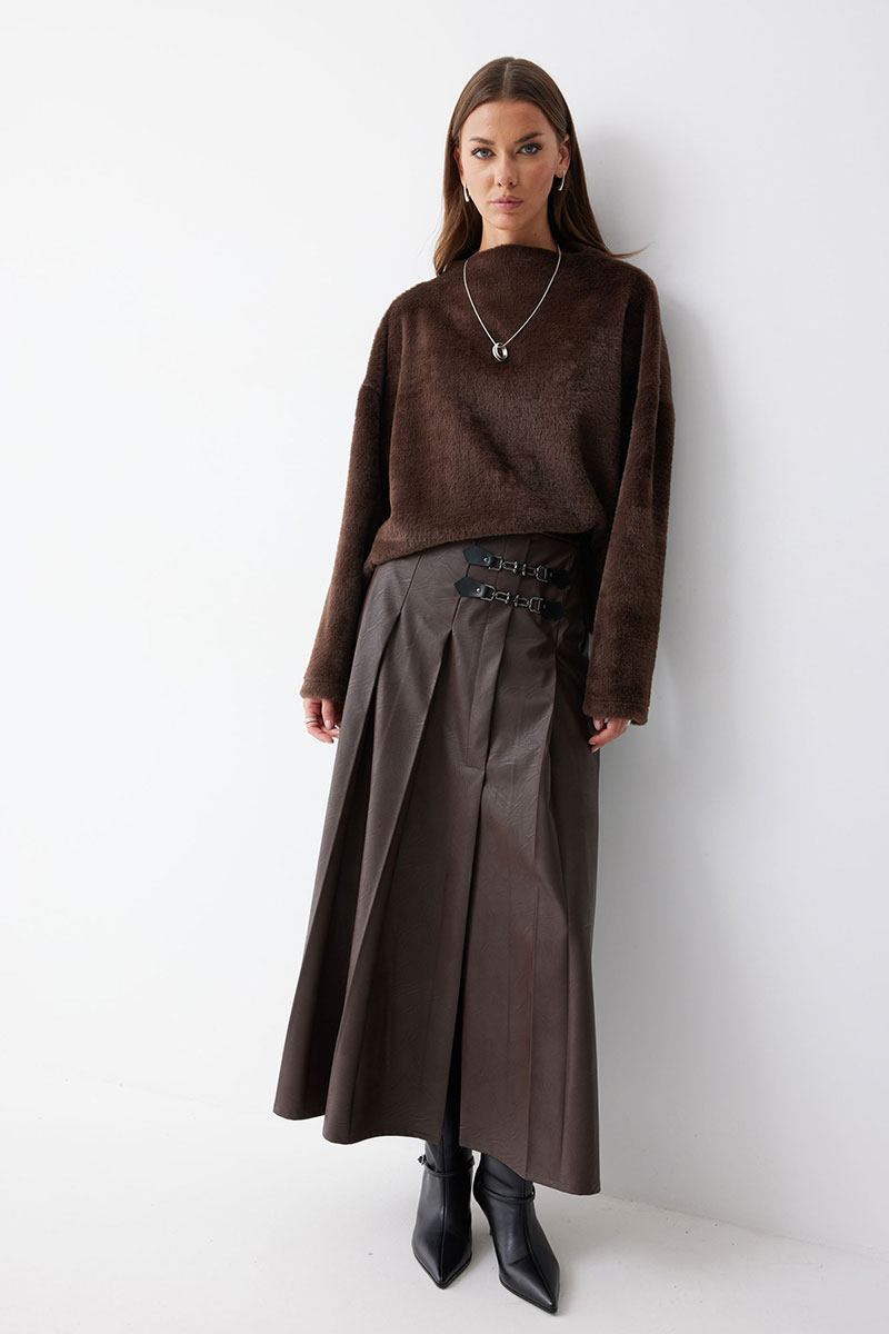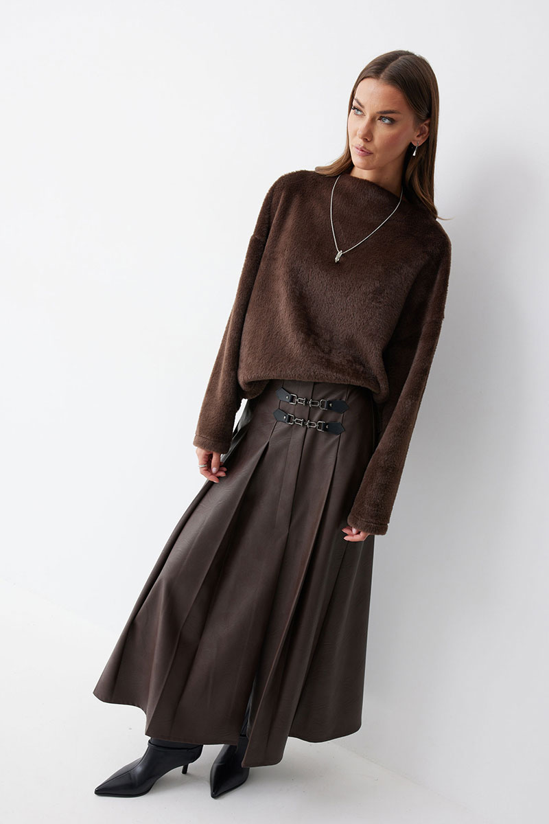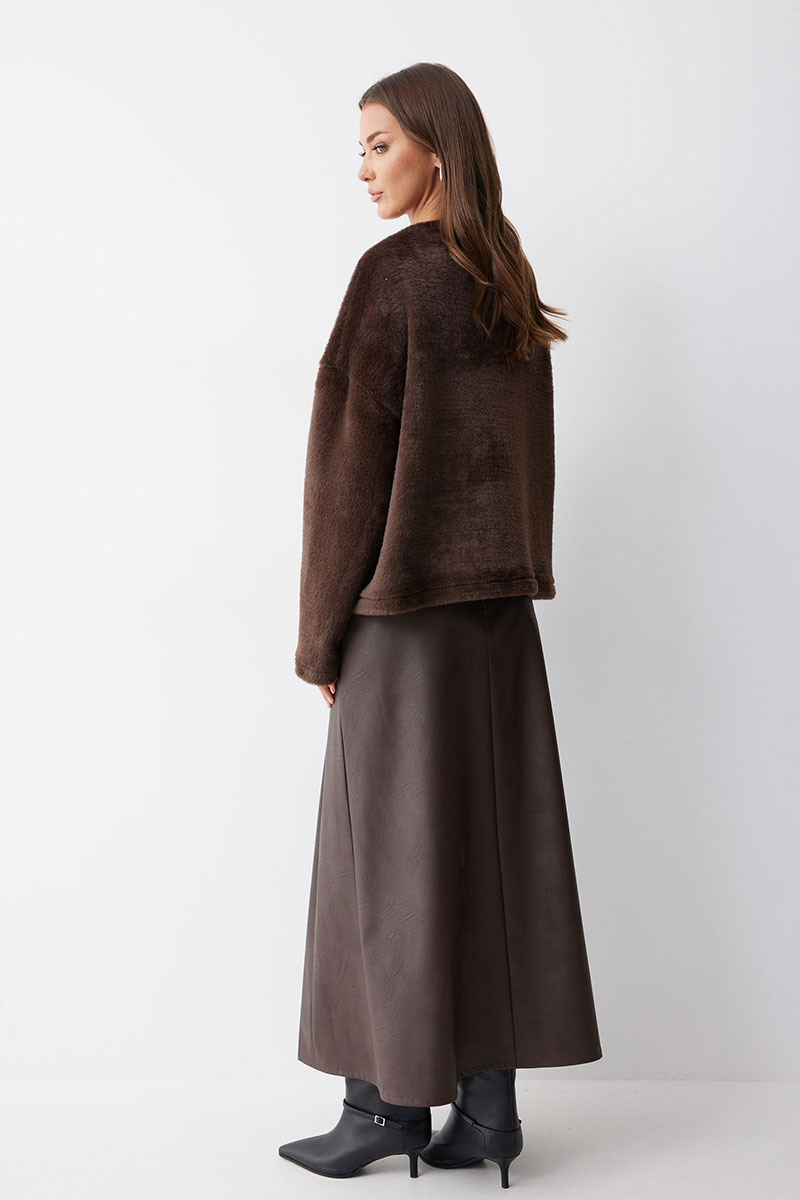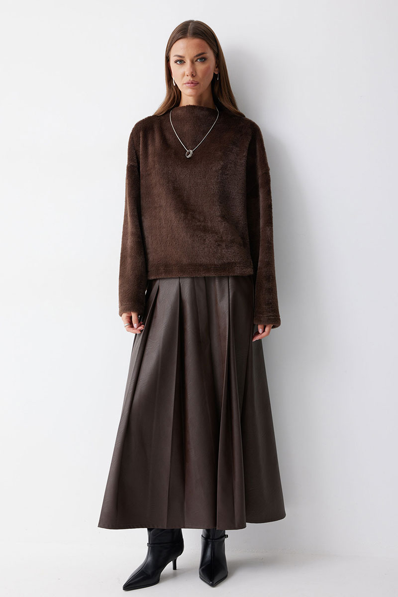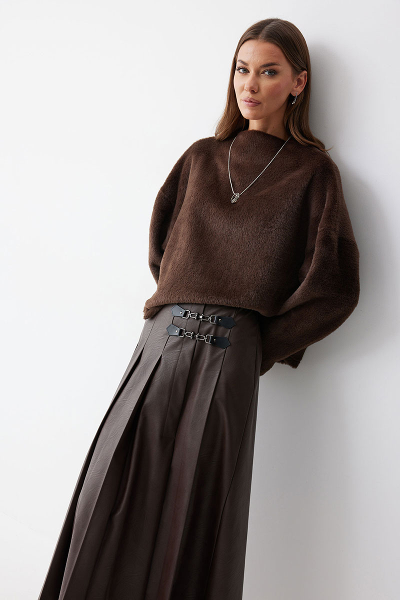 Джемпер прямого силуэта из трикотажного полотна с фигурным низом. Горловина цельнокроеная стойка. Рукав со спущенной линией плеча, удлиненный. Джемпер со смещенным боковым швом.