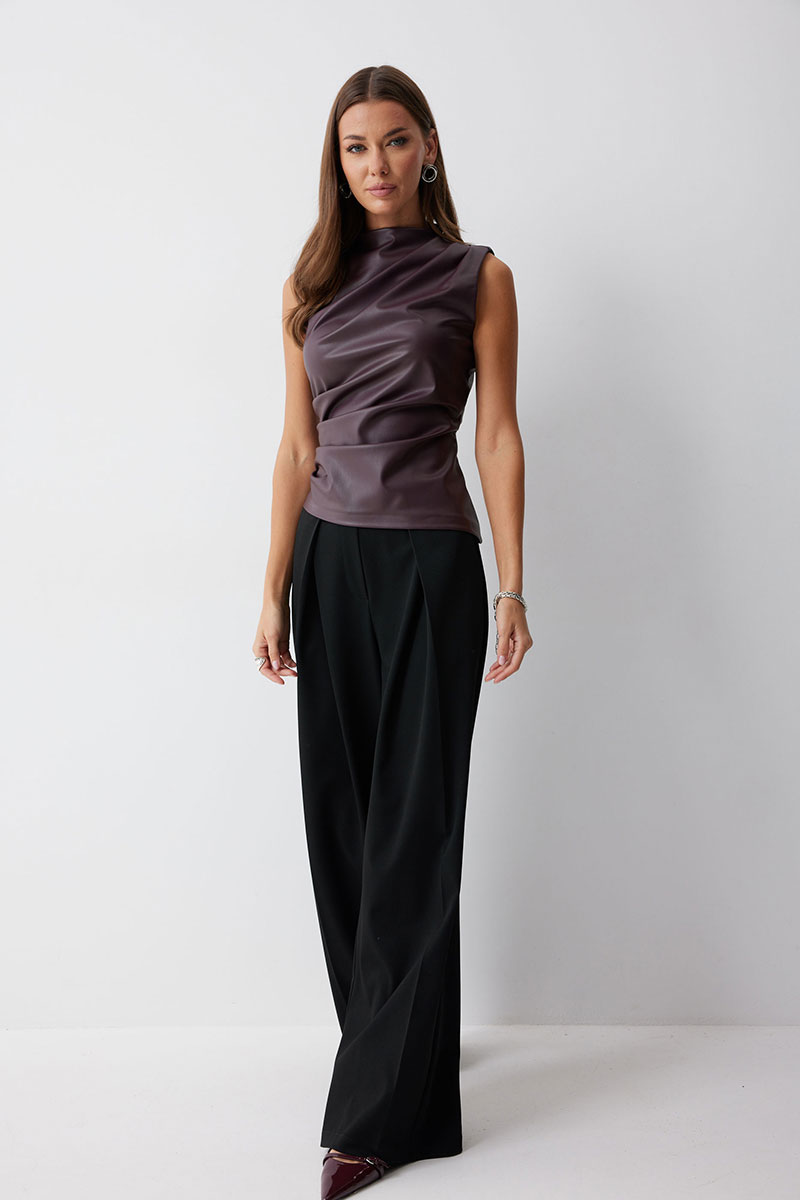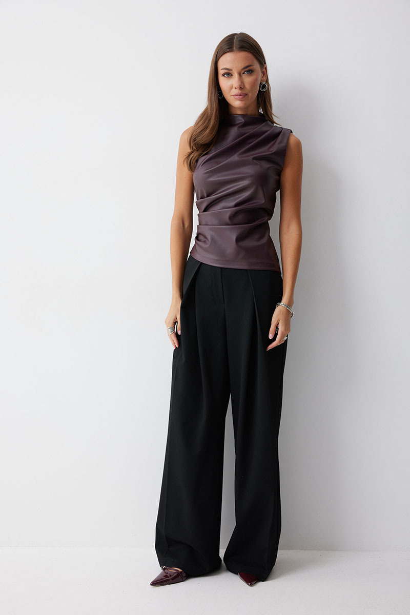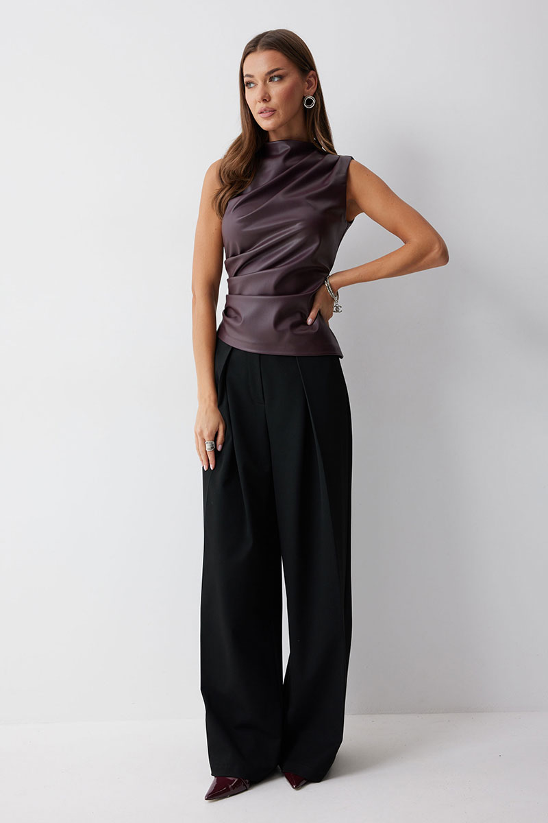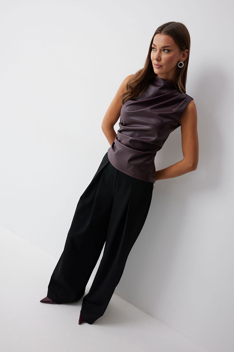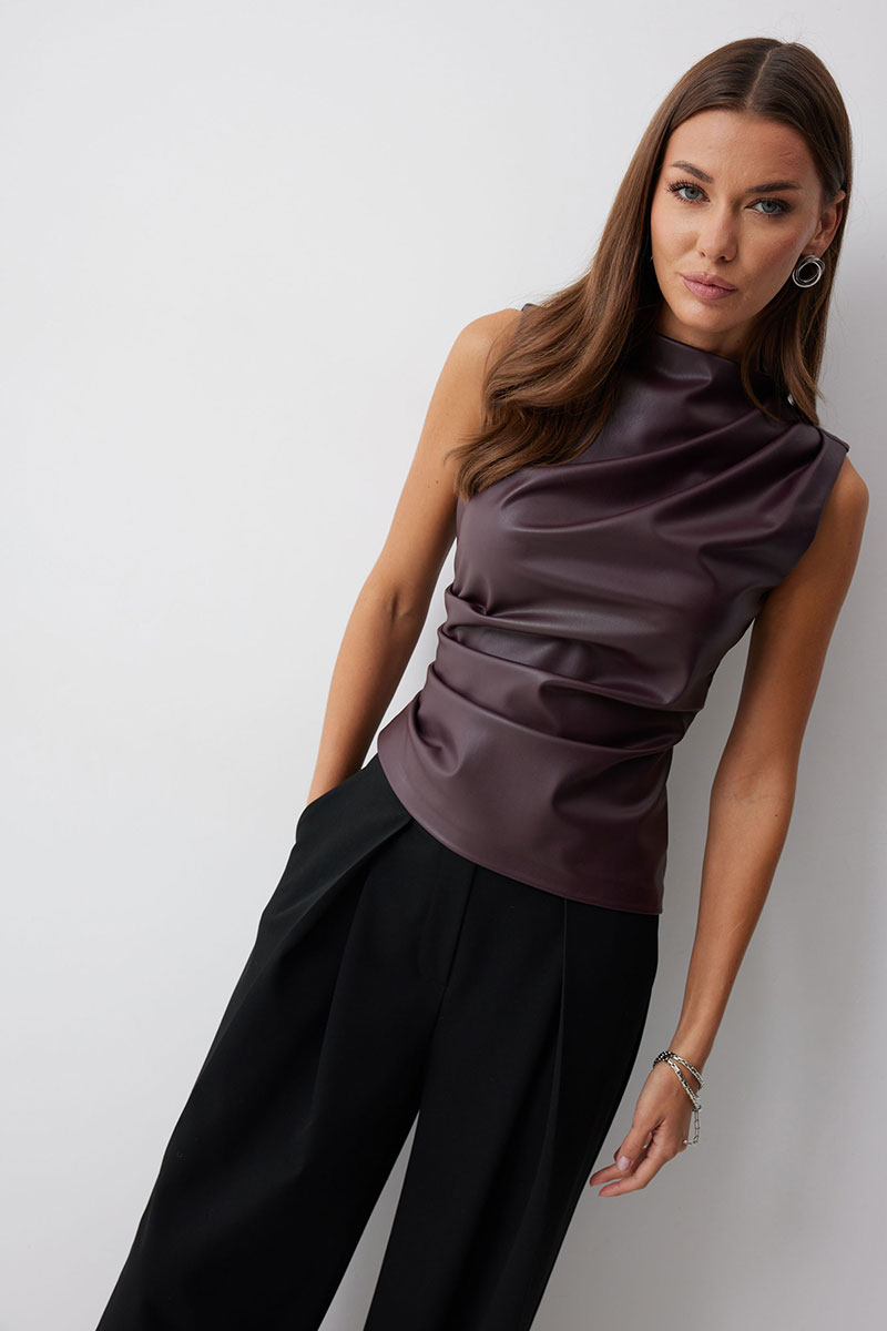 Блуза прилегающего силуэта из экокожи с ассиметричным низом. Горловина с цельнокроеной стойкой. По переду декоративные складки, выходящие из плеча и бокового шва. На спинке в центральном шве потайная молния и талиевые вытачки.
