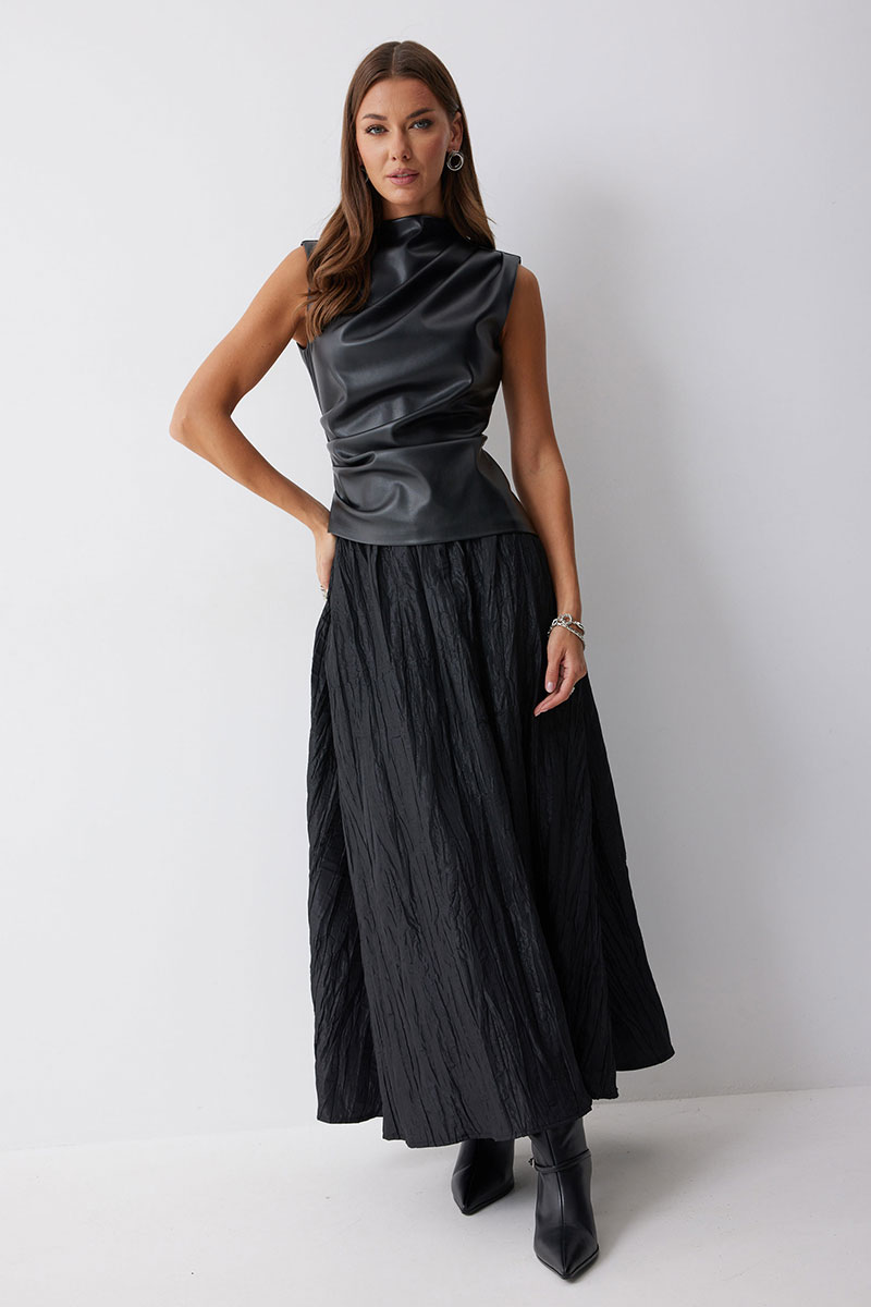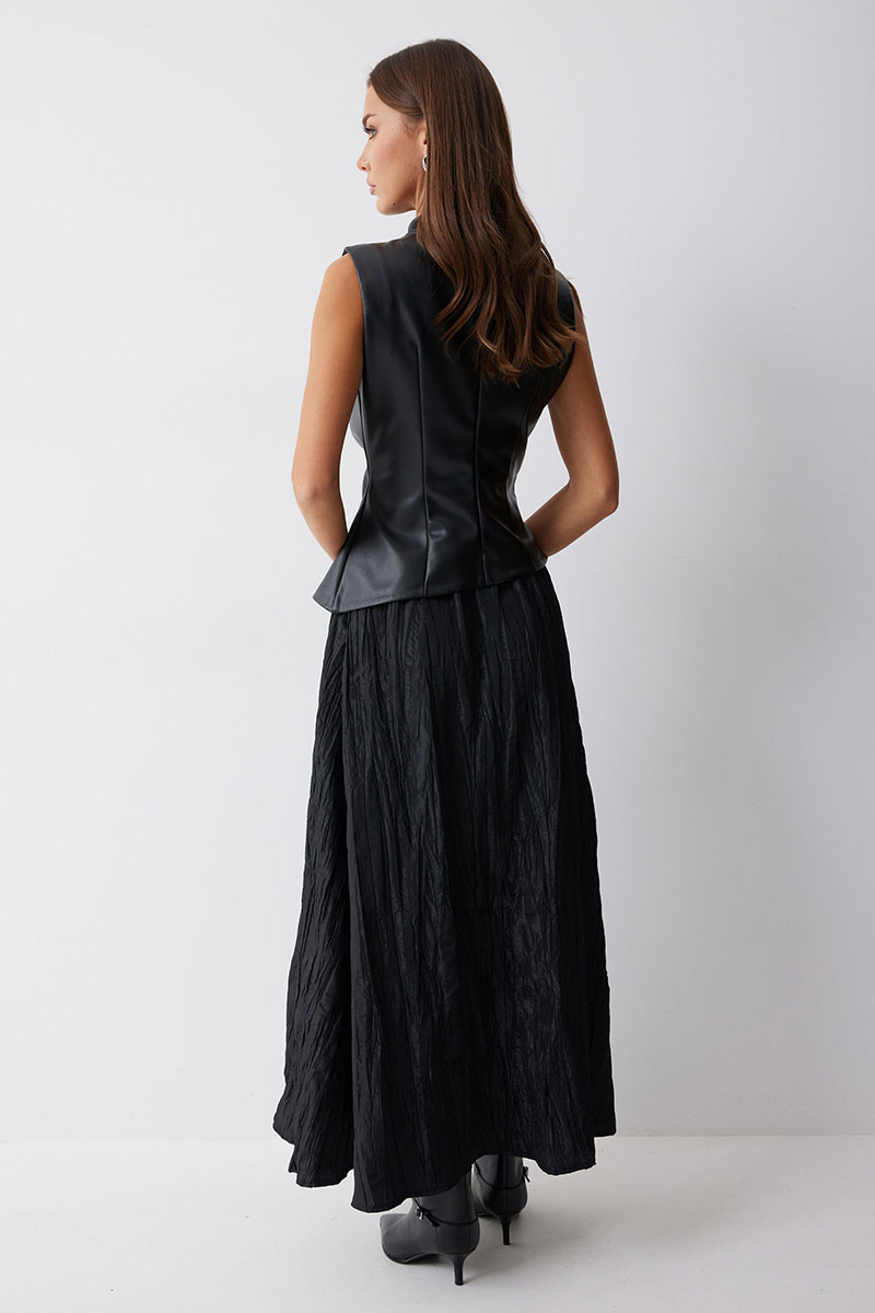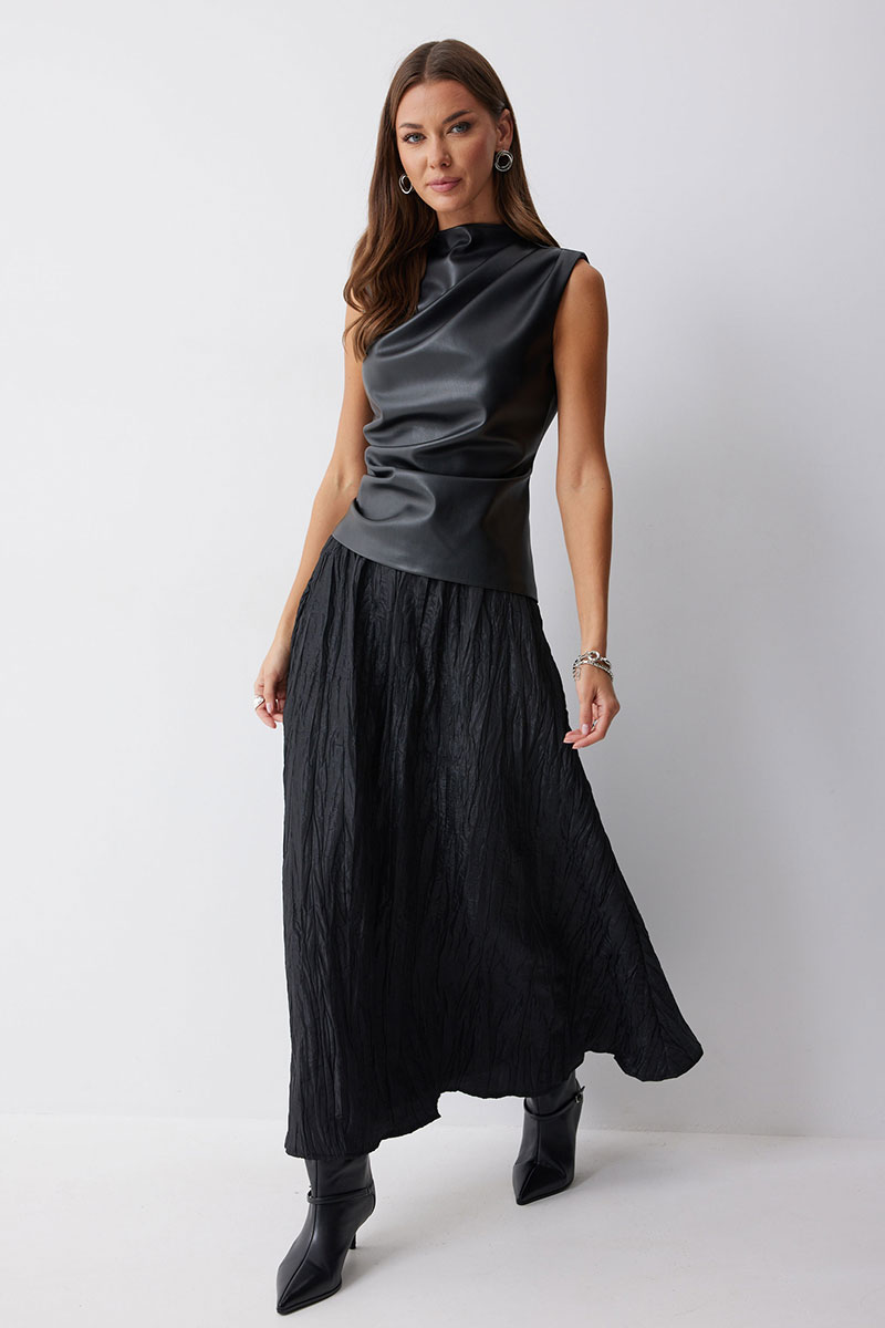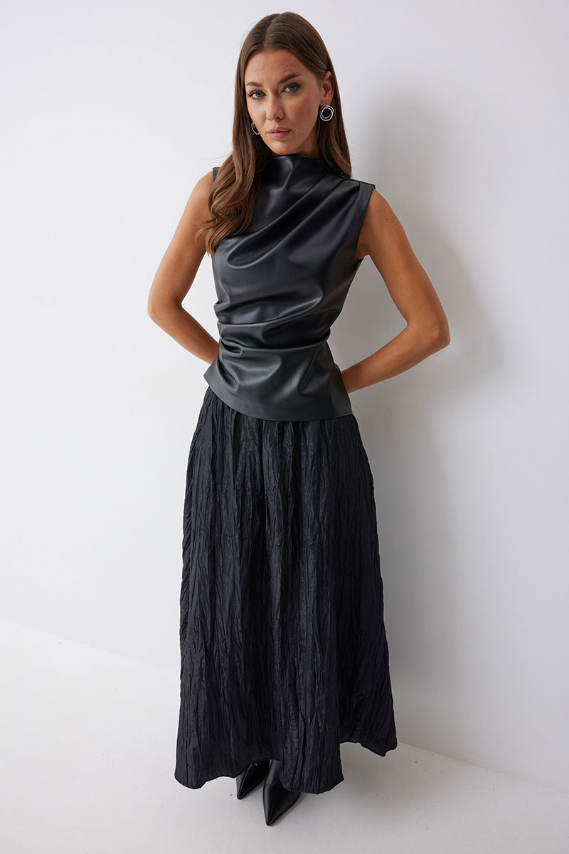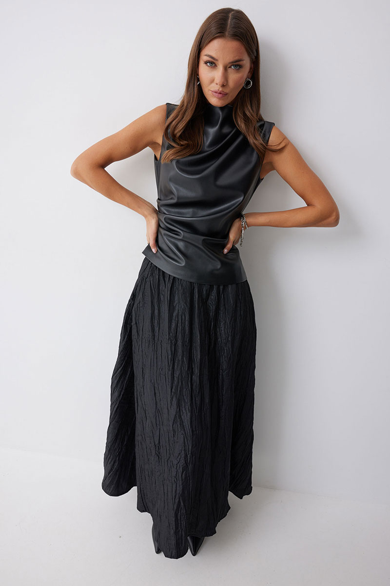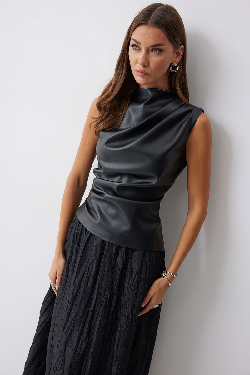 Блуза прилегающего силуэта из экокожи с ассиметричным низом. Горловина с цельнокроеной стойкой. По переду декоративные складки, выходящие из плеча и бокового шва. На спинке в центральном шве потайная молния и талиевые вытачки.
