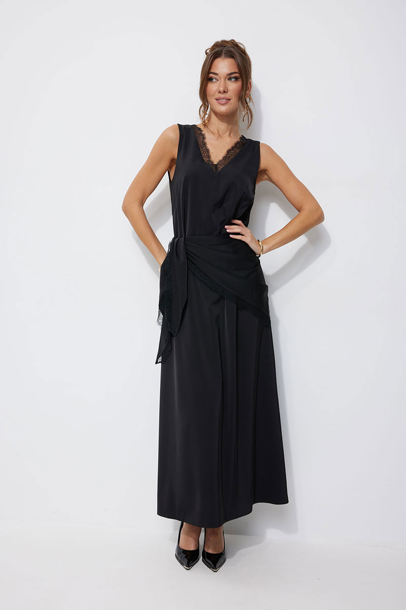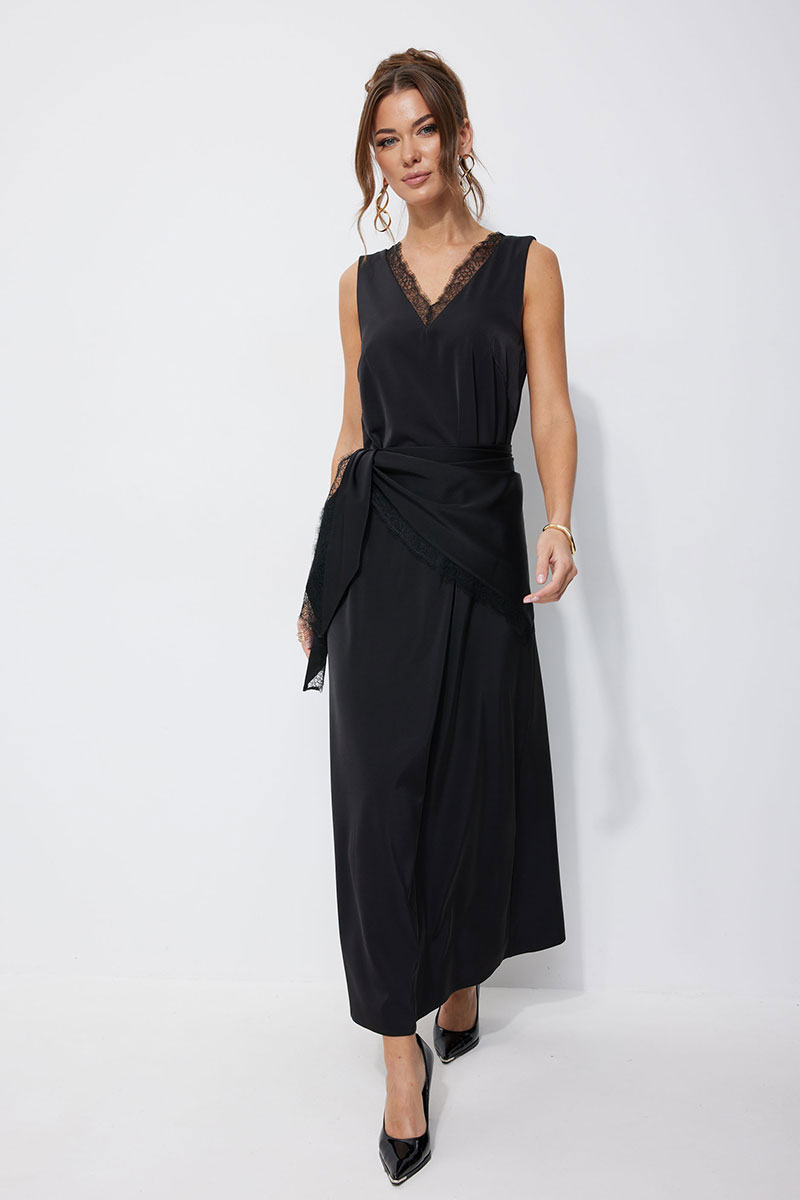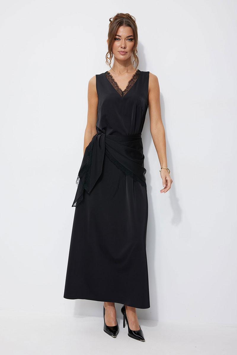 Нарядное платье из струящейся ткани, длина макси. Платье свободного кроя, прямое, расширенное к низу. С глубоким V-образным вырезом горловины по переду и спинке, декорированным французским кружевом. По переду нагрудные вытачки. Без рукава. Платье дополняется платком из основной ткани. Платок декорирован по двум срезам французским кружевом. Обращаем Ваше внимание, что кружево может незначительно отличаться от фото.