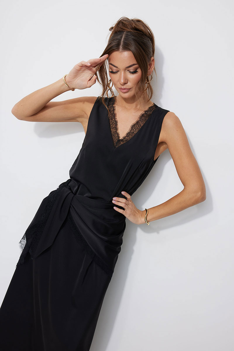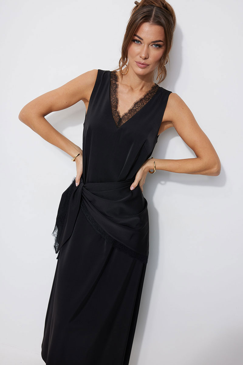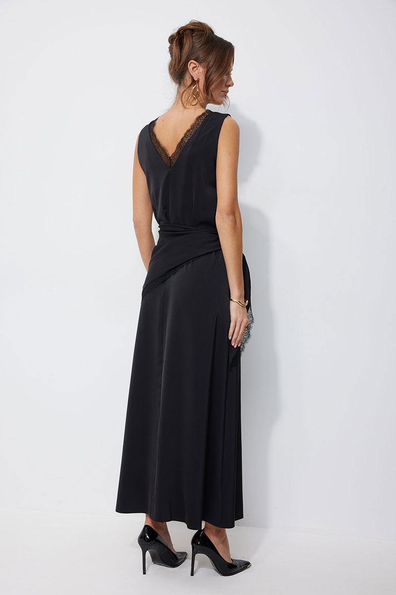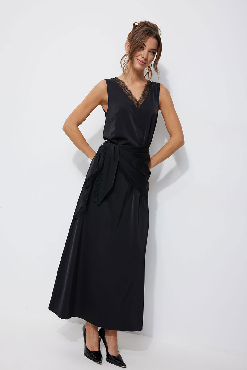 Нарядное платье из струящейся ткани, длина макси. Платье свободного кроя, прямое, расширенное к низу. С глубоким V-образным вырезом горловины по переду и спинке, декорированным французским кружевом. По переду нагрудные вытачки. Без рукава. Платье дополняется платком из основной ткани. Платок декорирован по двум срезам французским кружевом. Обращаем Ваше внимание, что кружево может незначительно отличаться от фото.