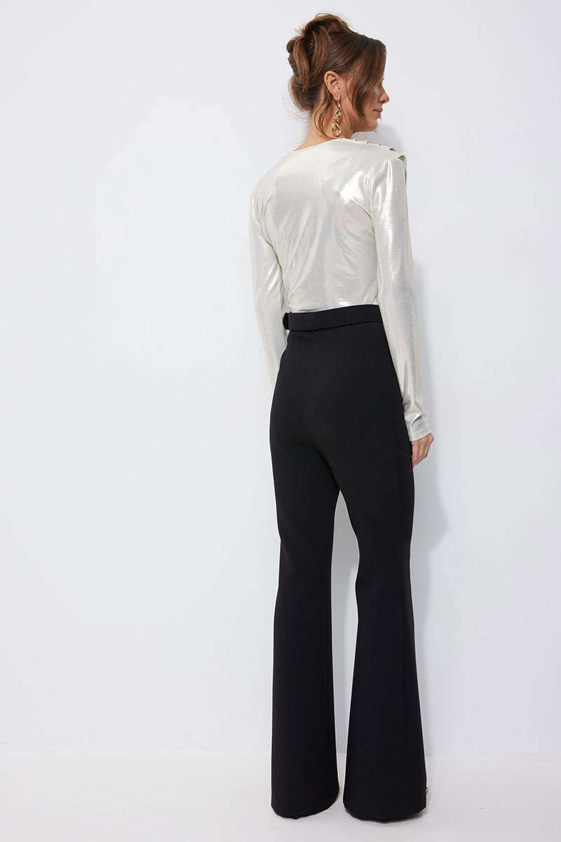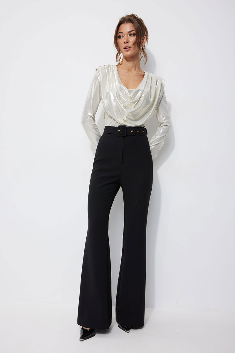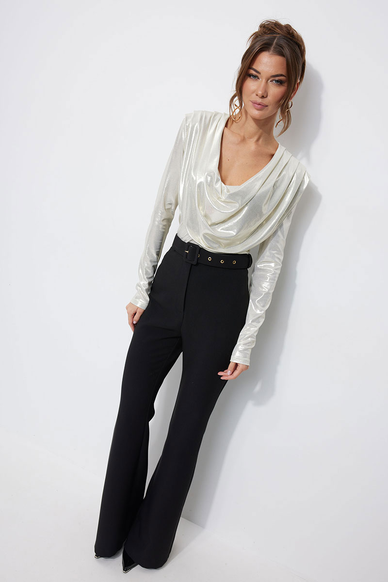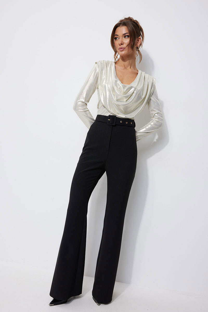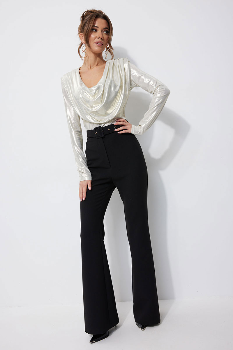 Блузка полуприлегающего силуэта из трикотажного полотна. По переду глубокий вырез и декоративная деталь ’качель’. Рукав втачной удлиненный.