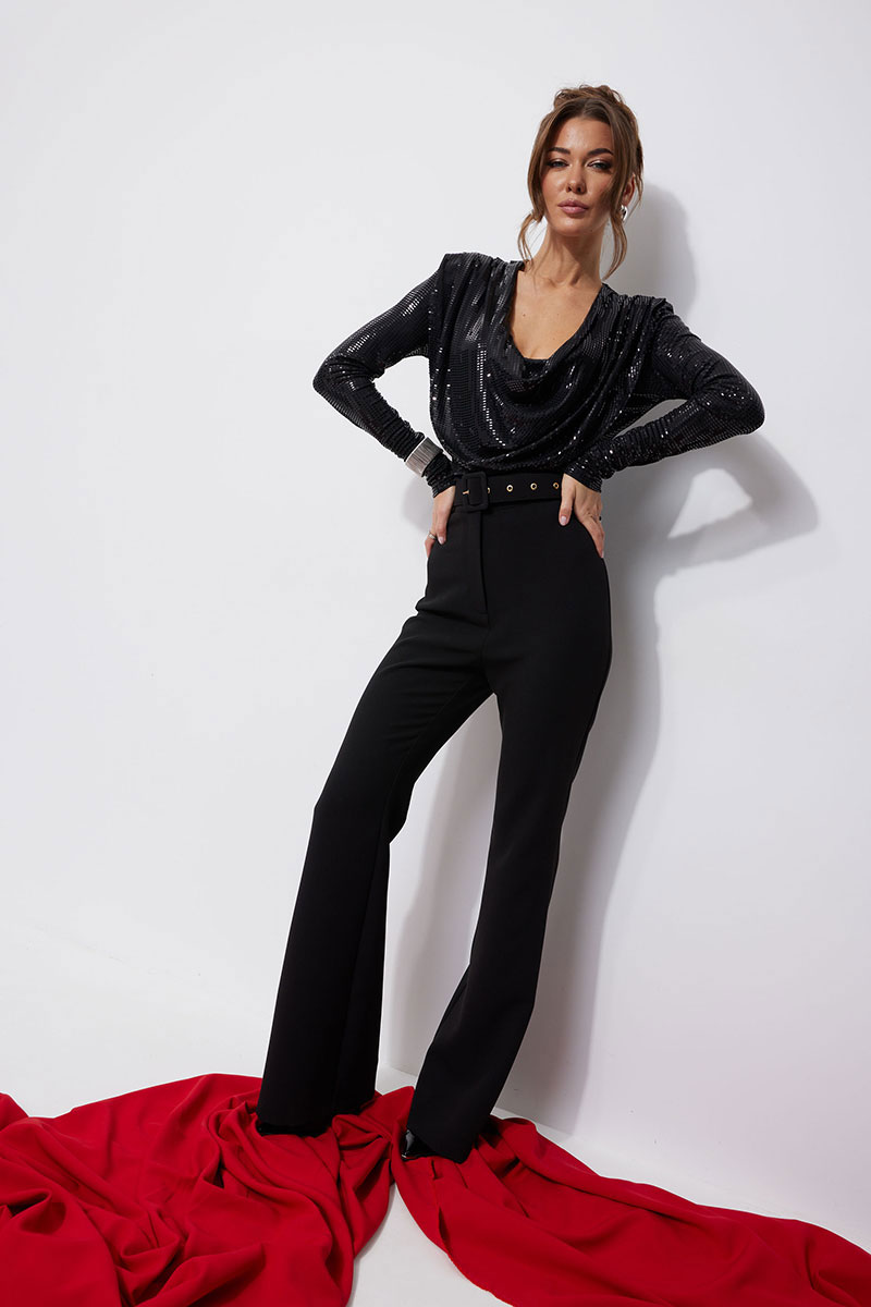 Блузка полуприлегающего силуэта из трикотажного полотна. По переду глубокий вырез и декоративная деталь ’качель’. Рукав втачной удлиненный.