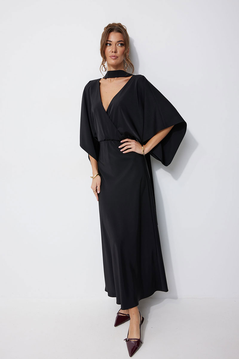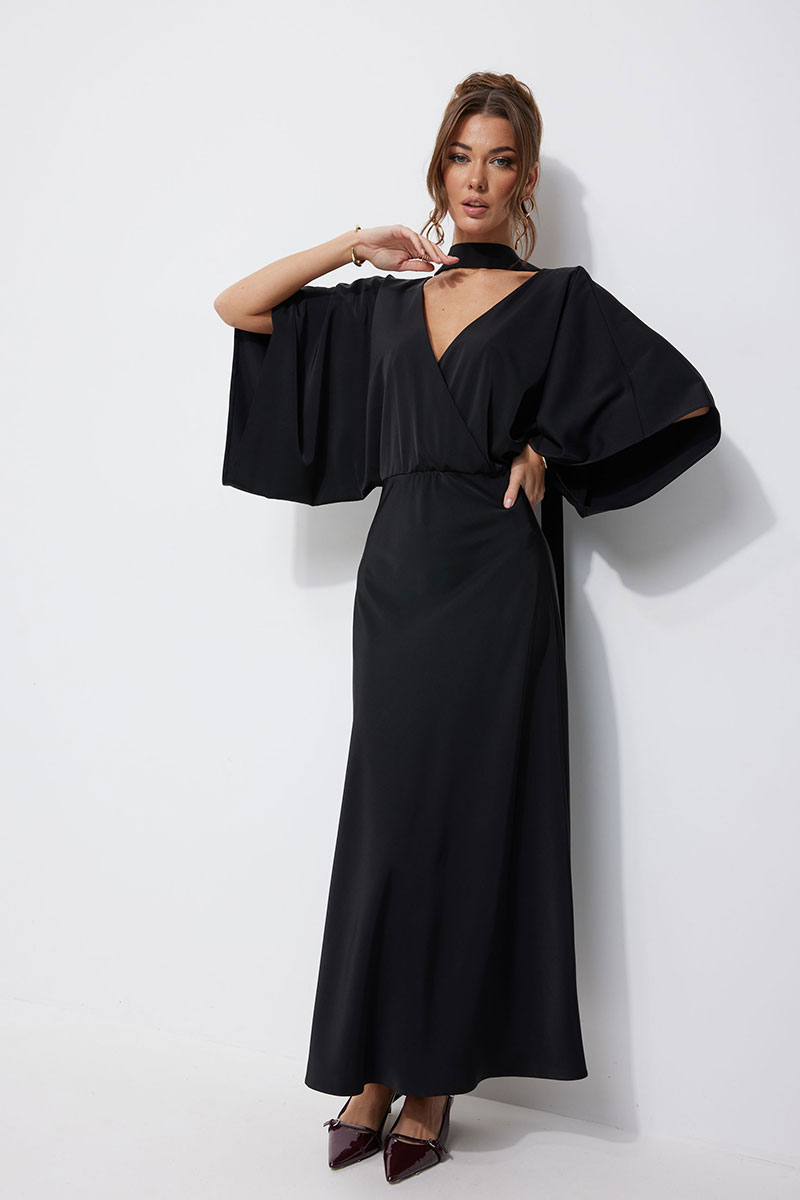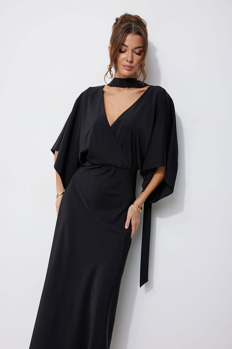 Нарядное платье из струящейся ткани, длина макси. Платье полуприлегающего силуэта. Отрезное по линии талии, с резинкой. По переду запах. По спинке глубокий V-образный вырез горловины. Рукав цельнокроеный, расширенный, длина немного ниже линии локтя. Юбка покроена по косой, силуэт расширяется к низу. Платье дополняется мягким поясом из основной ткани. Его можно использовать, как шаль, повязав на шею, либо, как пояс - на талию.