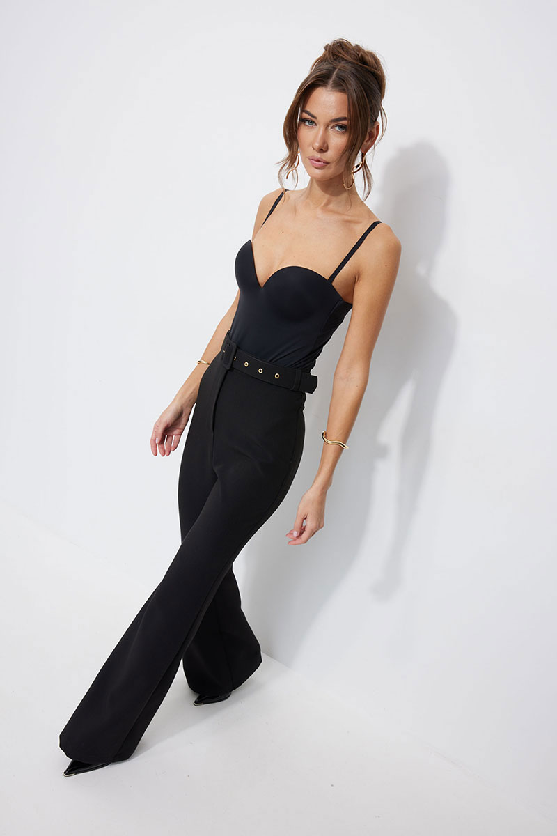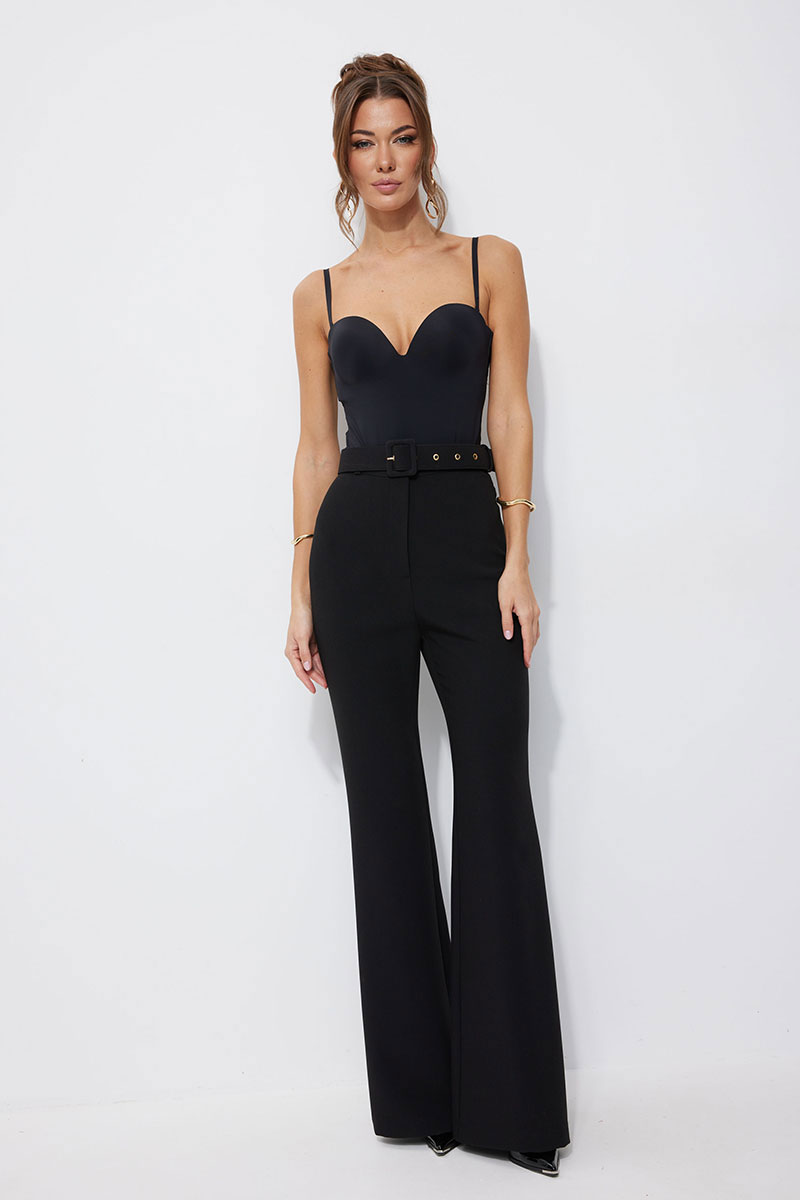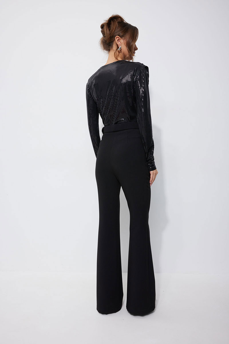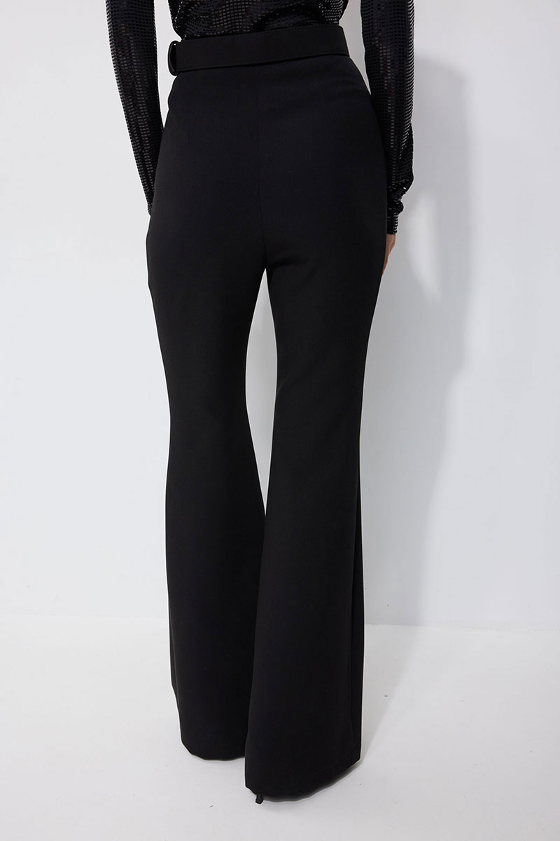 Брюки прилегающего силуэта расширенные книзу из костюмной ткани. По верху притачной пояс с застежкой на петлю и пуговицу и шлевками для ремня. На передних половинках обработана застежка молния в среднем шве. В комплект входит съемный ремень. Обращаем ваше внимание, что фурнитура может отличаться от фото.