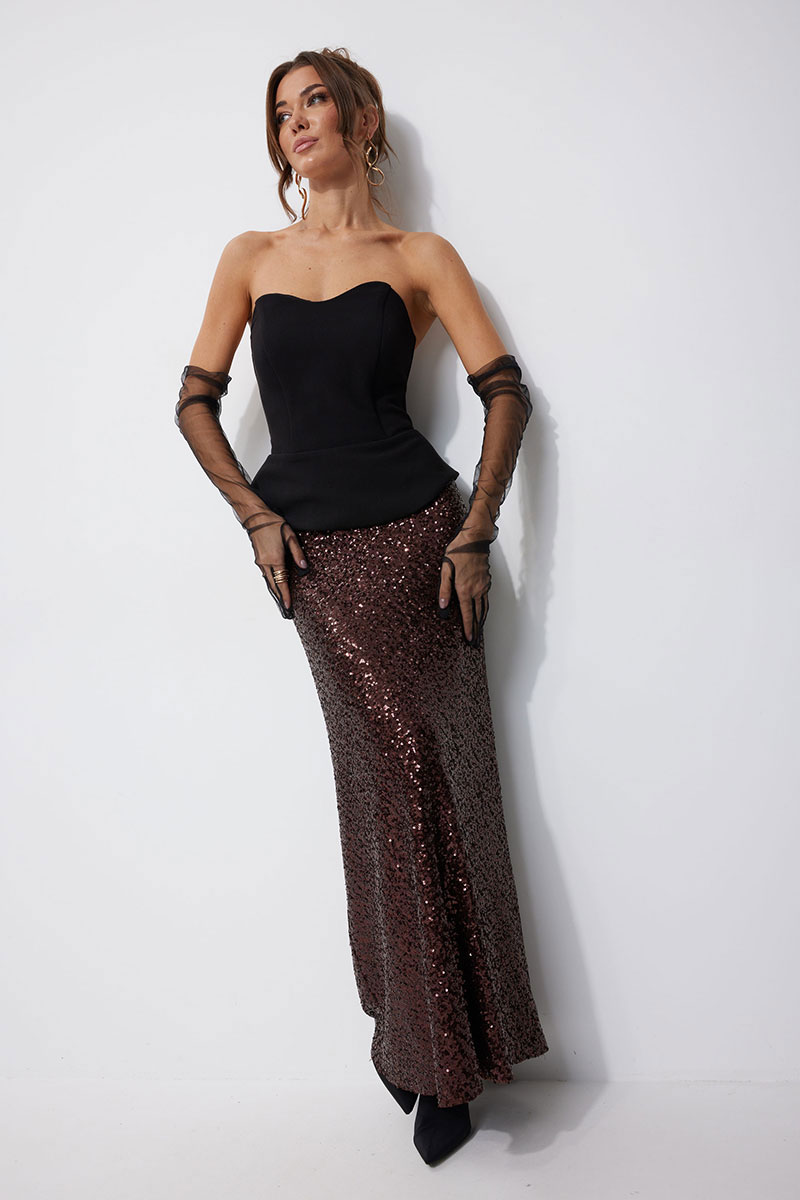 Юбка полуприлегающего силуэта расширенная книзу длиной макси из ткани с пайеткой. Юбка с резинкой по линии талии. Юбка на подкладке.