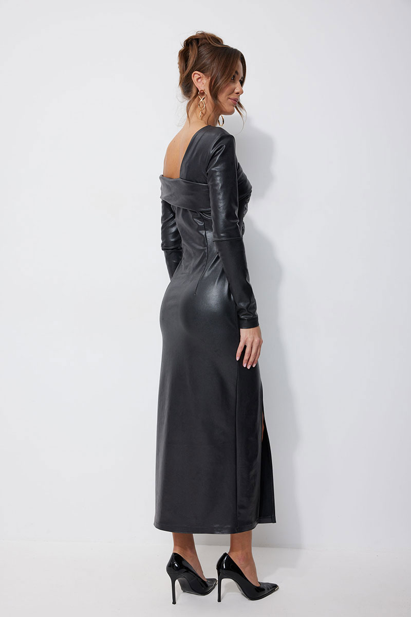 Ассиметричное платье прилегающего силуэта из трикотажного полотна. Верхняя часть платья с ассиметричным вырезом. Рукав одношовный втачной. По переду нагрудная вытачка и рельеф со сборкой, по низу в рельефе разрез. На спинке талиевые вытачки. В боковом шве потайная молния.