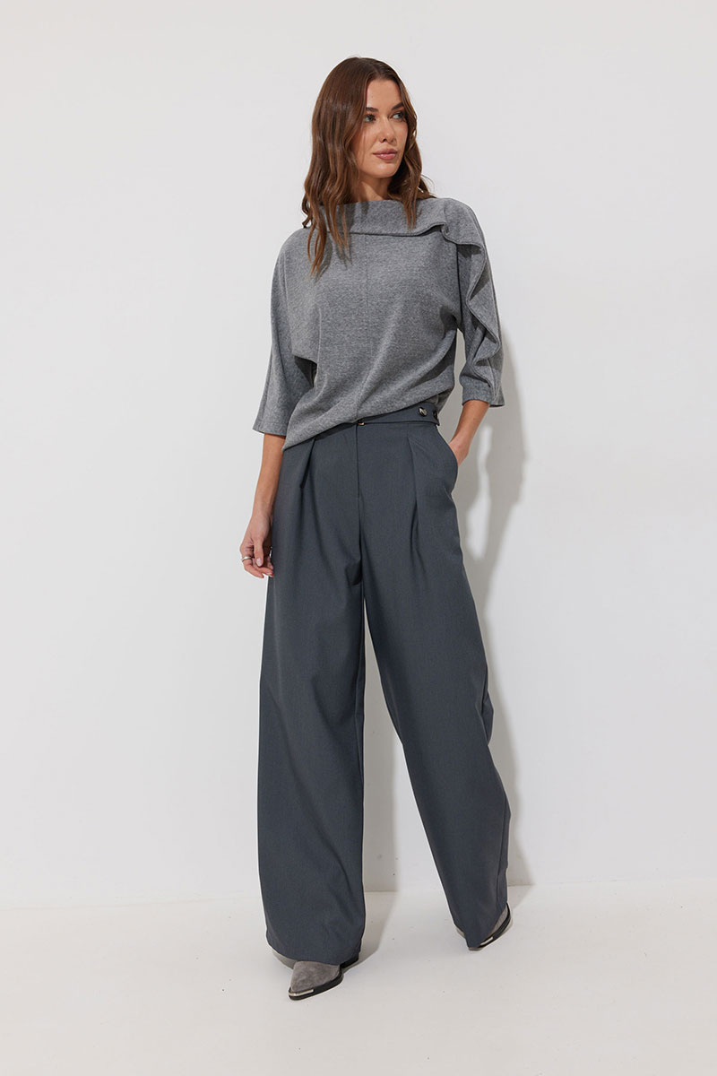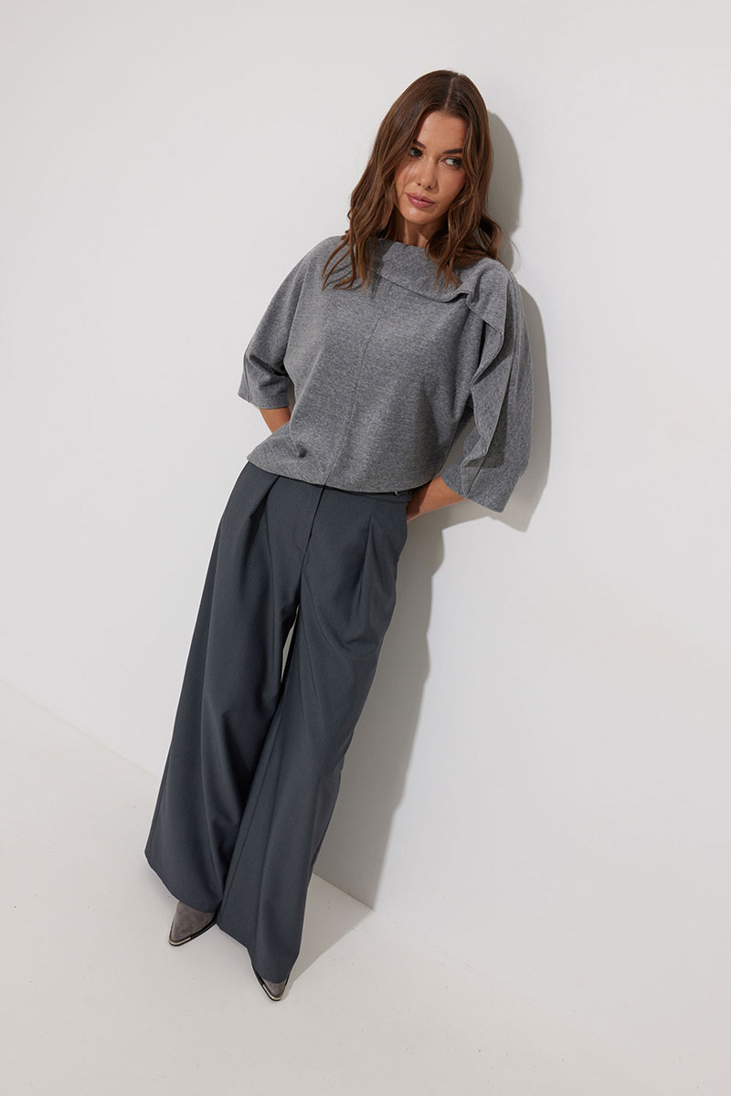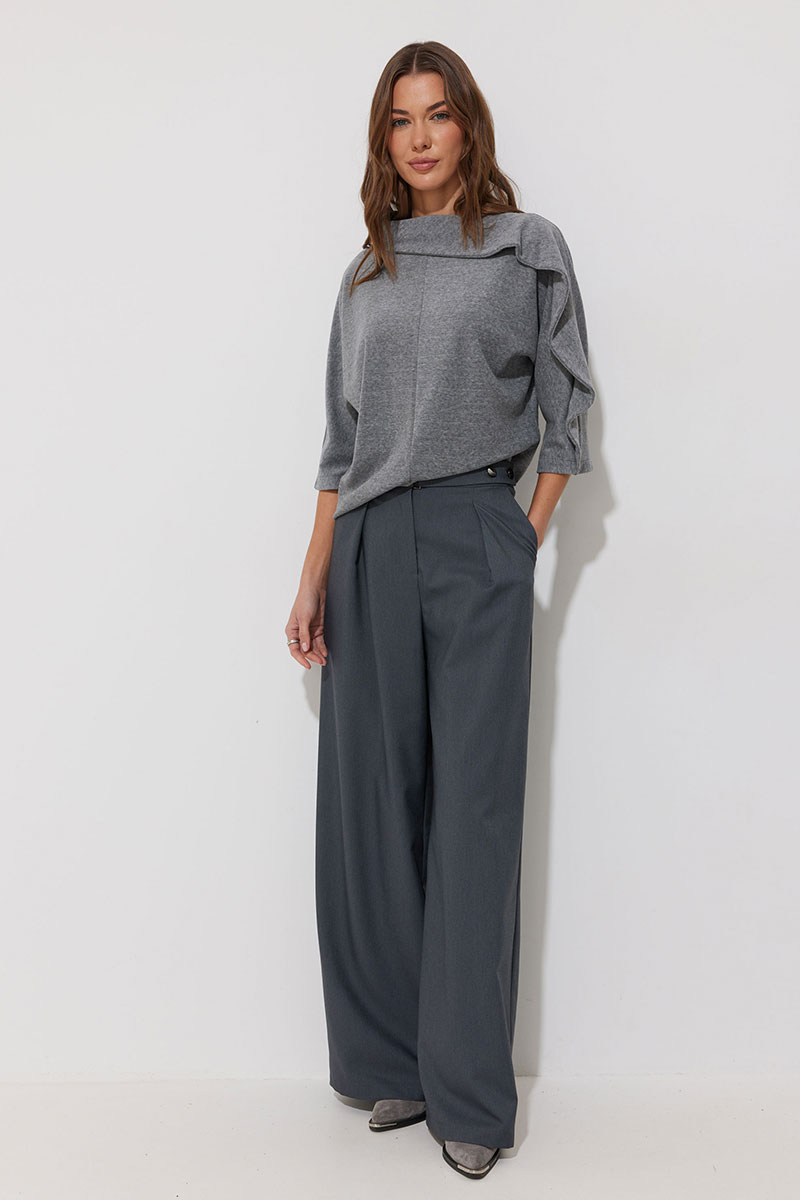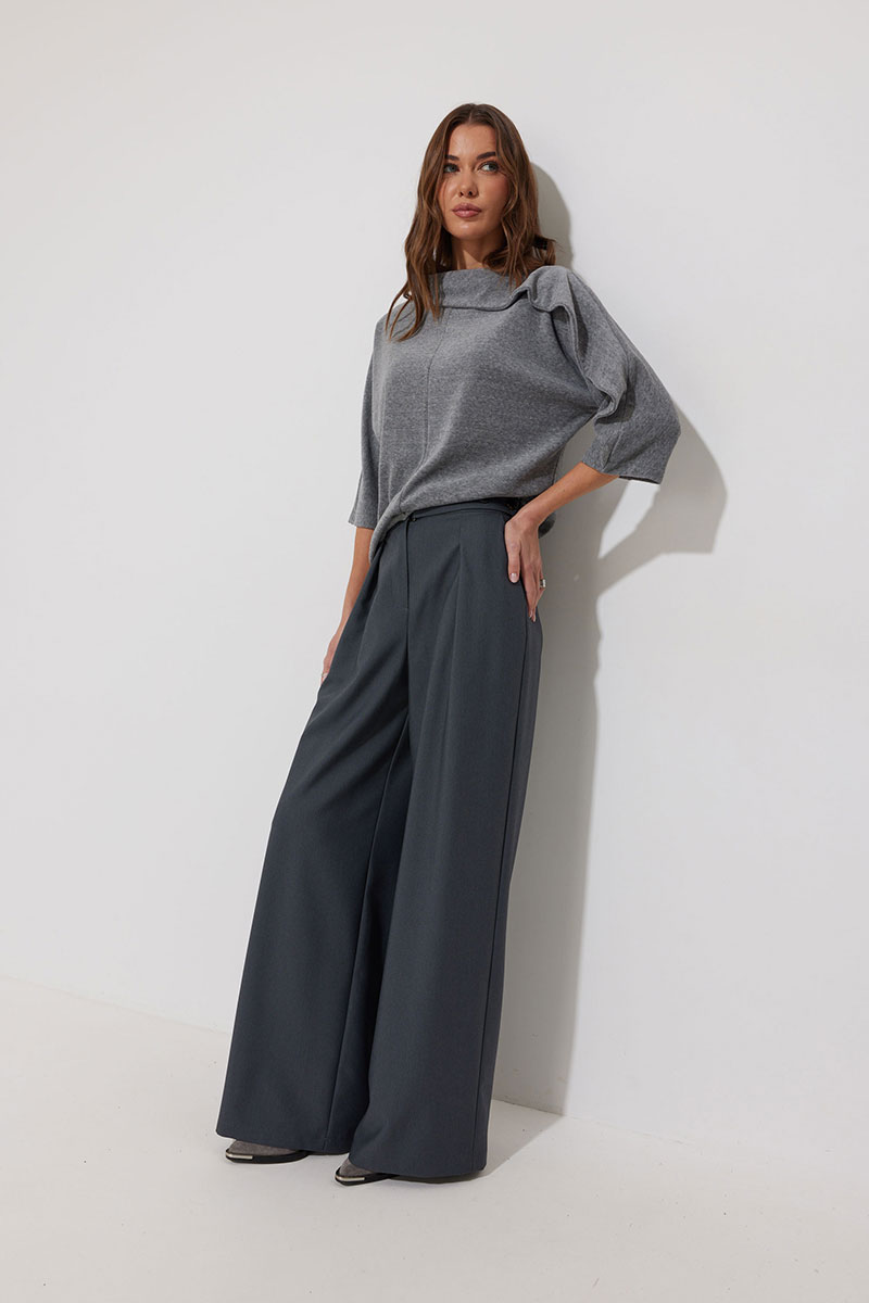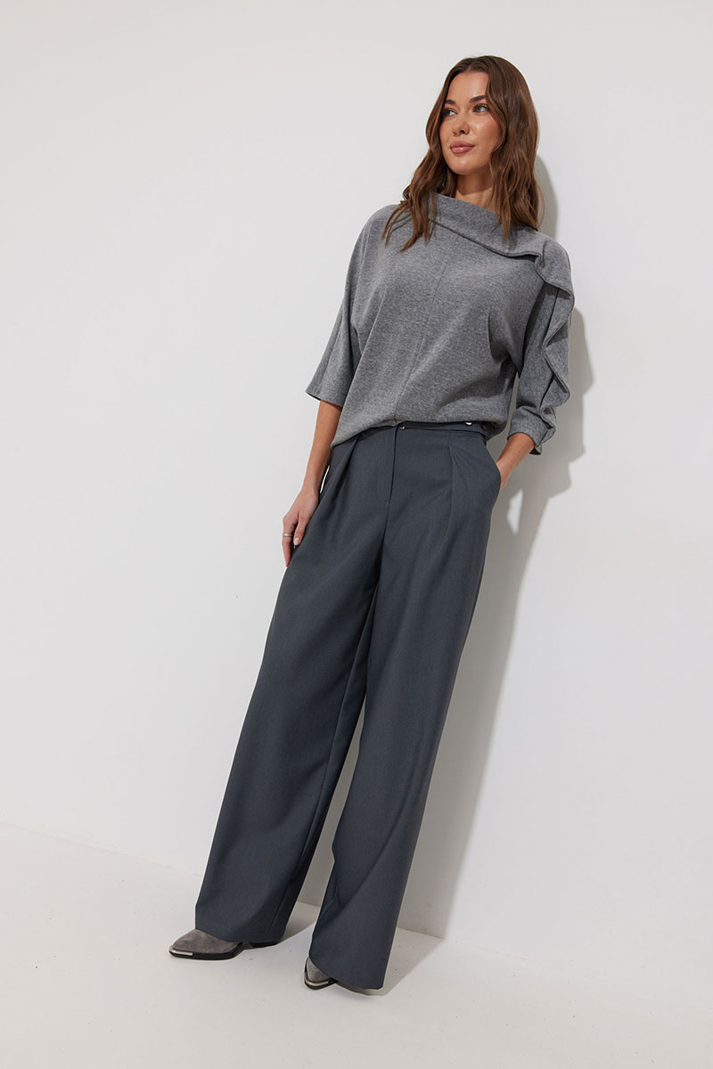 Джемпер из трикотажного полотна, прямого, слегка расширенного силуэта. С вырезом горловины «лодочка». По горловине асимметричный воротник, переходящий в подрез на рукаве. Рукав цельнокроеный, длина немного ниже линии локтя. Перед и спинка со средним швом.