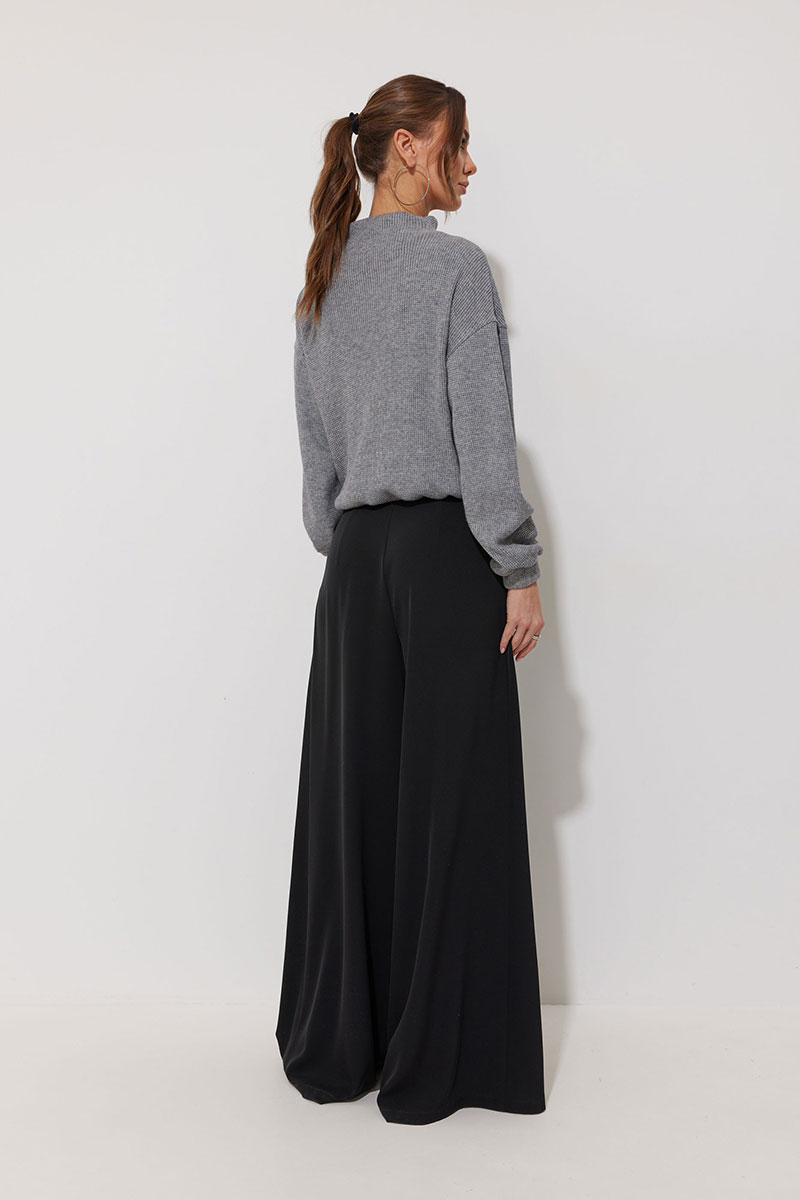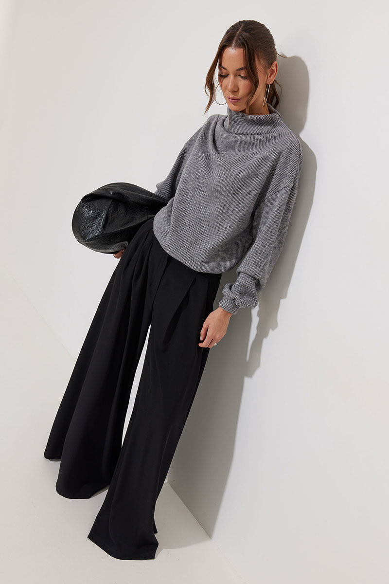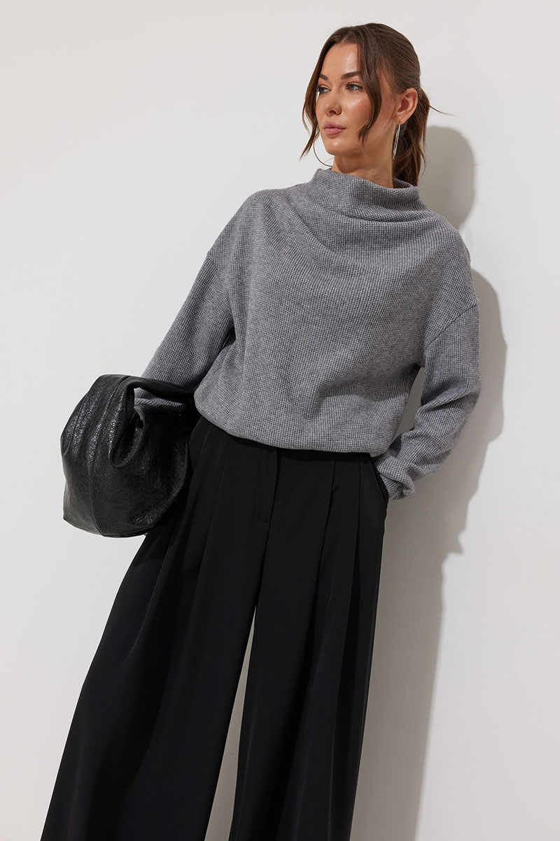 Джемпер из трикотажного полотна , прямого, слегка расширенного силуэта, со спущенной линией плеча. По горловине цельнокроеная стойка. На стойке и плече две складки. Рукав длинный с манжетой с резинкой. По низу джемпера пояс с резинкой.