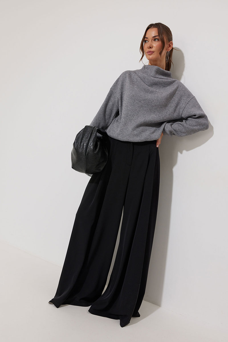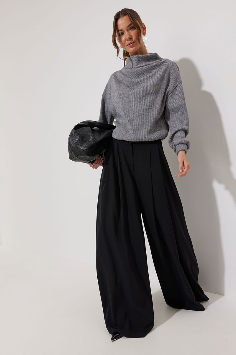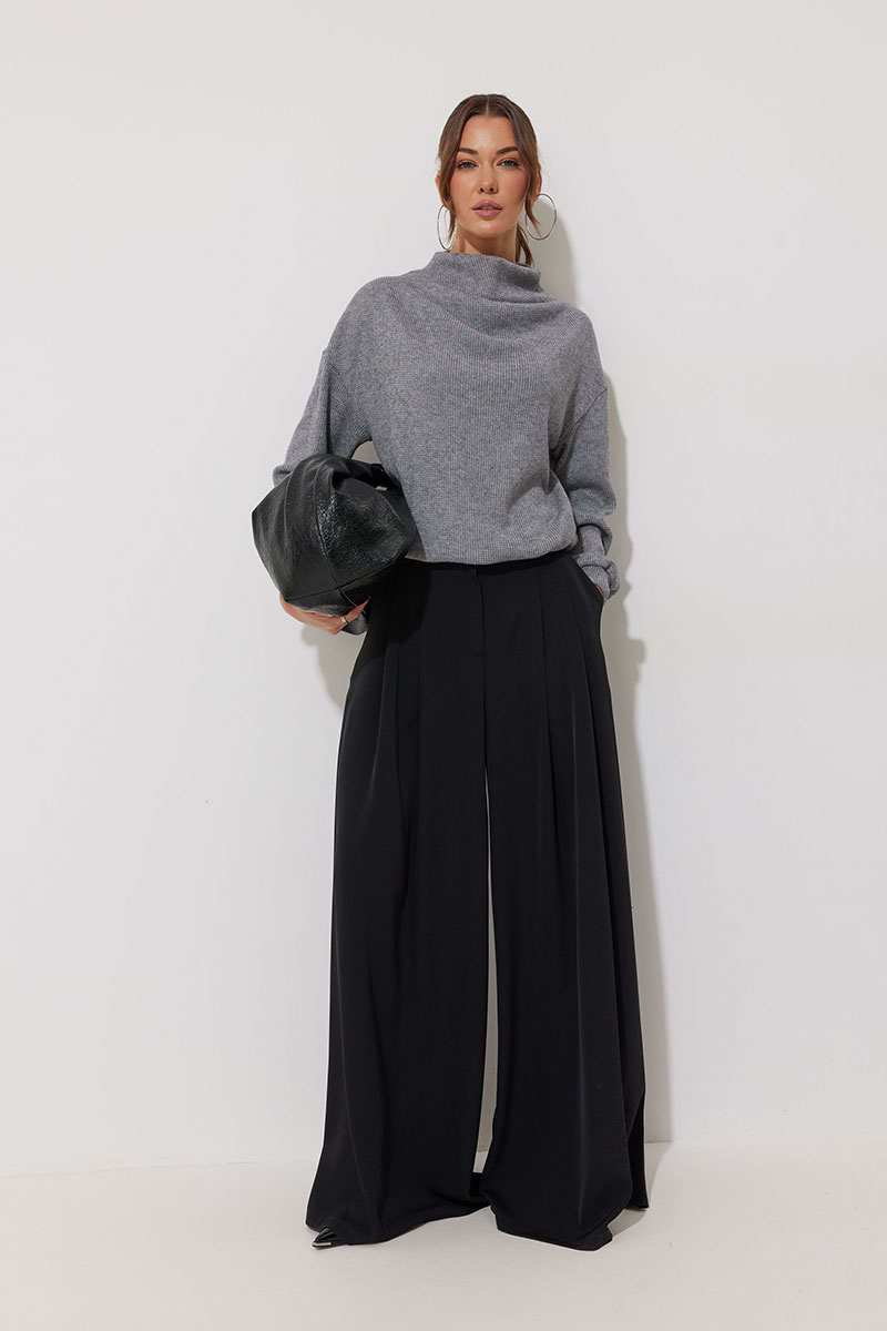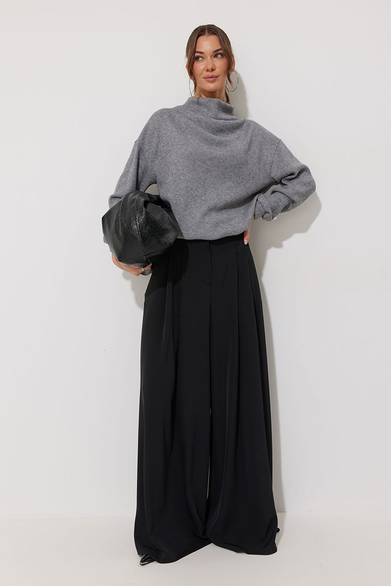 Джемпер из трикотажного полотна , прямого, слегка расширенного силуэта, со спущенной линией плеча. По горловине цельнокроеная стойка. На стойке и плече две складки. Рукав длинный с манжетой с резинкой. По низу джемпера пояс с резинкой.