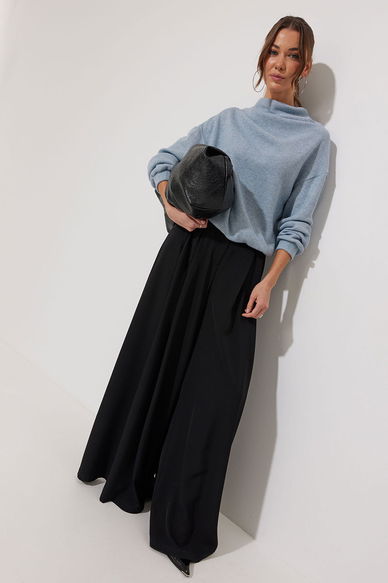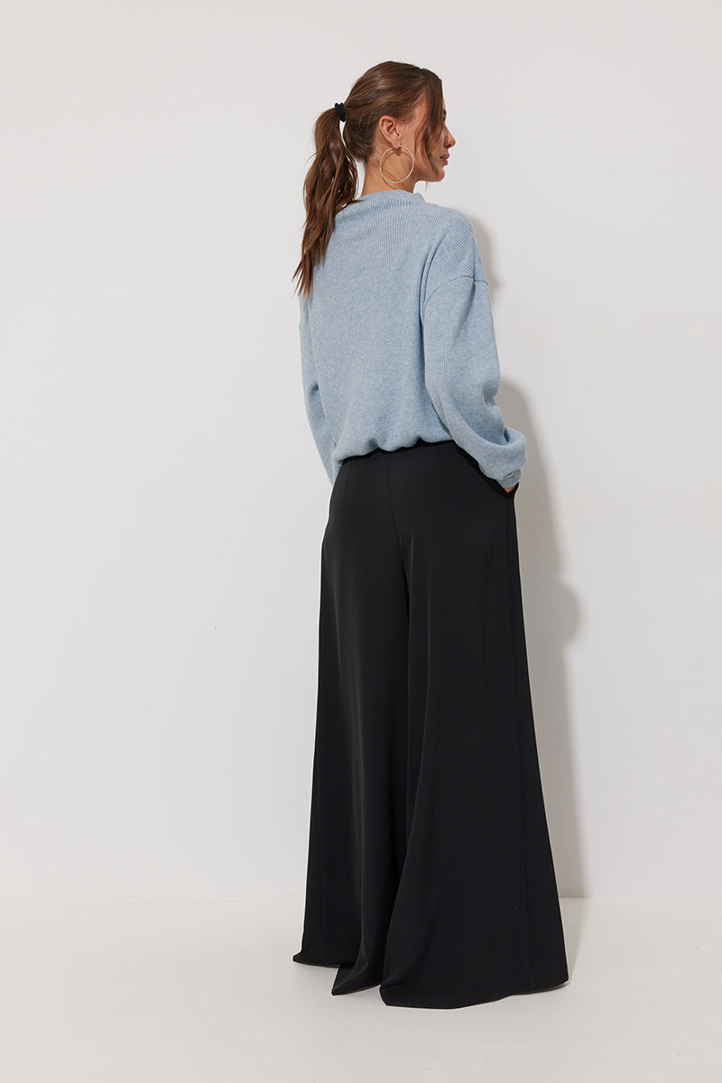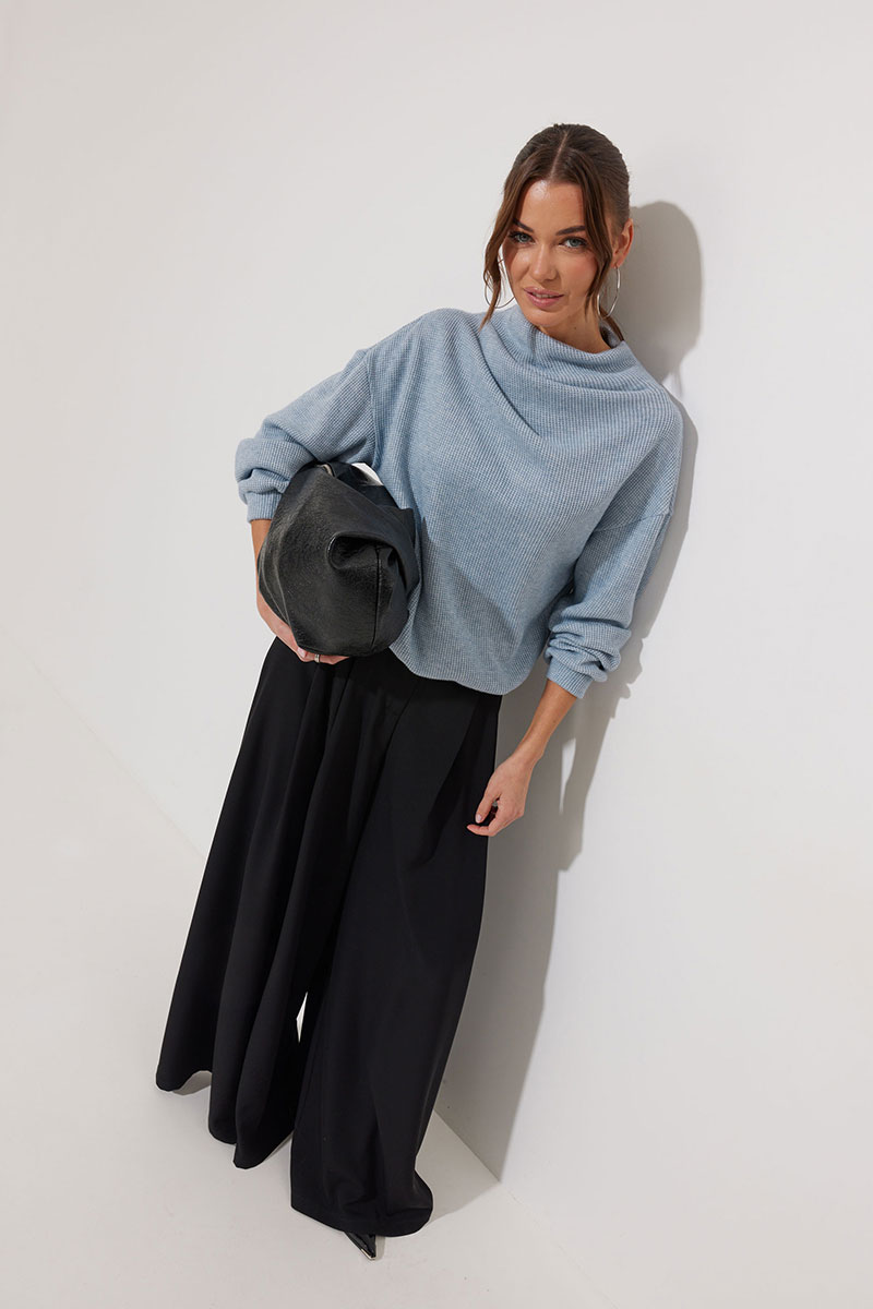 Джемпер из трикотажного полотна , прямого, слегка расширенного силуэта, со спущенной линией плеча. По горловине цельнокроеная стойка. На стойке и плече две складки. Рукав длинный с манжетой с резинкой. По низу джемпера пояс с резинкой.