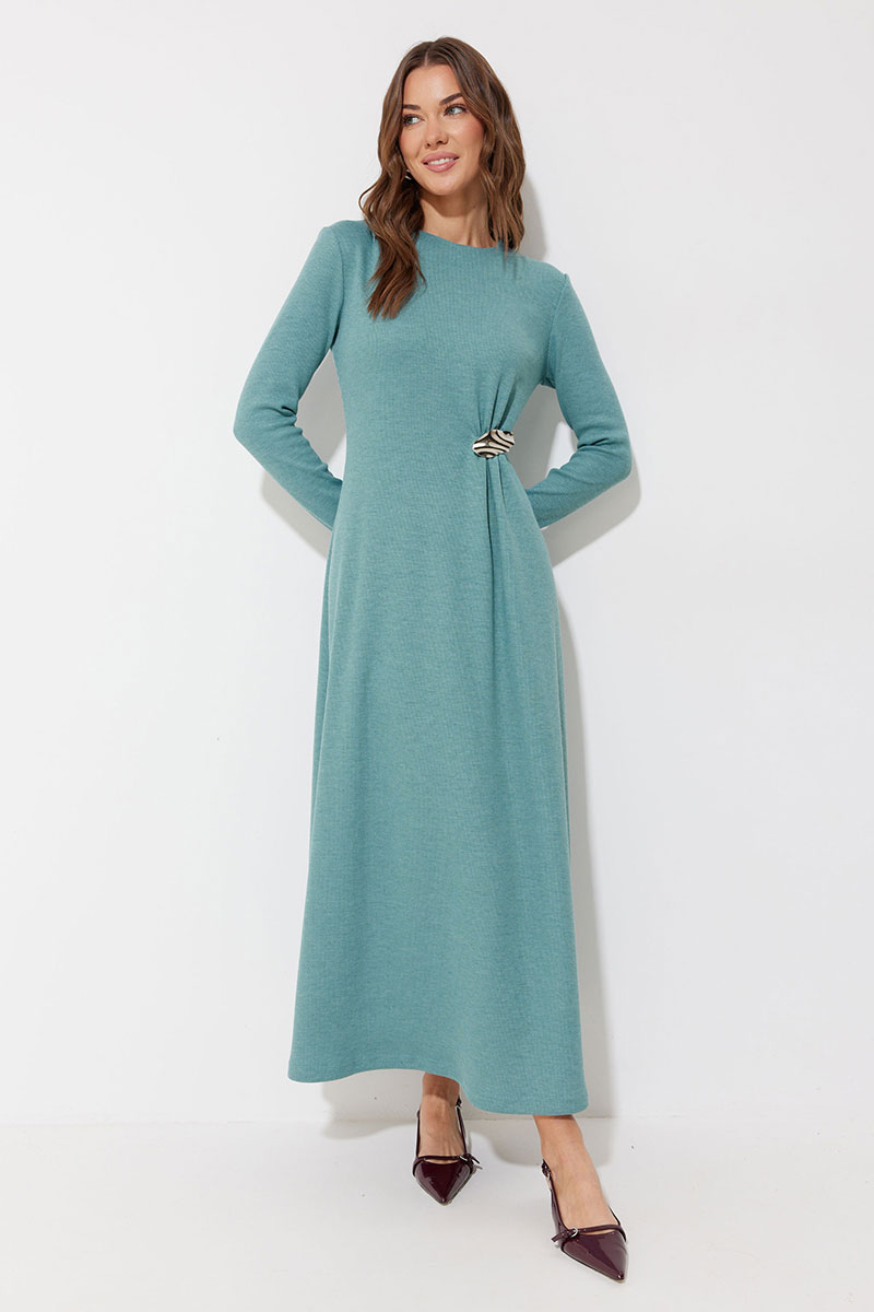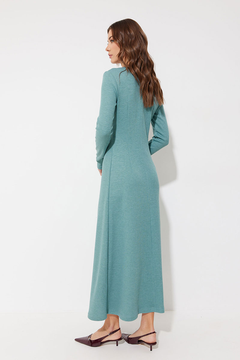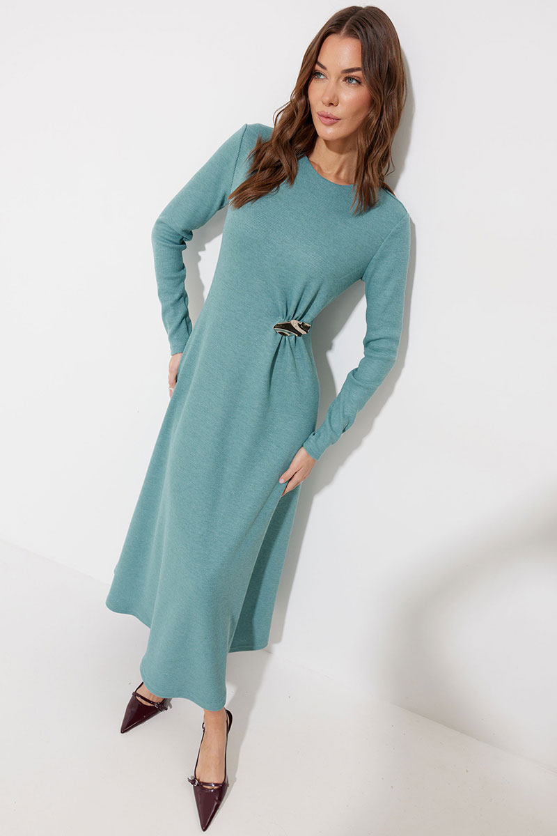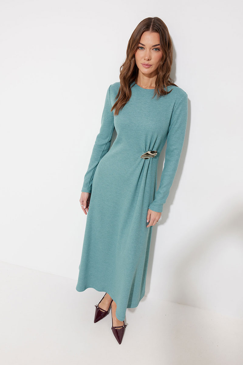 Платье из трикотажного полотна. Платье полуприлегающего силуэта с расширением по низу. Горловина овальной формы. Рукав втачной, длинный. На правом плече две складки. По переду, немного выше линии талии, по левому боку сборка. Шов сборки декорирован пришивным металлическим декором. Обращаем Ваше внимание, что декор может незначительно отличаться от фото. По среднему шву спинки вставлена потайная молния.