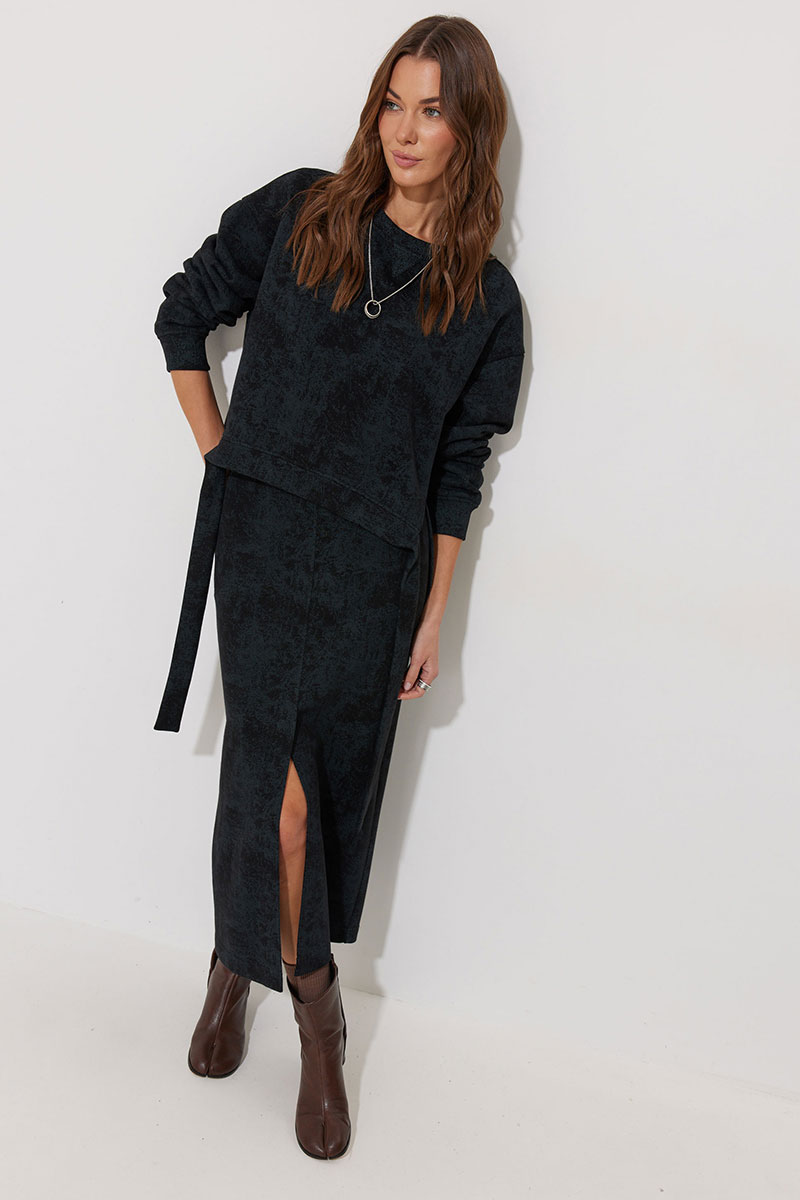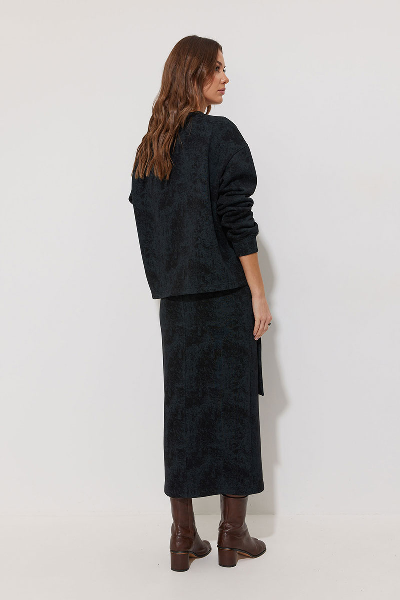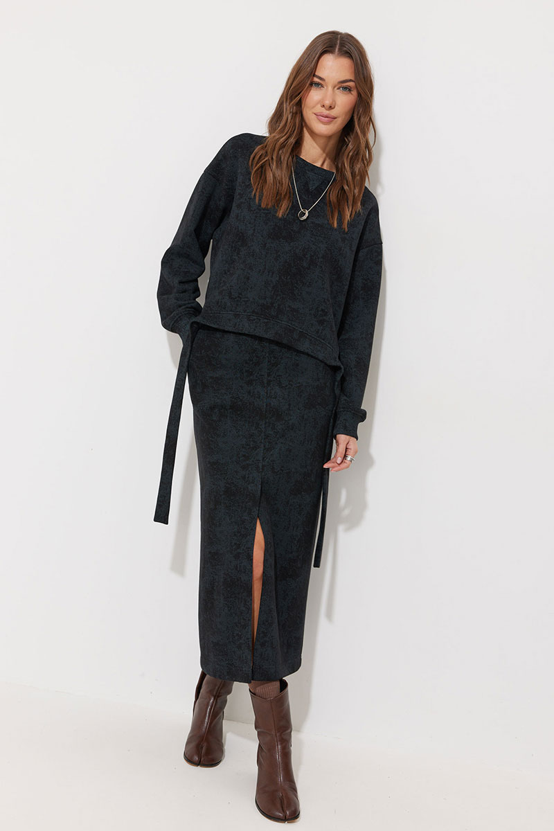 Юбка полуприлегающего силуэта из трикотажного полотна. По верху юбки притачной пояс с резинкой. По переду средний шов со шлицей и карманы. На заднем полотнище юбки накладные карманы.