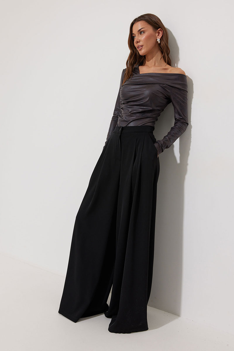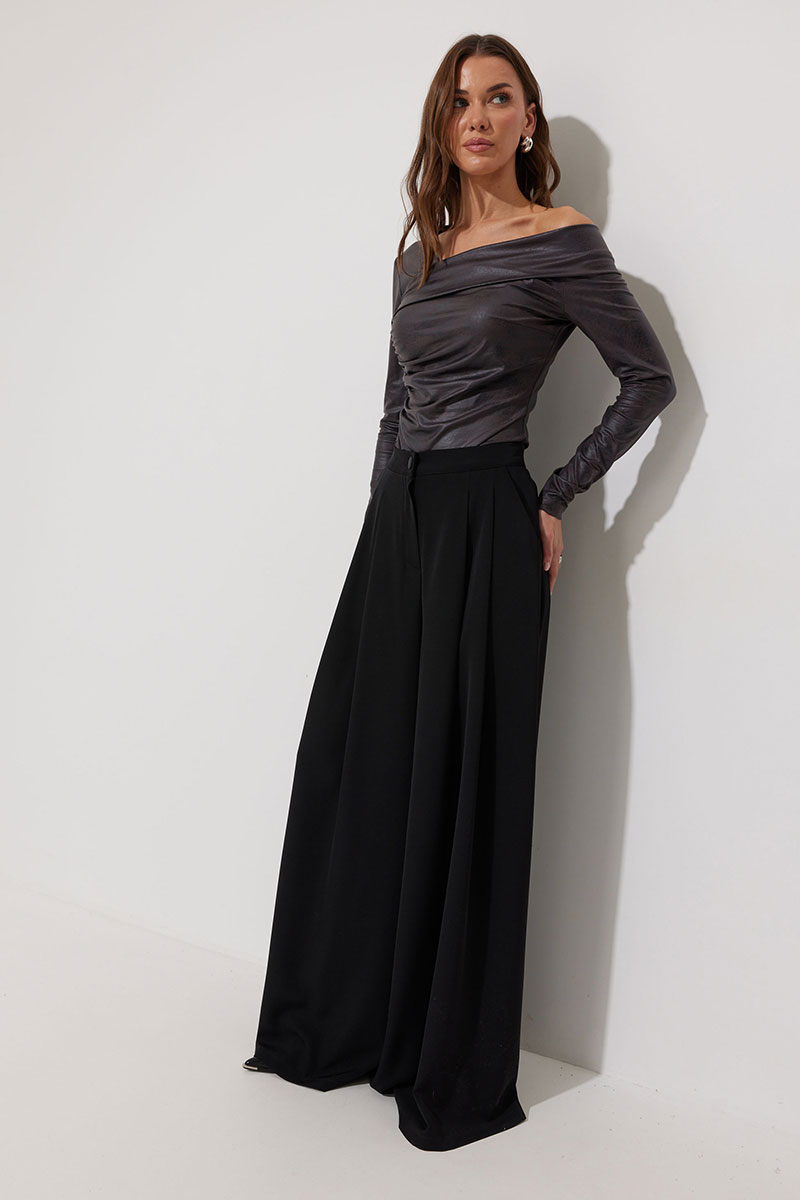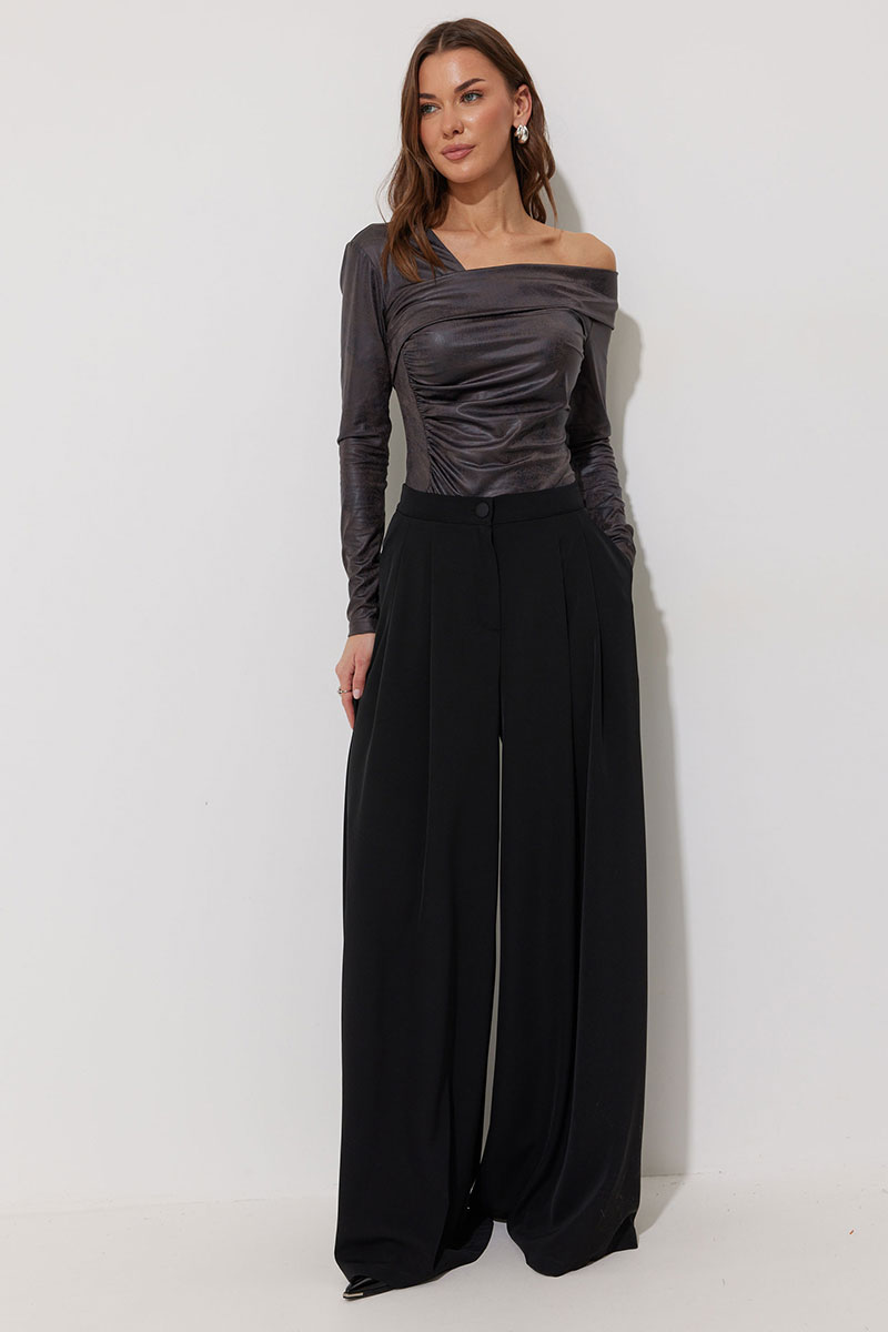 Ассиметричный джемпер  прилегающего силуэта из трикотажного полотна. Верхняя часть джемпера  с ассиметричным вырезом. Рукав одношовный втачной.  По переду нагрудная вытачка и рельеф со сборкой.