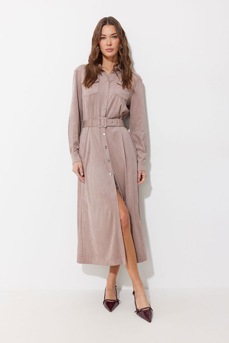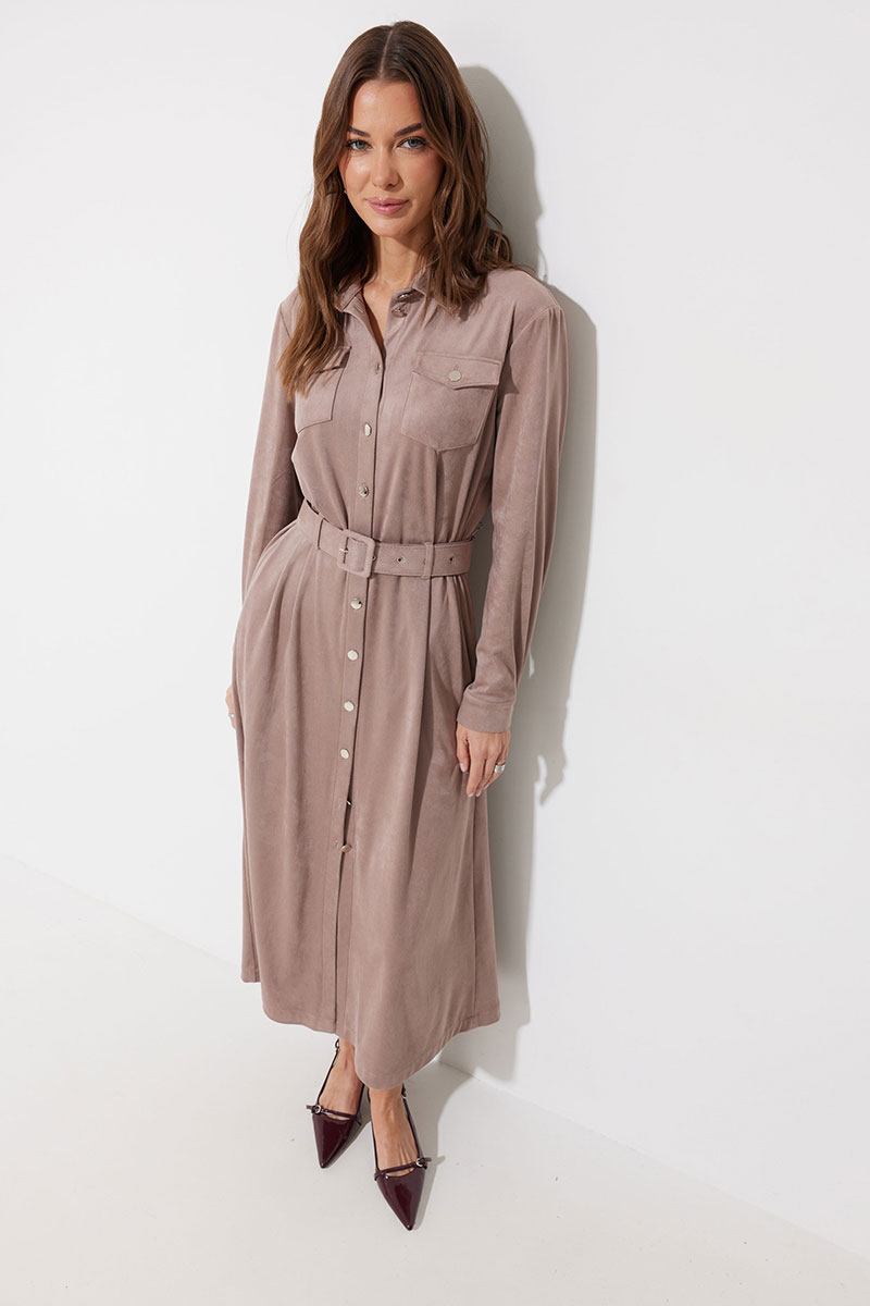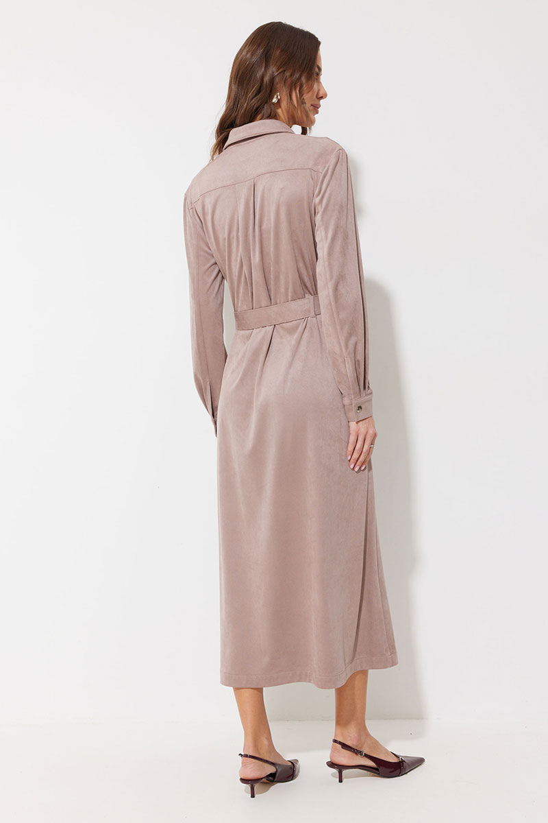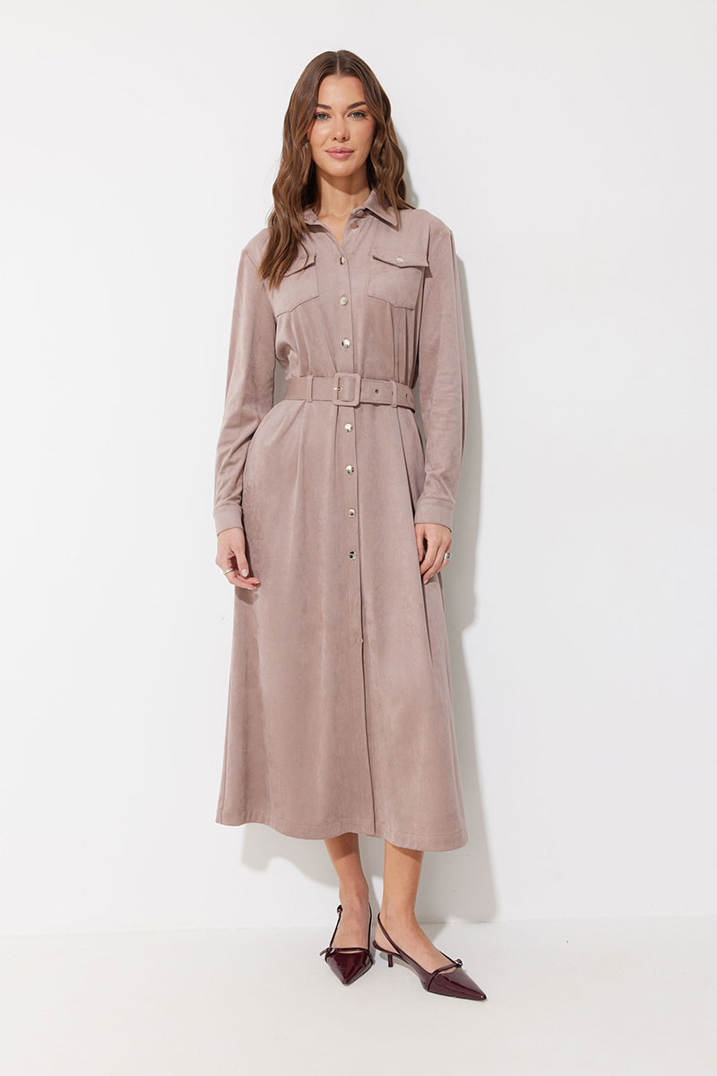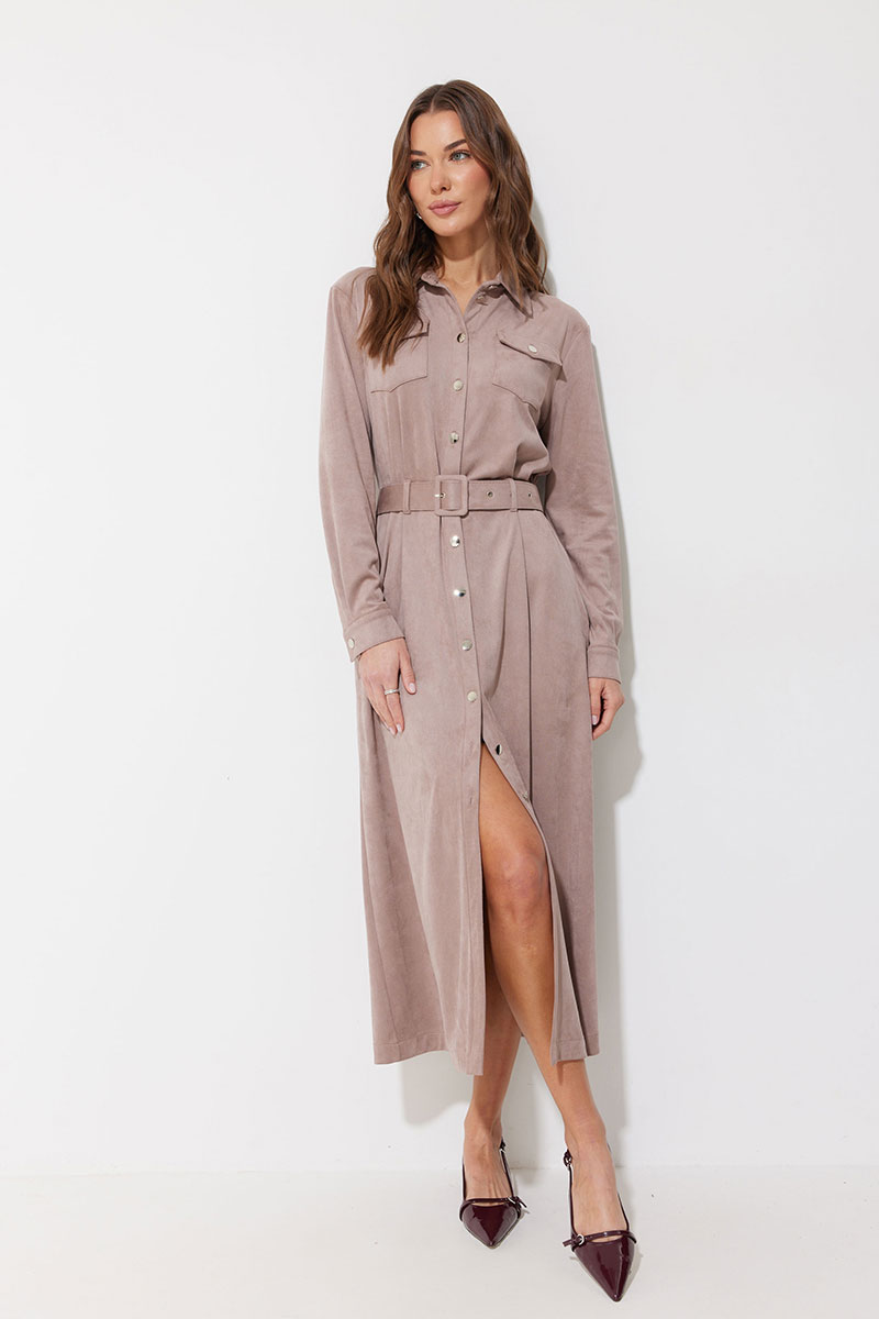 Платье-рубашка из трикотажного полотна «замша». Длина миди. Платье свободного кроя, с небольшим расширением к низу. С отложным воротником на отрезной стойке. Платье с центральной застежкой на петли и металлические пуговицы на ножке. По переду  на уровне груди накладные карманы  с клапанами, с застежкой на металлическую пуговицу на ножке. По спинке кокетка, бантовая складка, выходящая из-под кокетки. По переду и спинке на уровне линии талии настрочены шлевки. Рукав длинный, двухшовный,  с двумя складками по нижнему срезу, с манжетой с застежкой на металлическую пуговицу на ножке. По воротнику, манжетам, кокетке, локтевому шву выполнены отделочные строчки.  Платье дополняется съемным поясом с прямоугольной пряжкой. Пояс выполнен из основной ткани. Обращаем Ваше внимание, что фурнитура может незначительно отличаться от фото.