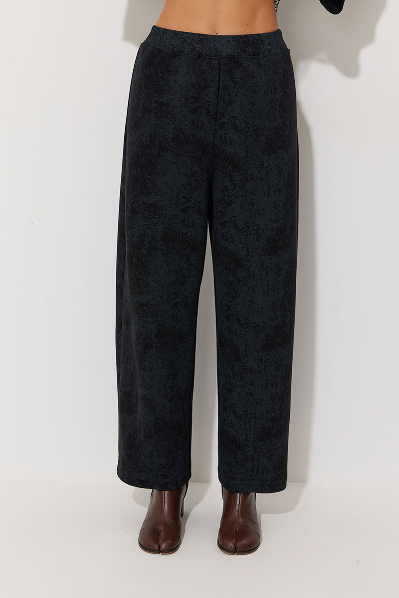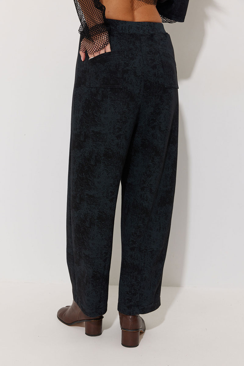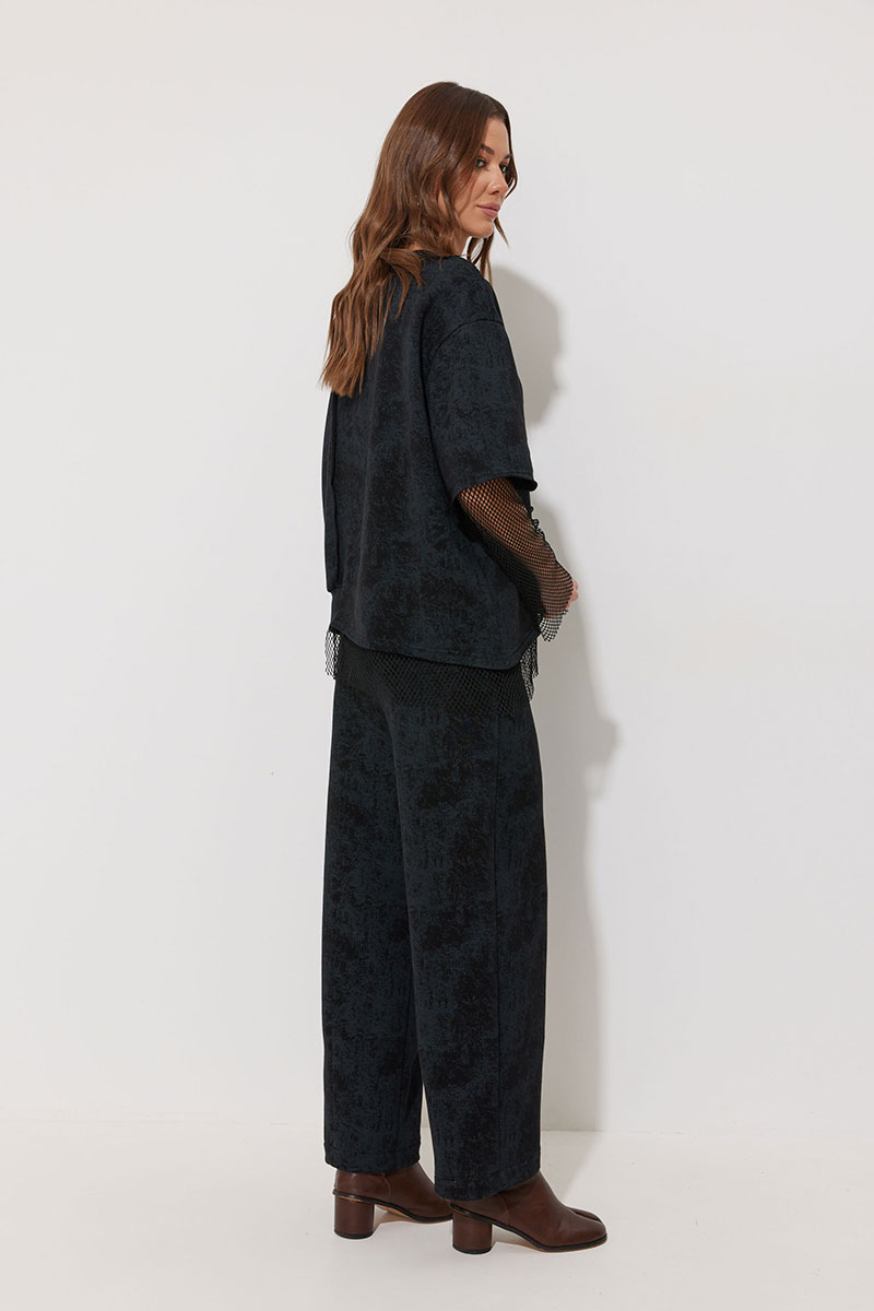 Брюки прямого силуэта зауженные книзу из трикотажного полотна. По верху брюк притачной пояс, по переду имитация гульфика. На передних и задних половинках брюк по низу вытачки. На задних половинках брюк накладные карманы.
