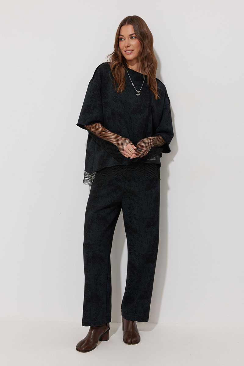 Ассиметричный джемпер прямого силуэта из трикотажного полотна комбинированного сеткой. Горловина округлая. Рукав со спущенной линией плеча двойной. По переду и спинке декоративный шов, по низу пояс с нашивкой . По низу джемпера и рукава декоративная сетка.