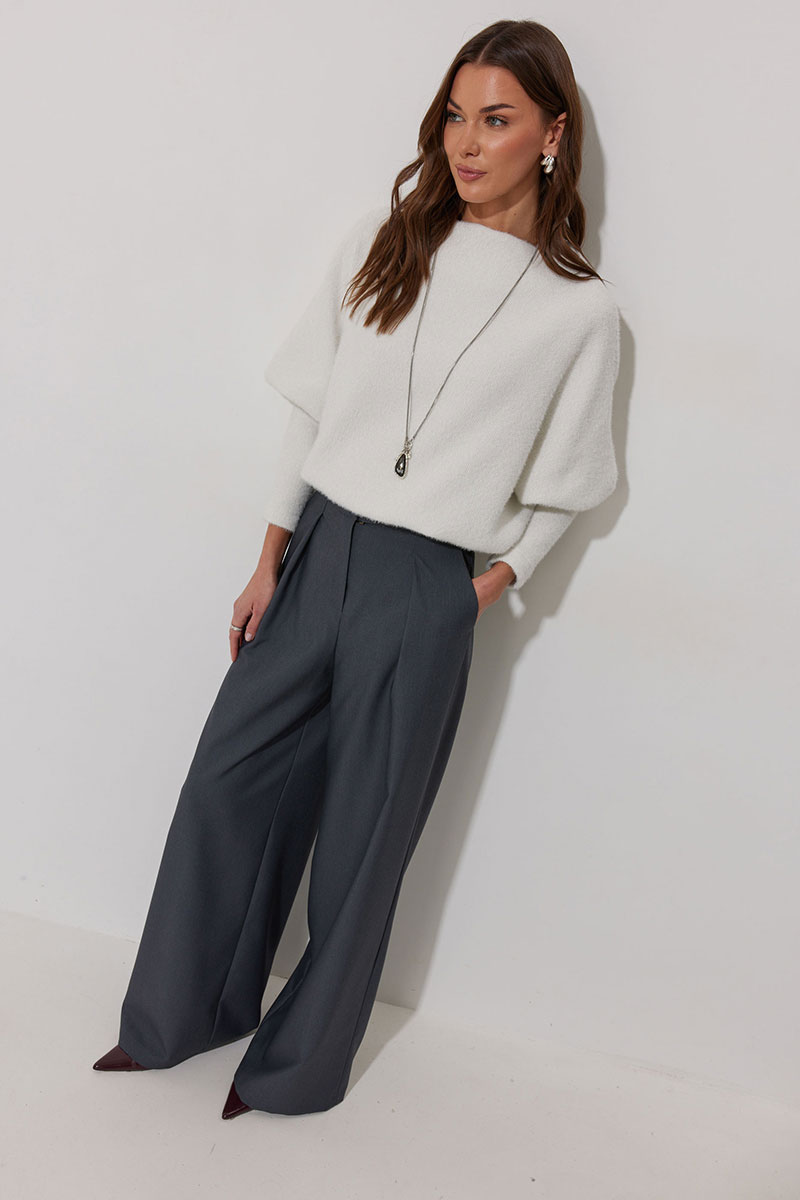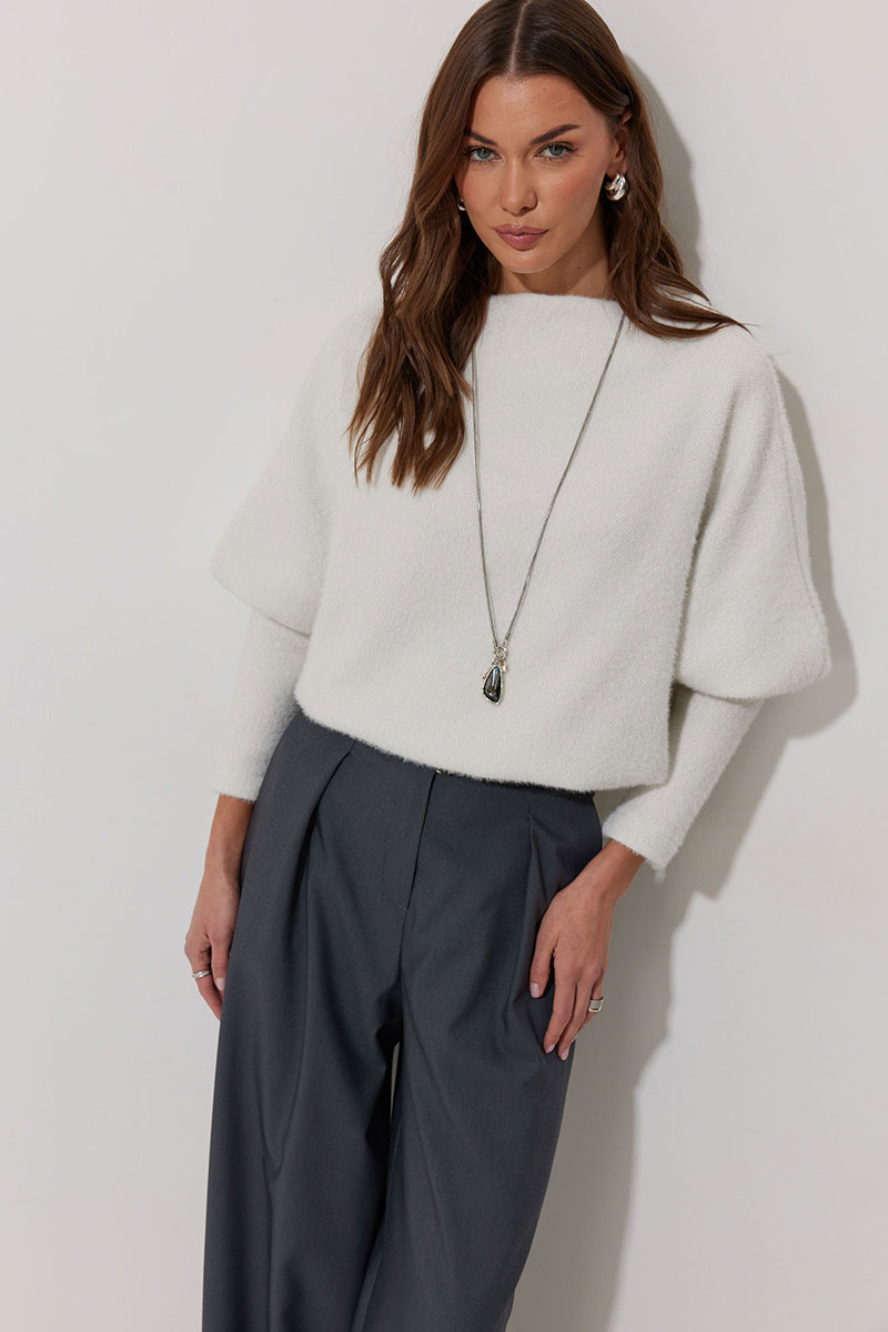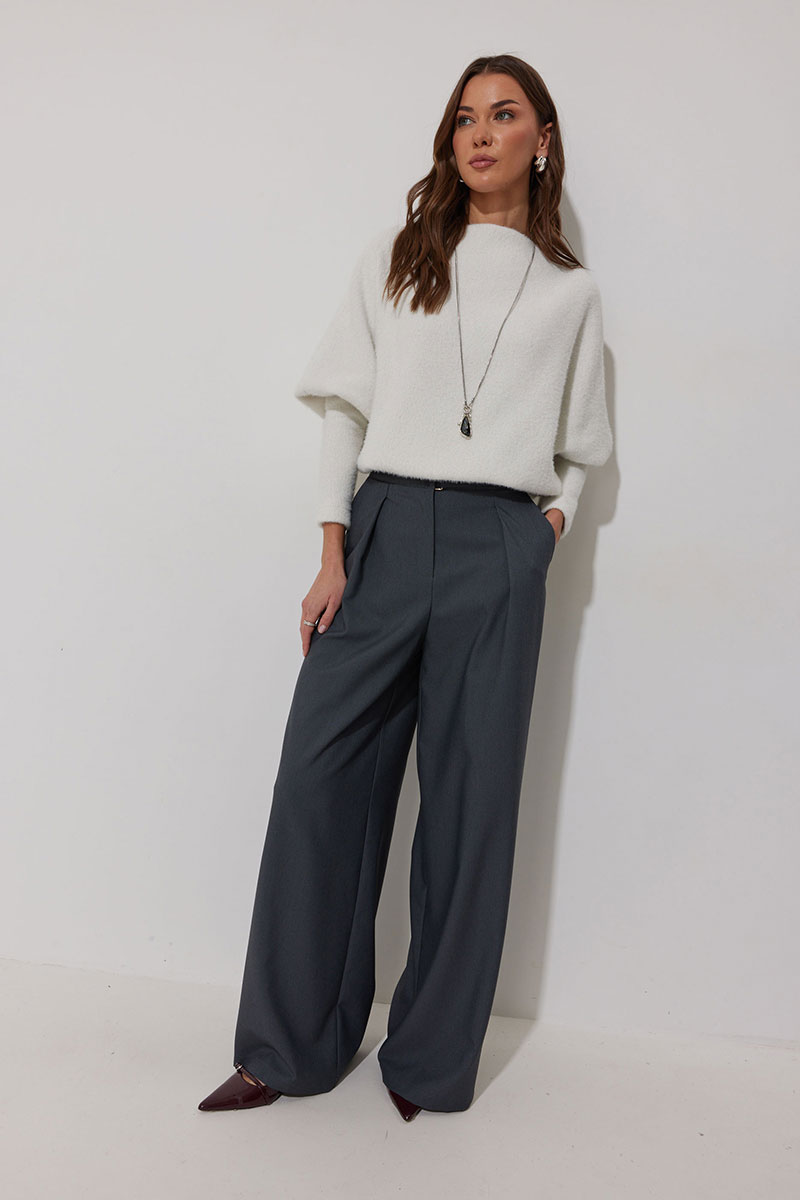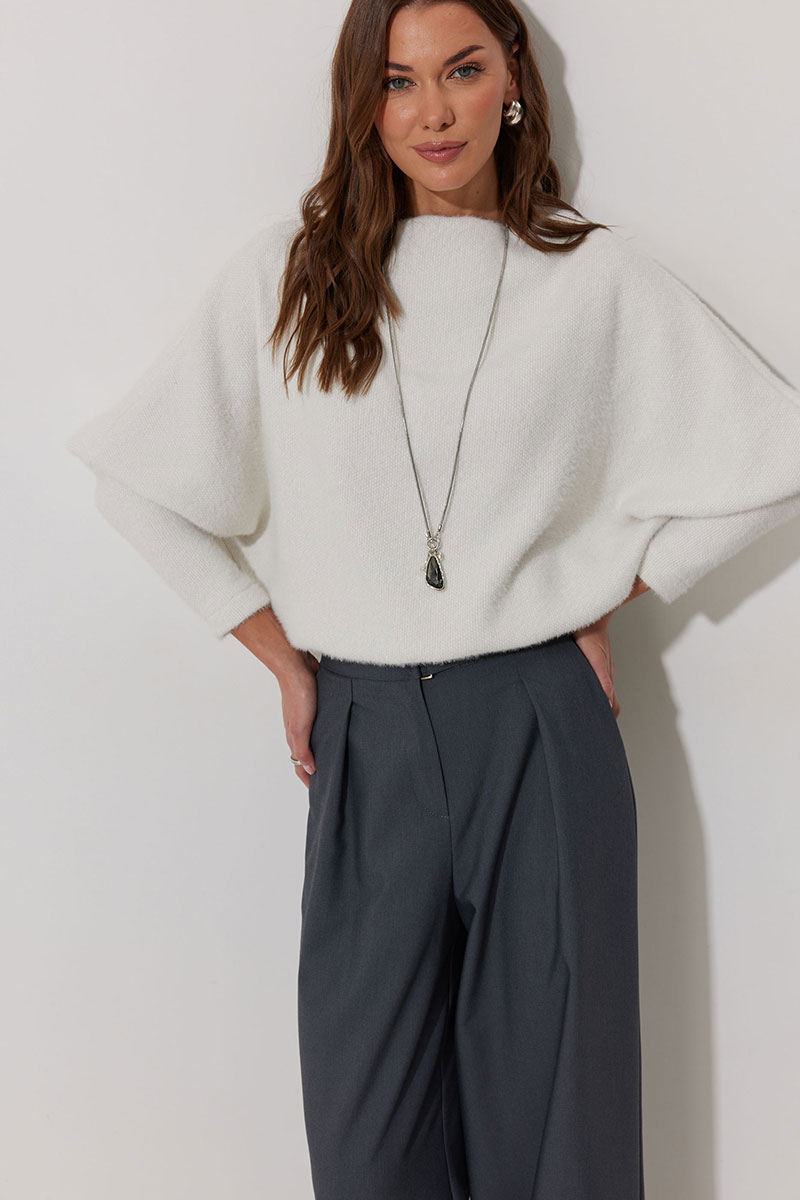 Джемпер полуприлегающего силуэта из трикотажного полотна. Горловина - цельнокроеная стойка. Рукав цельнокроеный, с подрезом ниже локтя и узкой длинной манжетой. По низу джемпера – притачная планка.