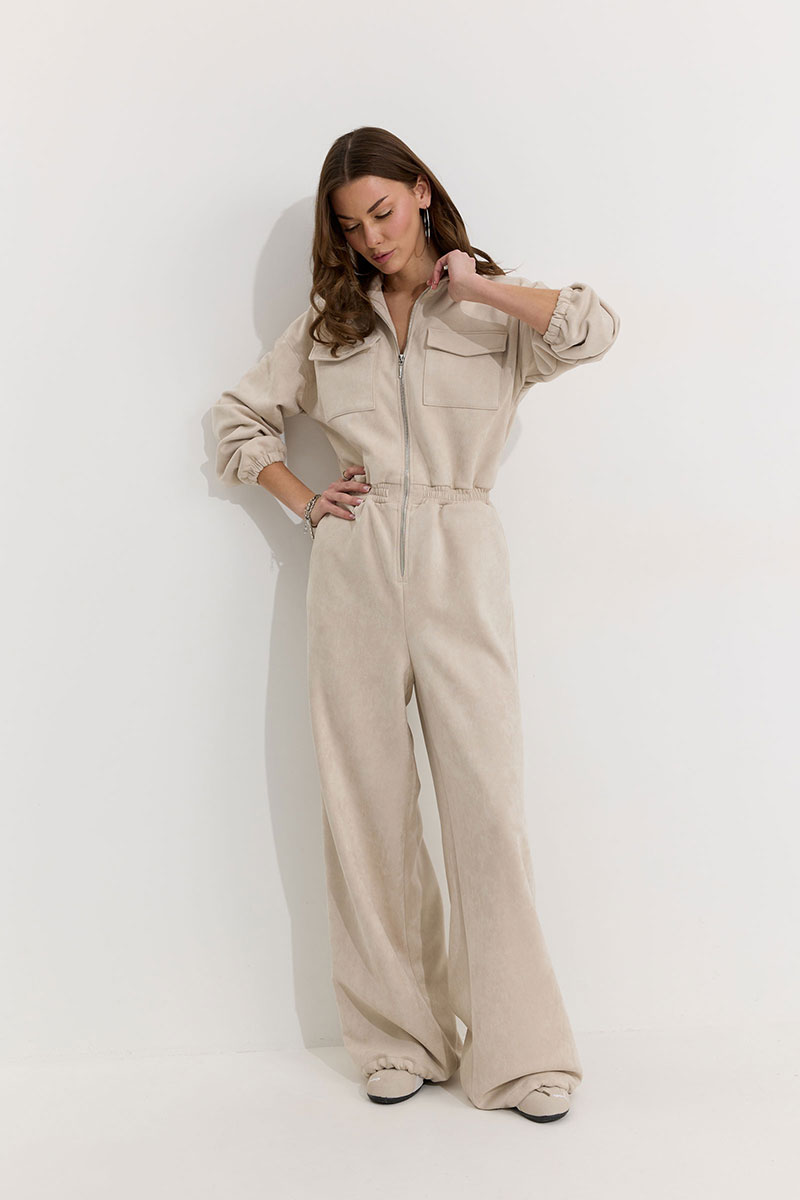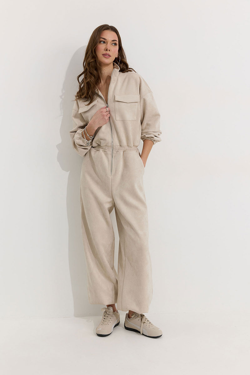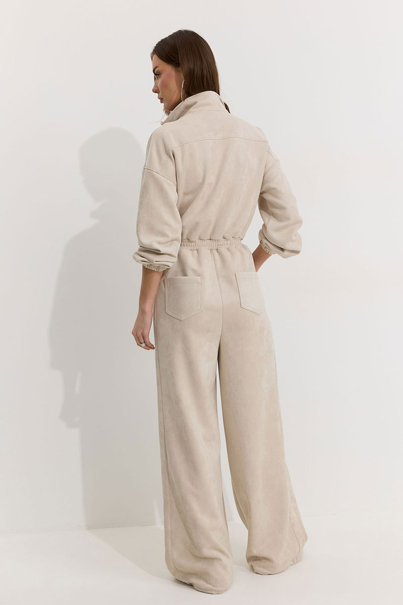 Комбинезон полуприлегающего силуэта с расширенными книзу брюками из трикотажного полотна “замша”. Горловина-стойка, по центру застежка на молнию. Рукав со спущенной линией плеча, по низу эластичная тесьма(резинка). По переду и спинке в районе талии притачной пояс, в пояс вставлена эластичная тесьма(резинка). По переду накладные карманы с клапанами. Брюки прямого силуэта, по переду и спинке карманы. По низу брюк предусмотрена кулиса с завязкой для регулирования степени прилегания. Обращаем ваше внимание, что фурнитура может отличаться от фото.