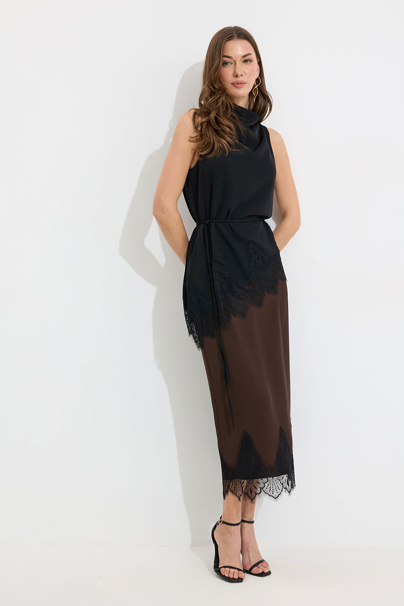 Юбка прямого силуэта из струящейся ткани. По верху юбки притачной пояс с резинкой по задней половинке пояса от бокового шва до вытачки. В центральном шве потайная молния, по низу разрез. По низу юбки декоративная тесьма( кружево). Обращаем ваше внимание, что фурнитура может отличаться от фото.