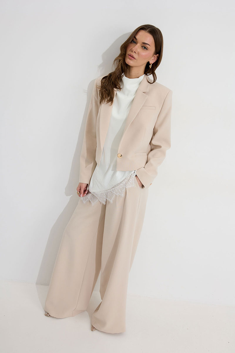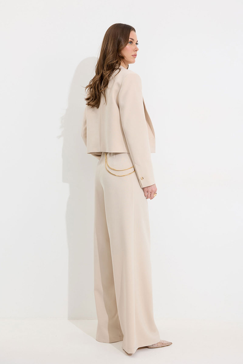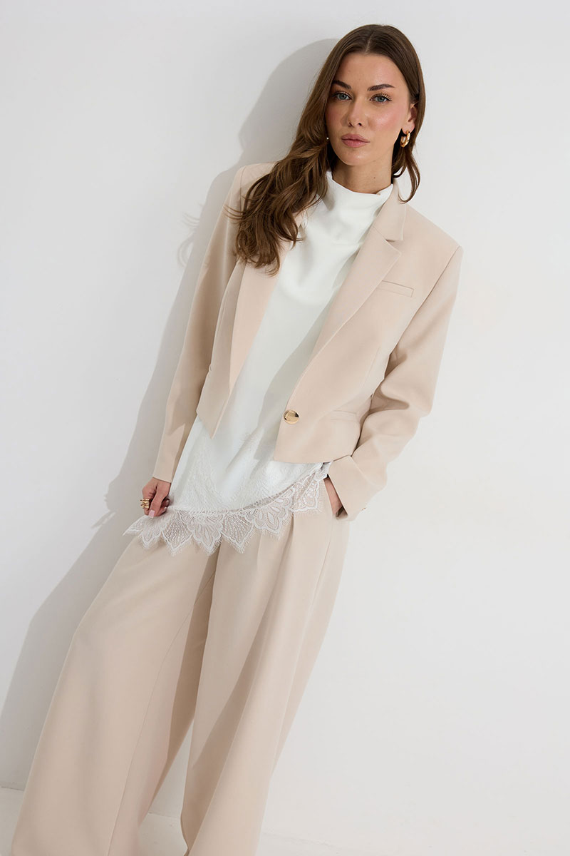 Жакет из поливискозной ткани. Полуприлегающего силуэта, линия плеча немного расширена. Жакет укороченный. С отложным воротником и лацканами. По переду застежка на петлю и пуговицу. По