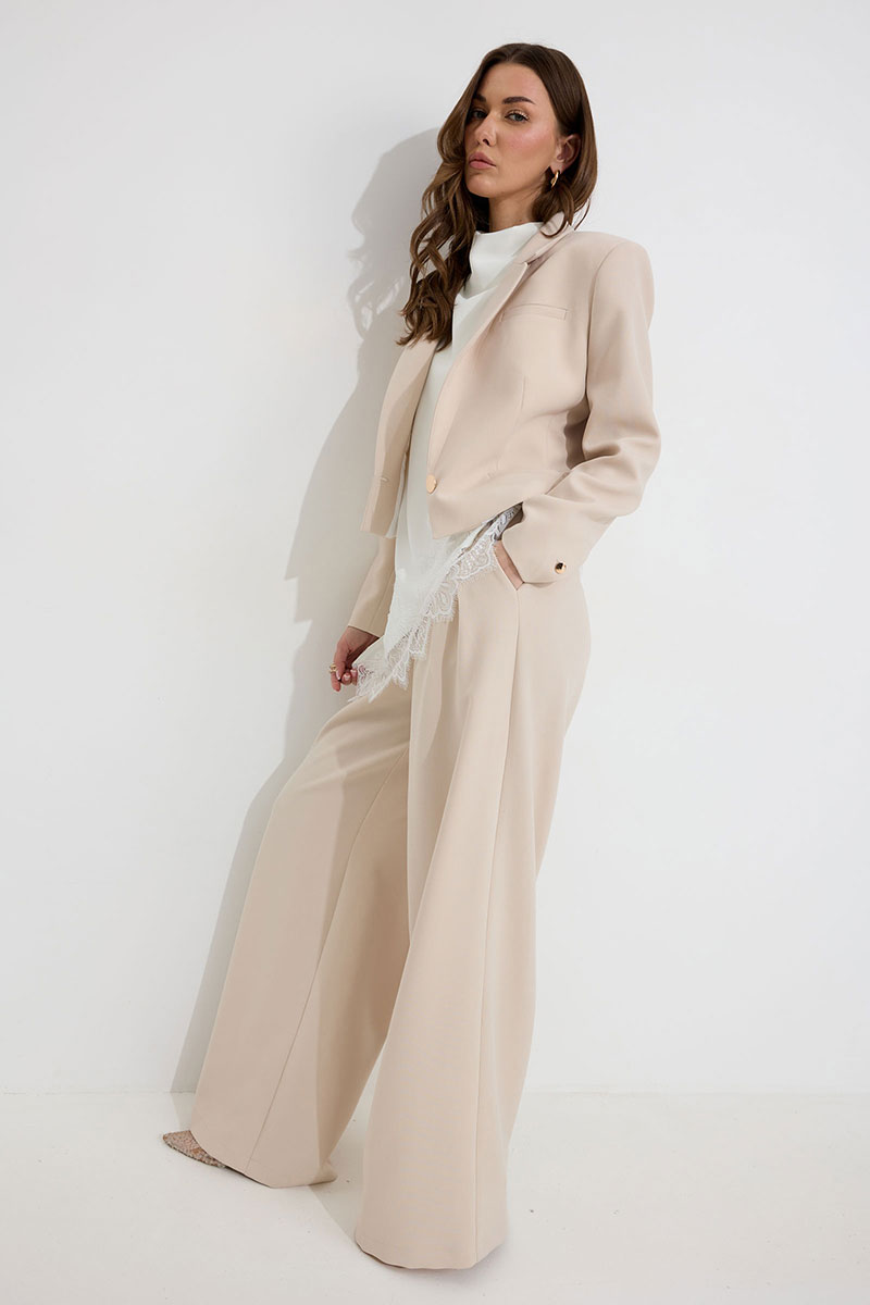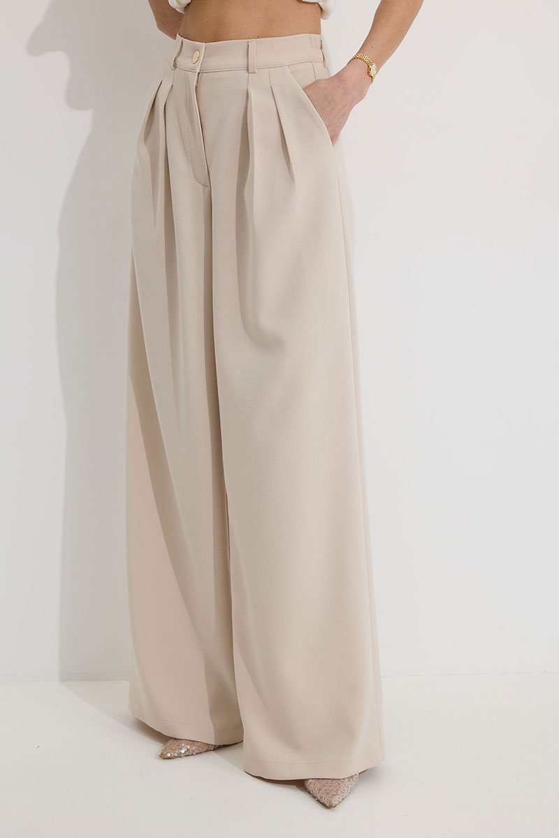 Брюки из поливискозной ткани, прямого, расширенного силуэта. На передних половинах брюк по две складки, выходящих из-под пояса, складки застрочены на несколько сантиметров. По переду