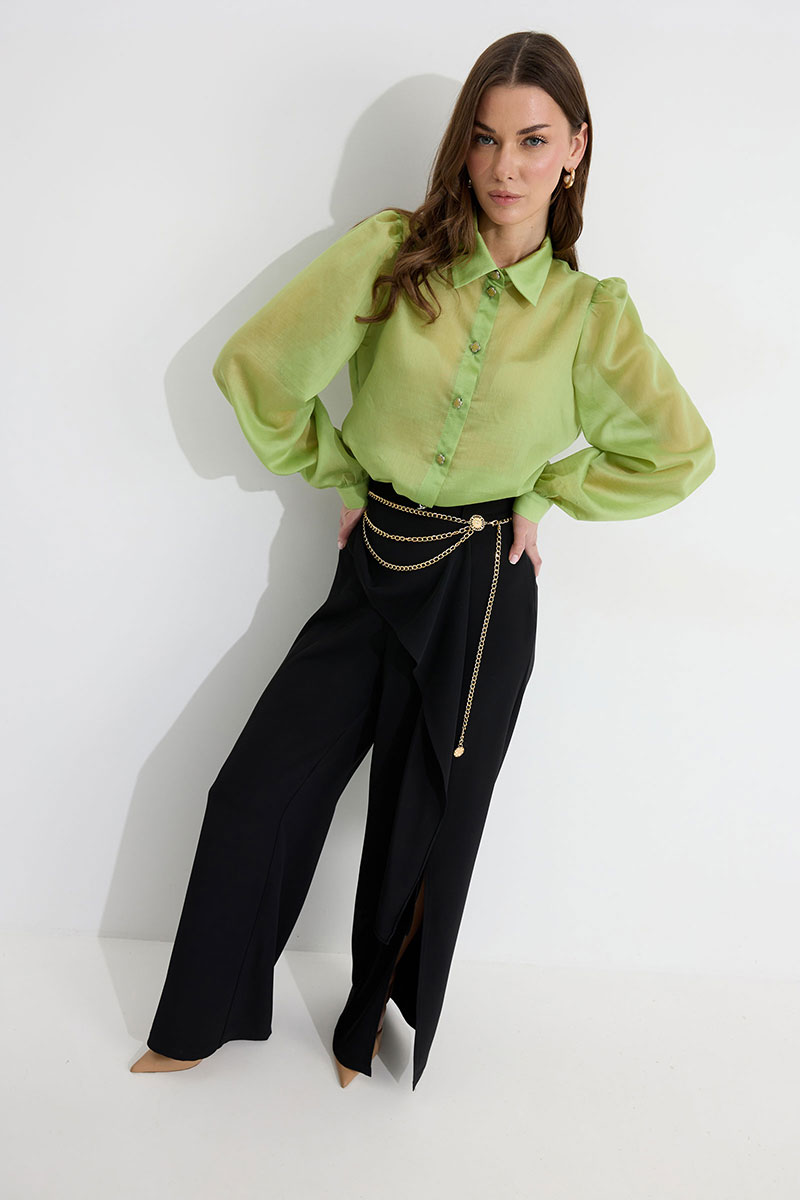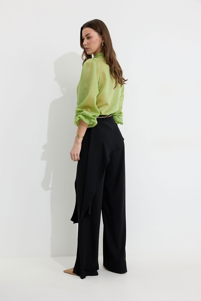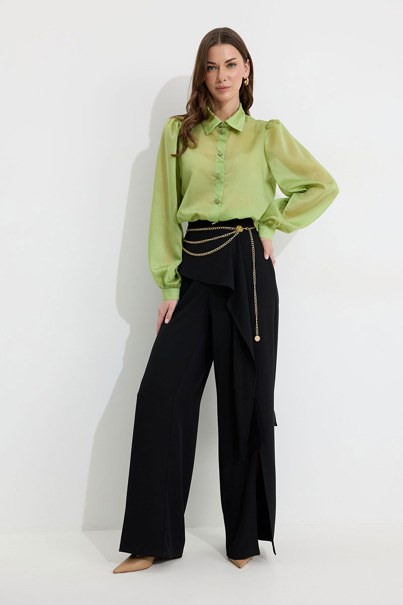 Брюки прямого силуэта из костюмной ткани. По верху брюк притачной пояс со шлевками для ремня. По переду и спинке декоративная отлетная деталь. На левой передней половинке брюк разрез . В левом боковом шве потайная молния. По задним половинкам брюк на поясе резинка от вытачки до вытачки. Обращаем ваше внимание, что фурнитура может отличаться от фото. !Декоративный пояс в комплект не входит !