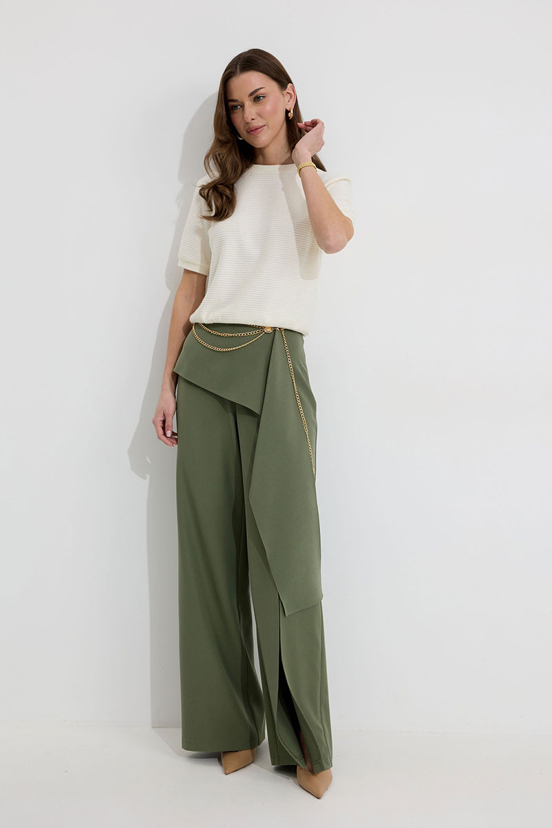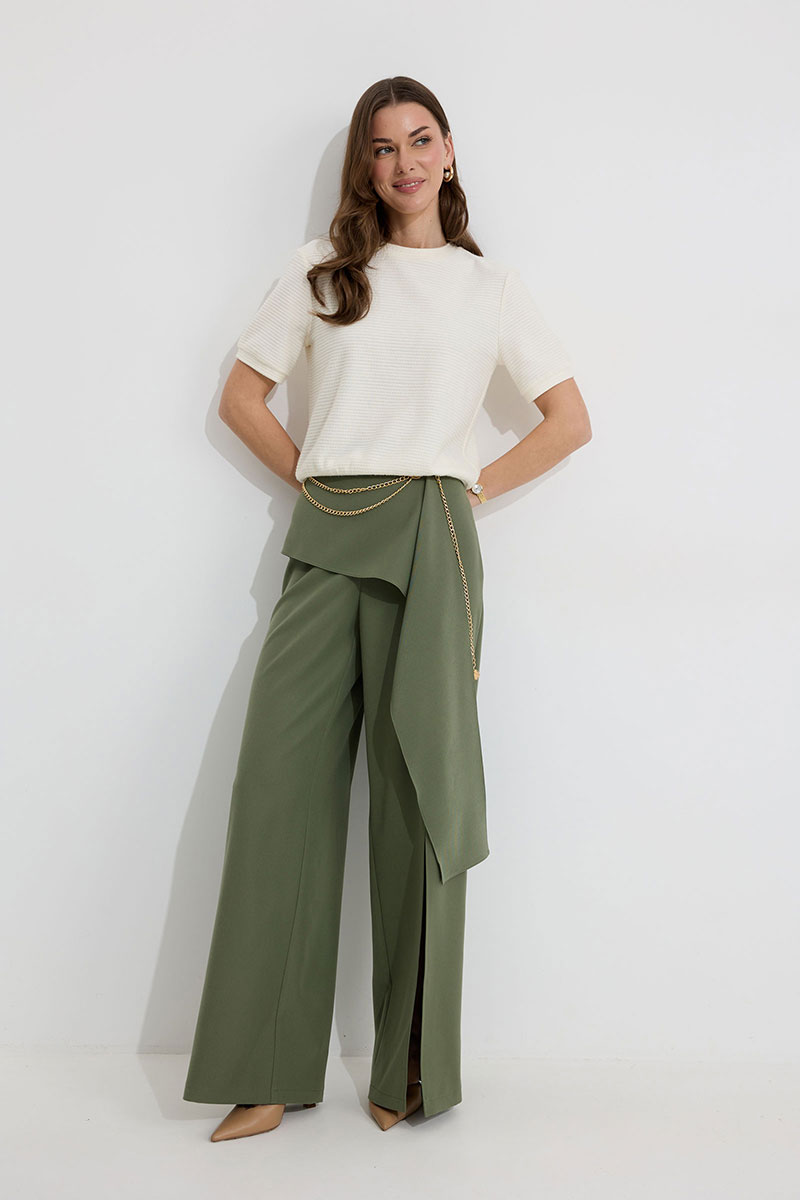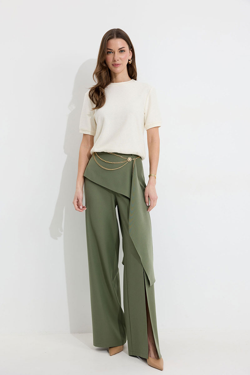 Брюки прямого силуэта из костюмной ткани. По верху брюк притачной пояс со шлевками для ремня. По переду и спинке декоративная отлетная деталь. На левой передней половинке брюк разрез . В левом боковом шве потайная молния. По задним половинкам брюк на поясе резинка от вытачки до вытачки. Обращаем ваше внимание, что фурнитура может отличаться от фото. !Декоративный пояс в комплект не входит !