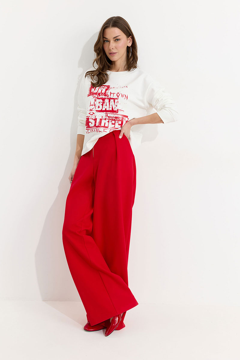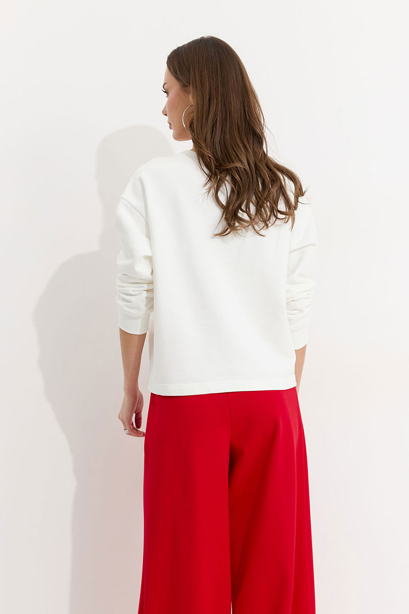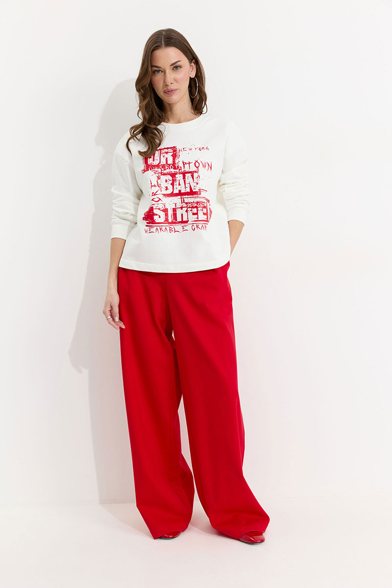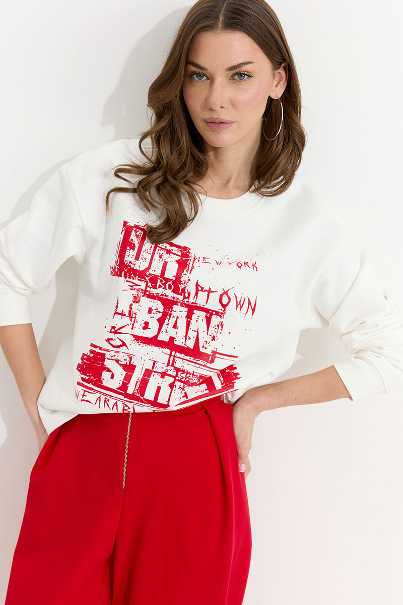Джемпер прямого силуэта из трикотажного полотна. Горловина округлая. Рукав со спущенной линией плеча, по низу манжета. По переду дизайнерская печать.