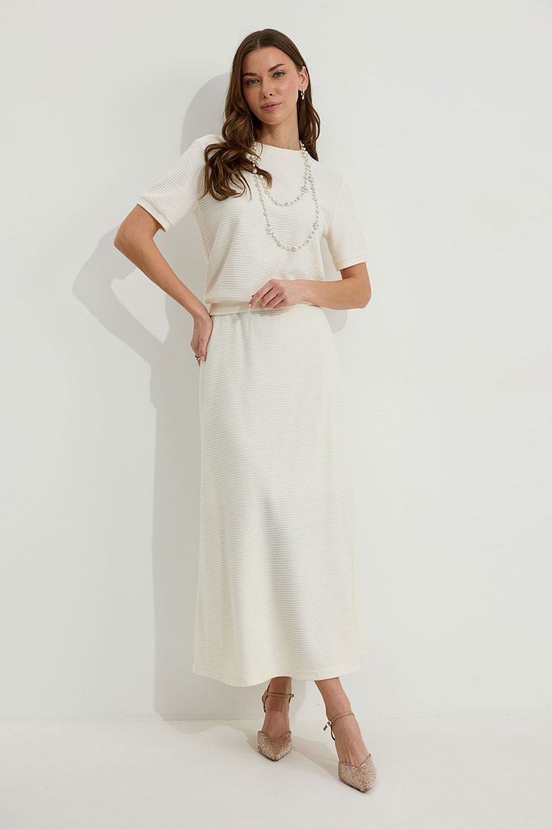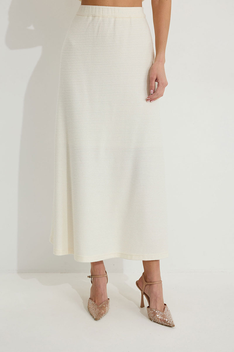 Юбка А-силуэта расширенная книзу из трикотажного полотна. По верху юбки притачной пояс с эластичной тесьмой (резинкой).