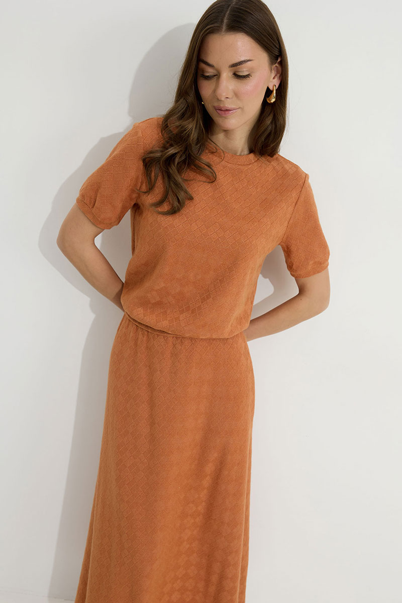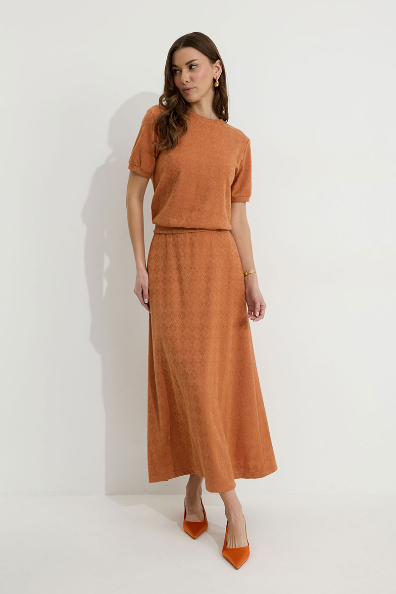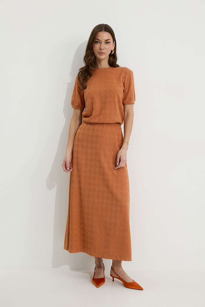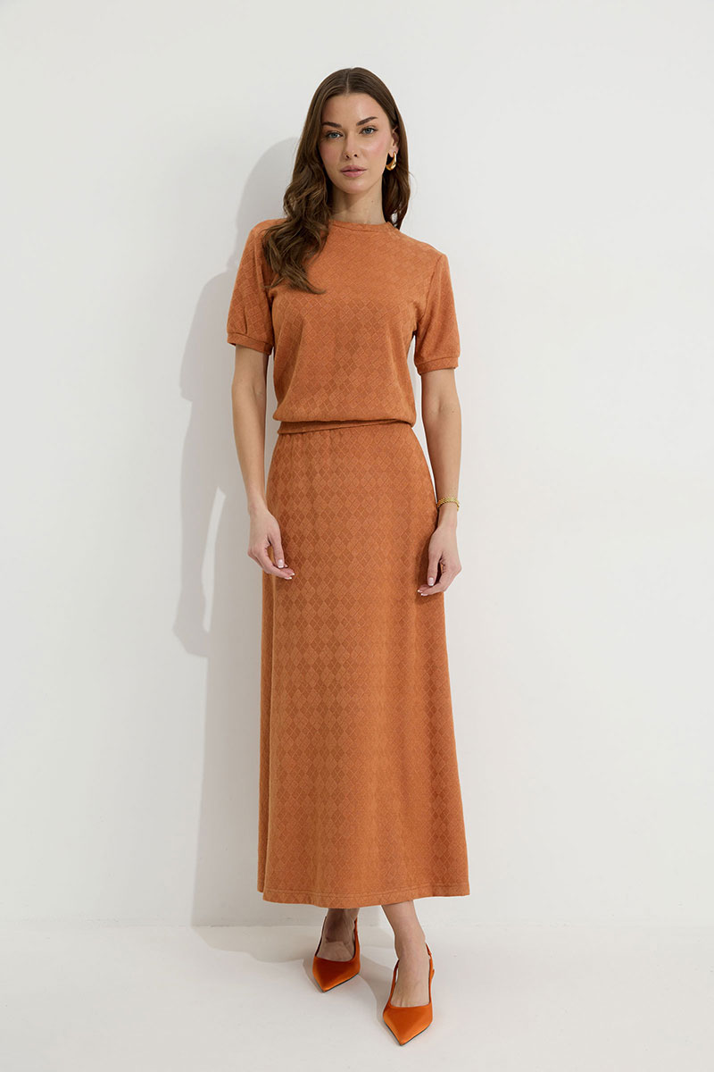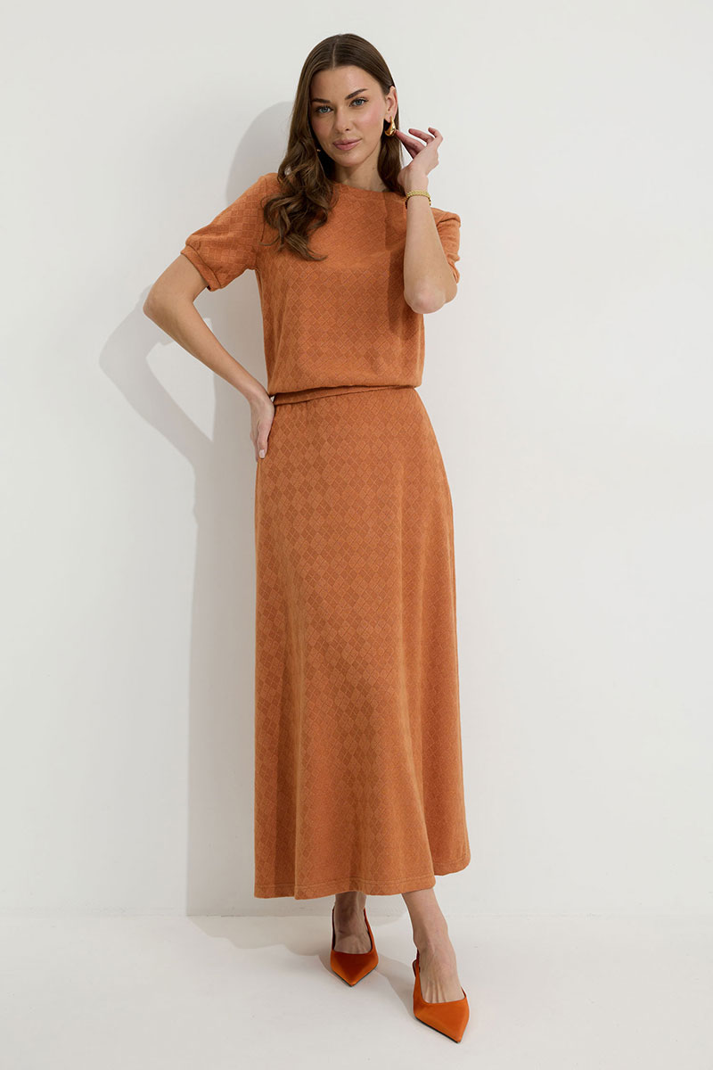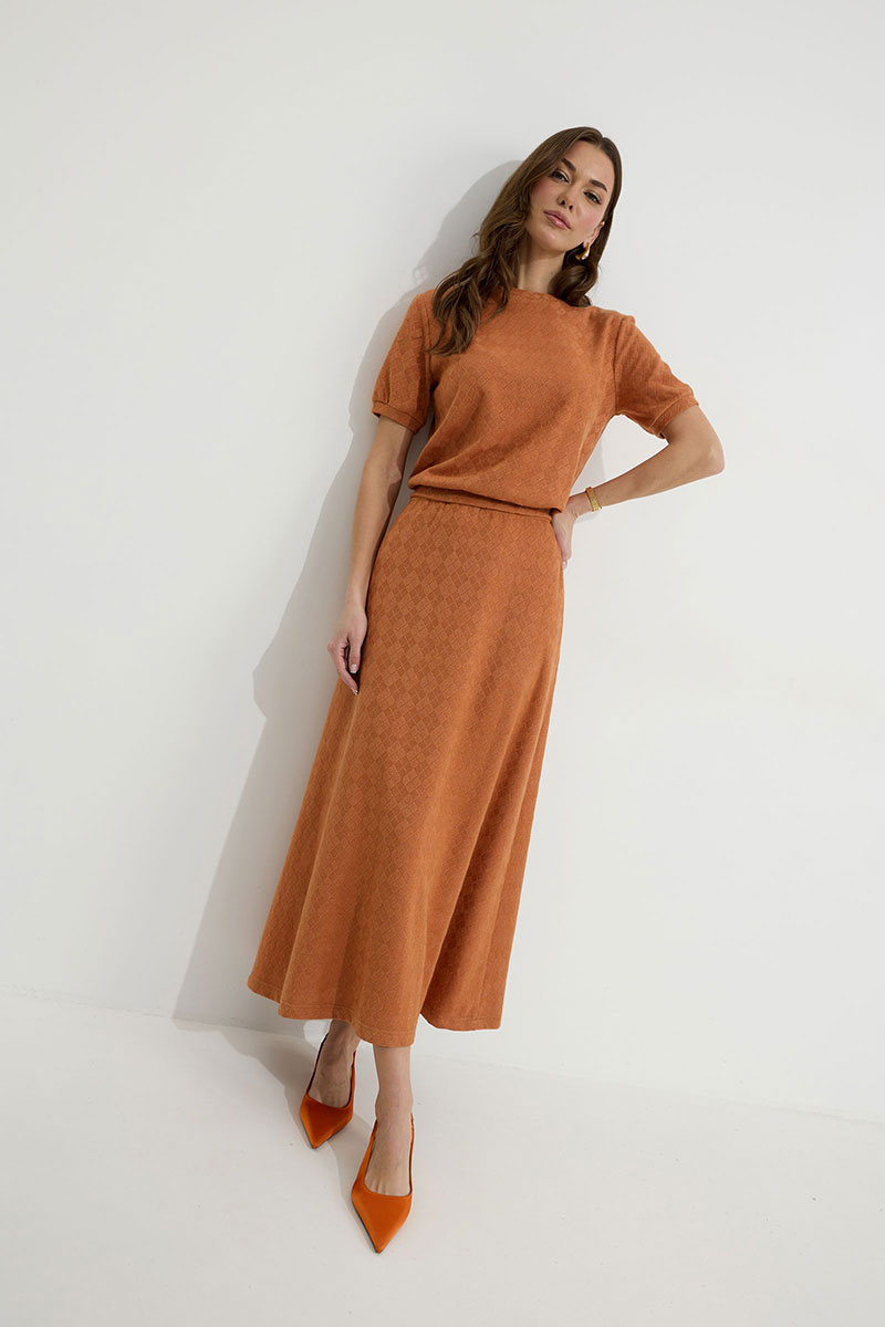 Юбка А-силуэта расширенная книзу из трикотажного полотна. По верху юбки притачной пояс с эластичной тесьмой (резинкой).