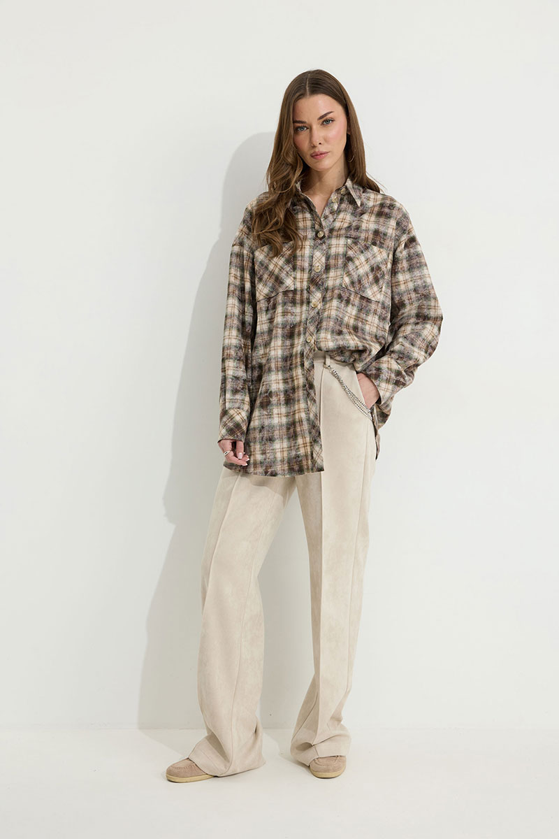 Брюки прямого силуэта из трикотажного полотна “замша”. По верху притачной пояс с застежкой на петлю и пуговицу и шлевками для ремня. На передних половинках обработаны карманы, канты и застежка молния в среднем шве, на задних – вытачки. По поясу задних половинок брюк эластичная тесьма (резинка). Обращаем ваше внимание, что фурнитура может отличаться от фото. Декоративный элемент - цепочка в комплектацию не входит.